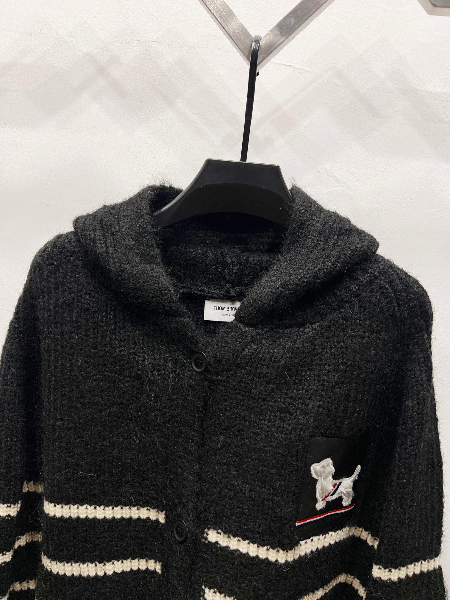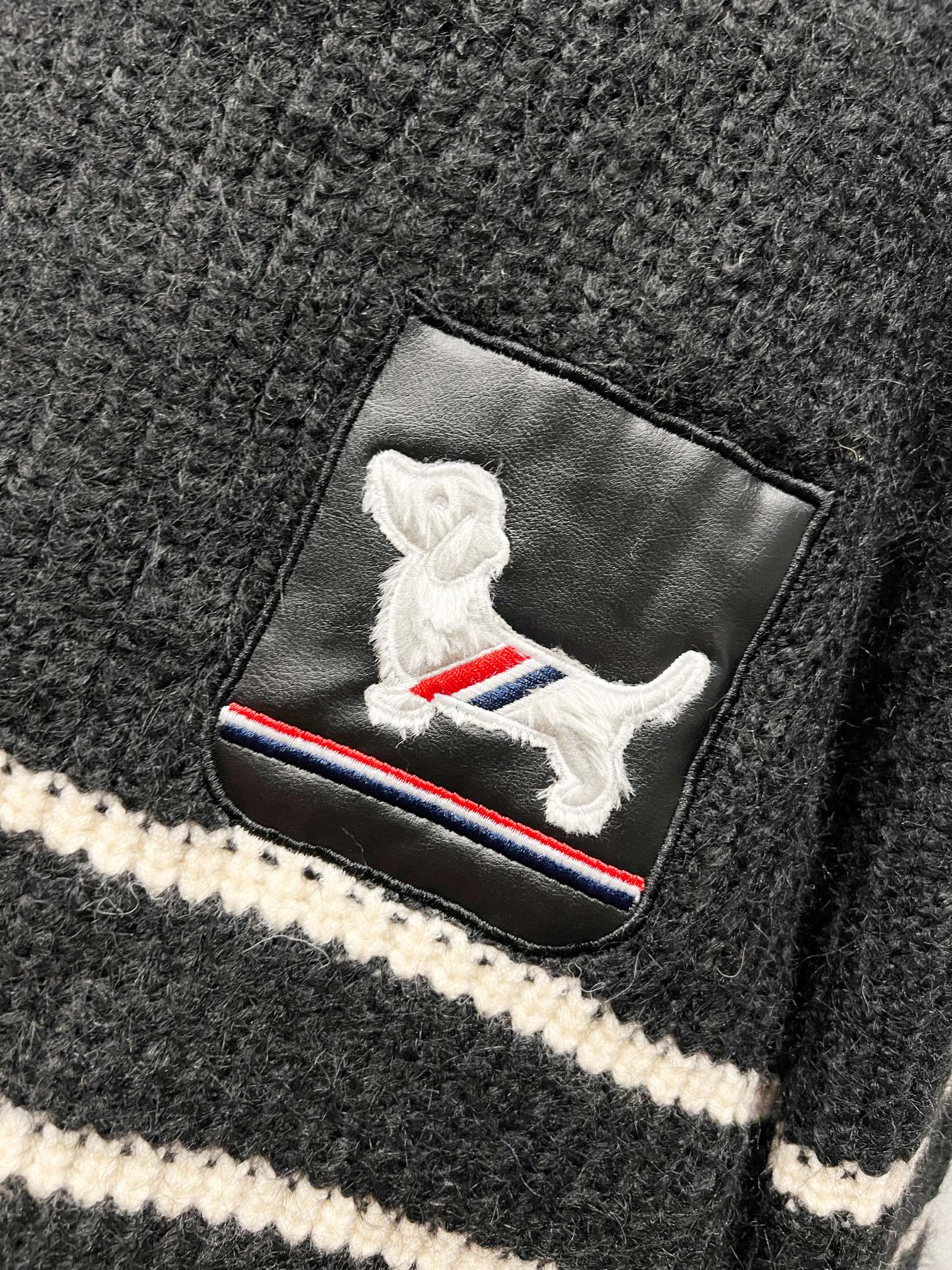 THOM BROWNE 汤姆布朗 TB 23ss 胸前经典贴皮腊肠狗提花条纹四道杠羊毛针织毛衣连帽外套 顶级版本