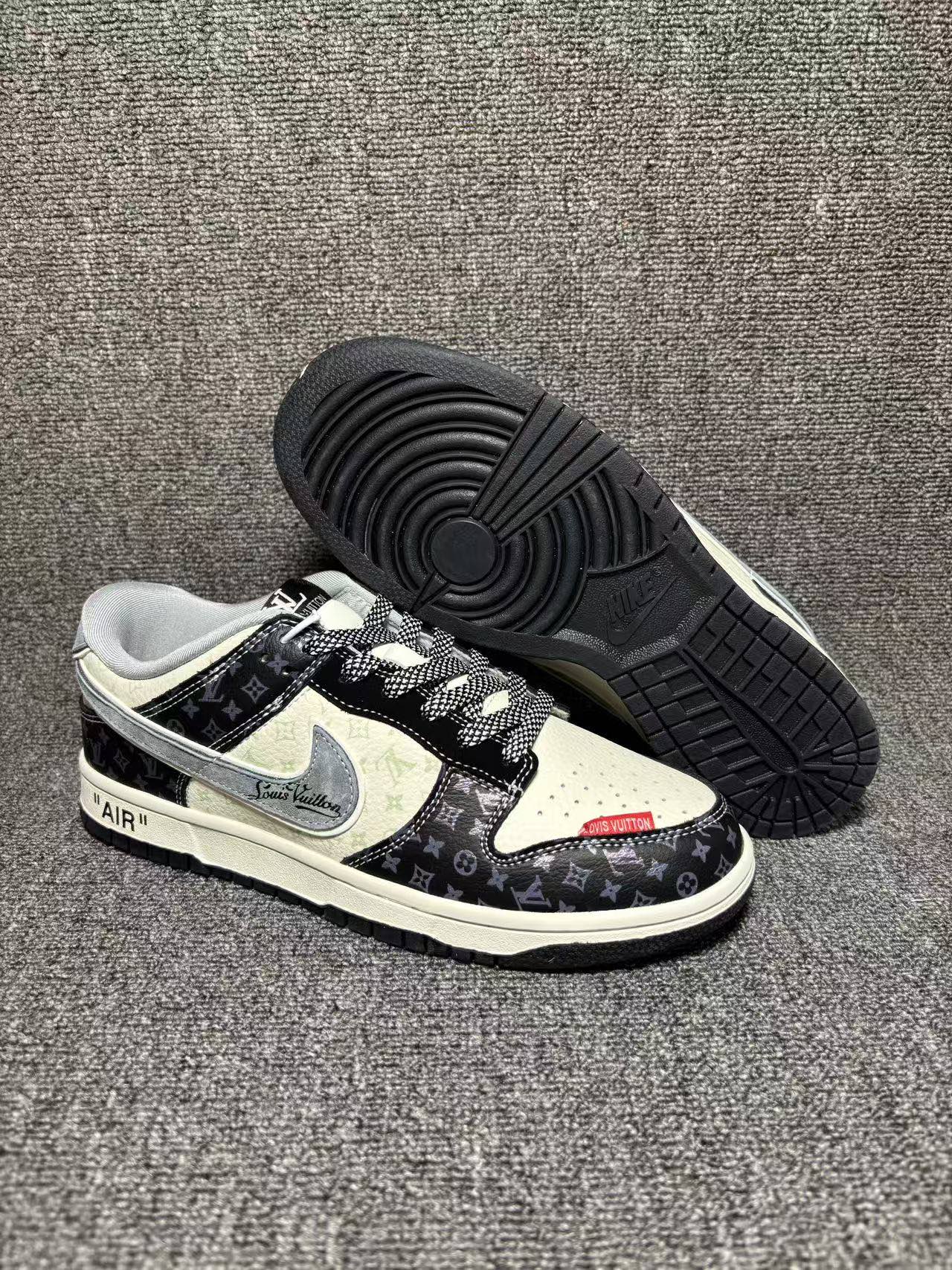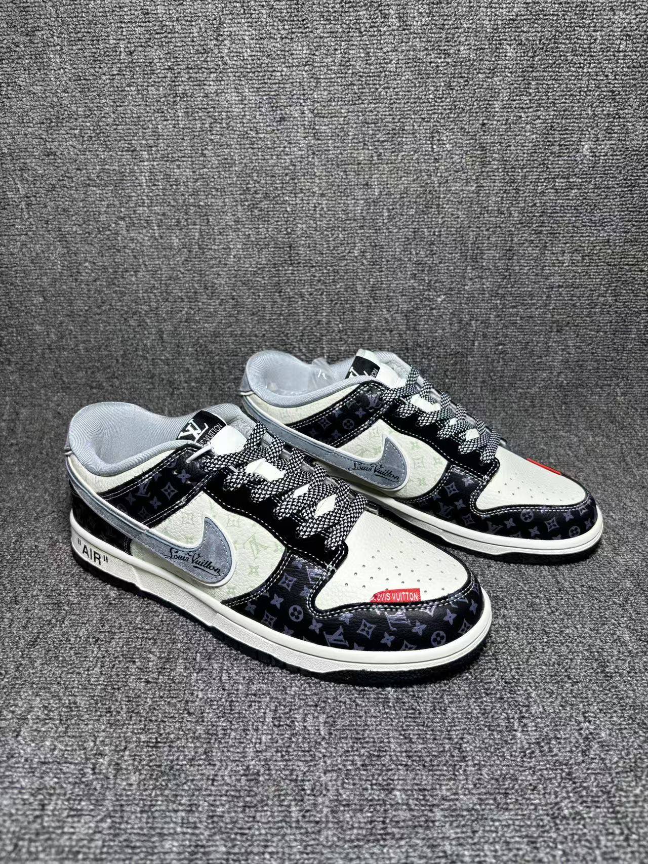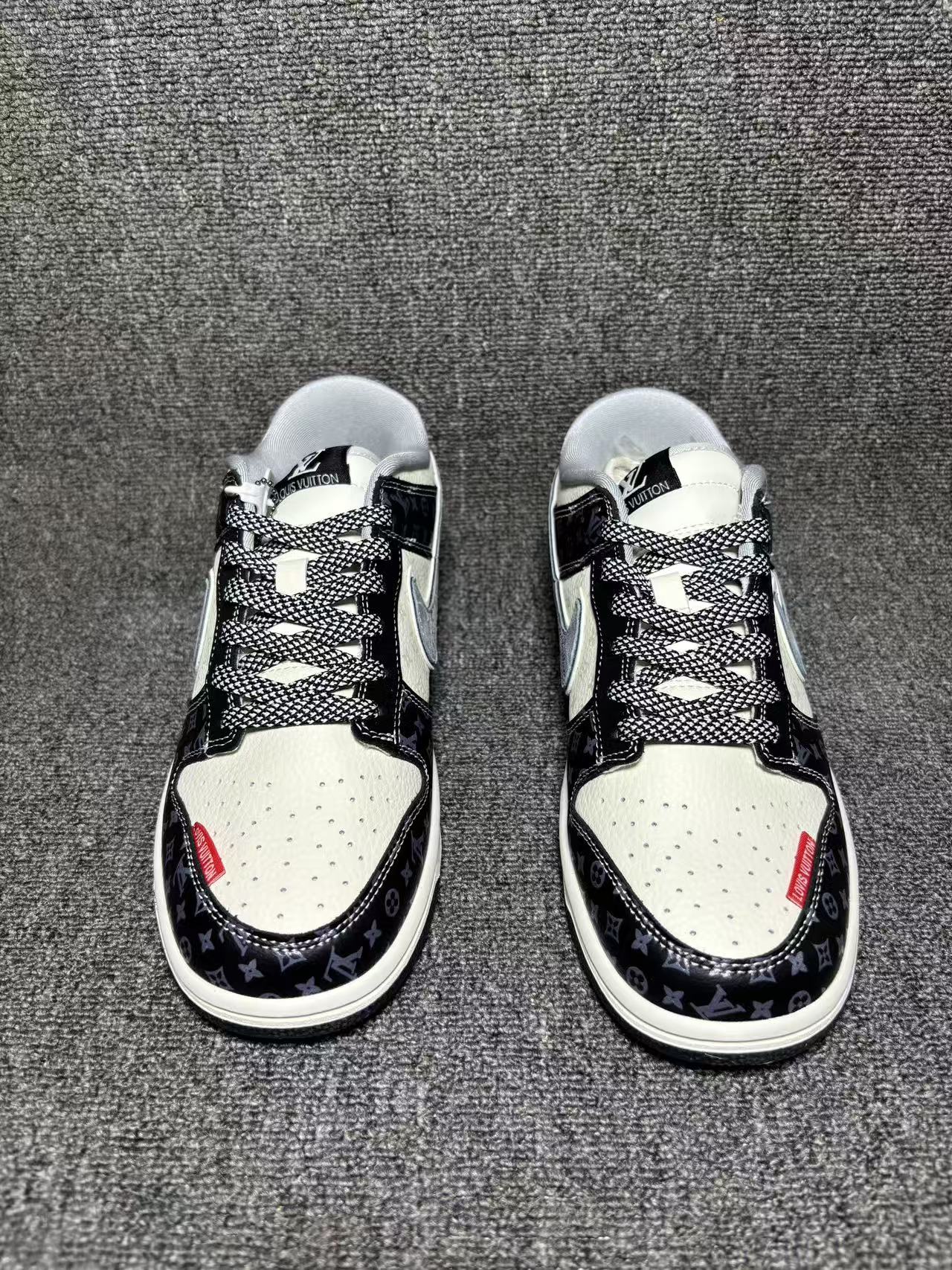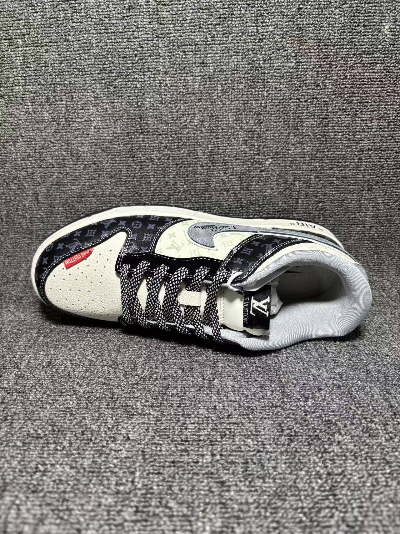 潮奢联名 炸场登场SB DUNK LOW LV老花元素碰撞经典Dunk版型 黑白撞色设计自带高级感 鞋身满印标志性Monogram花纹 金属LV吊牌 侧边 AIR 标识细节拉满 上脚直接解锁街头顶流气场 鞋型贴合脚型 缓震中底兼顾脚感与造型 日常出街 潮流穿搭都能轻松驾驭 不管是收藏还是上脚都是绝佳选择 潮人鞋柜必入款