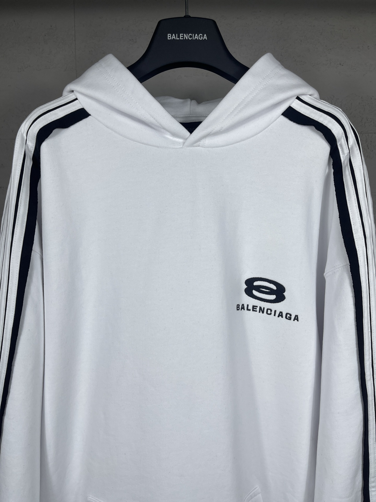 细节图 顶级版本 官网品质 BALENCI GA 巴黎SS25最新款 肩袖拼色 拉条 前左胸口刺绣经典双环LOGO连帽卫衣 砖柜同步 第一时间研发