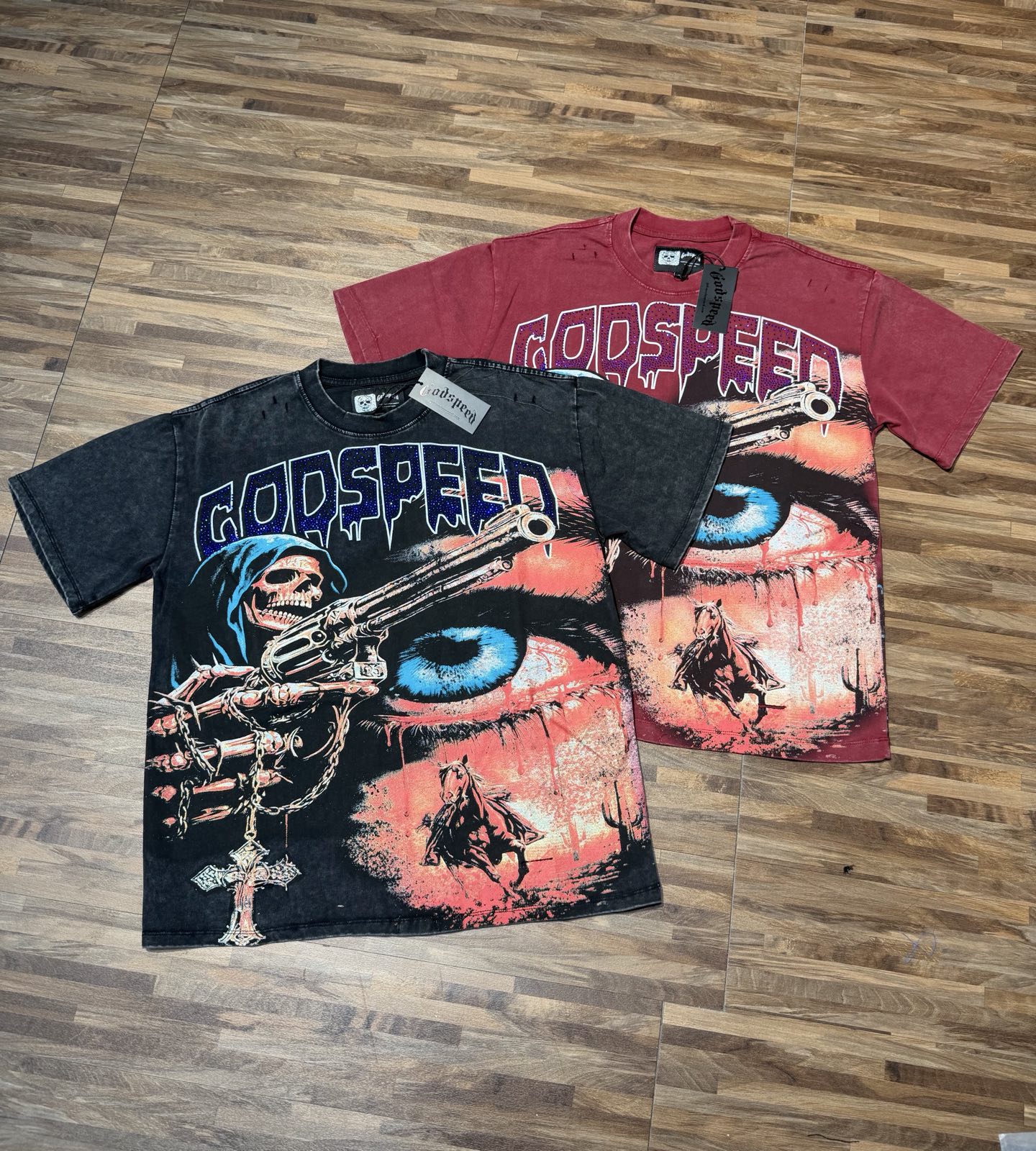 洗水黑色 洗水安可拉红 gods eed 破洞 烫澳钻 白墨直喷 现货实拍 跨境美式摇滚街头洗水复古风 短袖 面料 fabric 32支精梳双纱250克重 码数 size S M L XL 颜色 colour 洗水黑色 洗水安可卡红