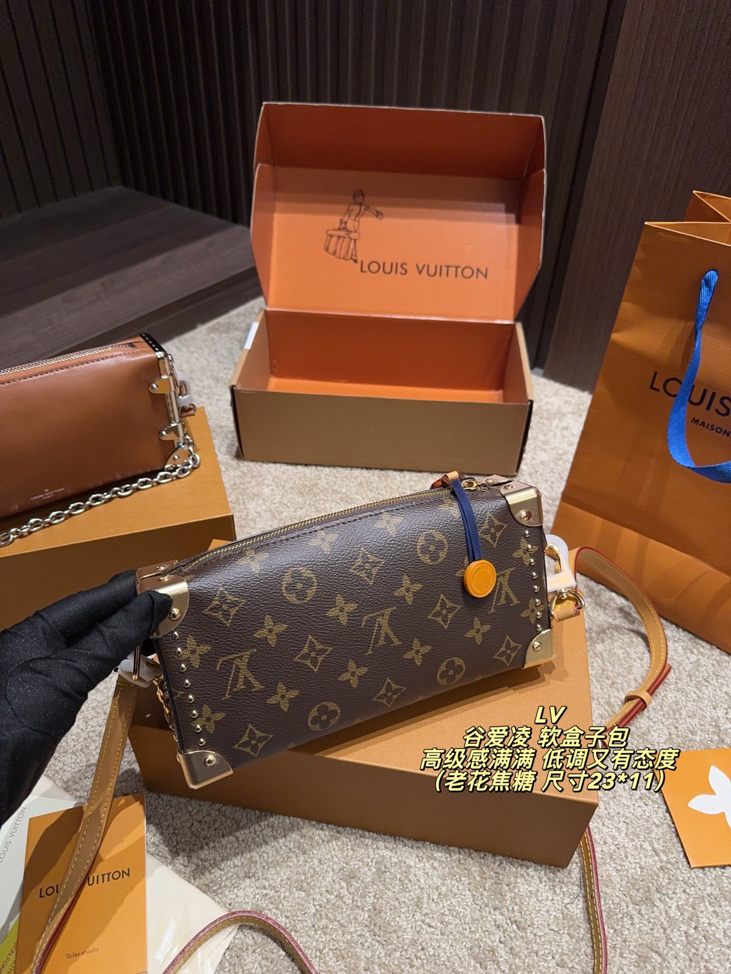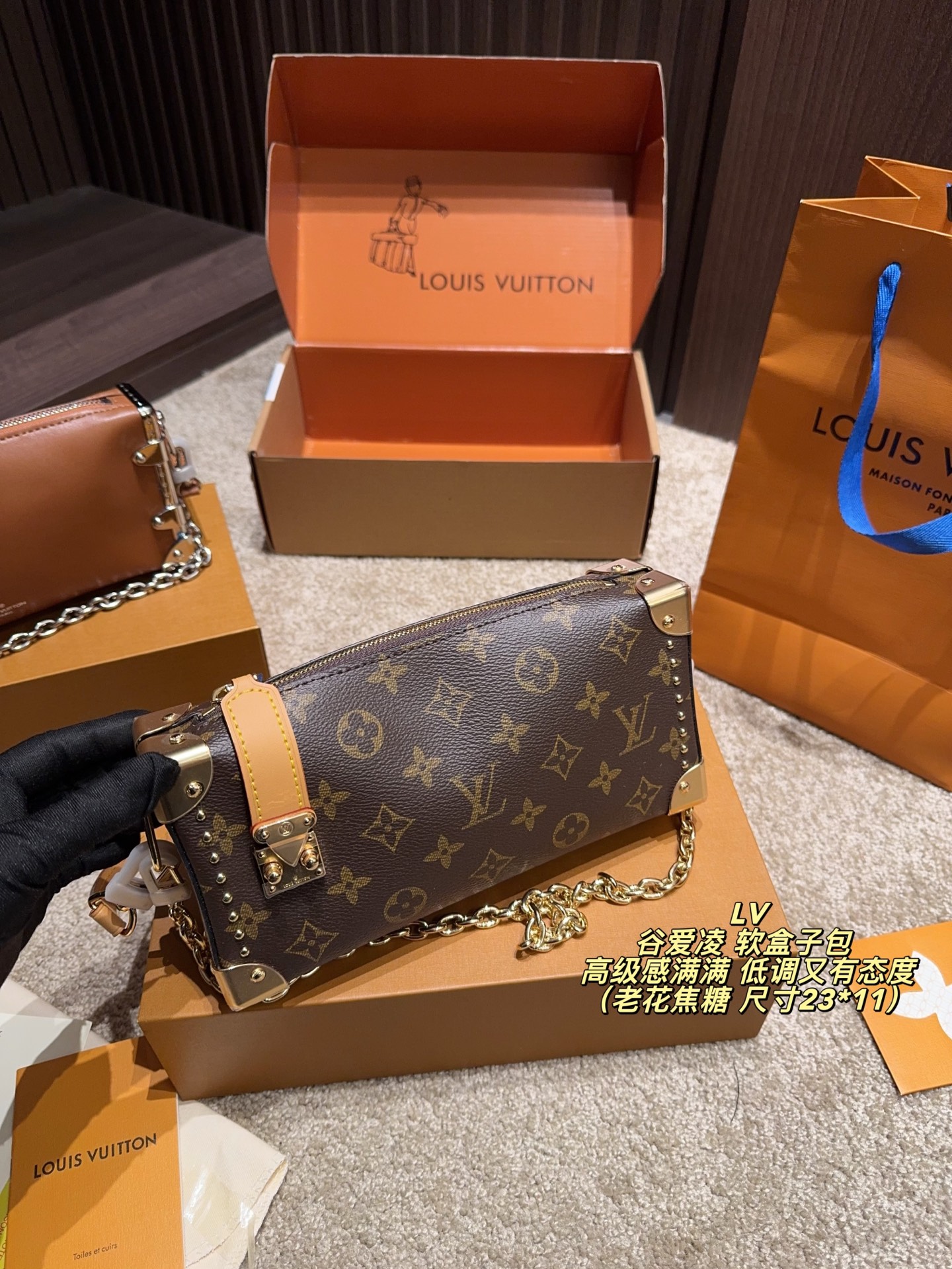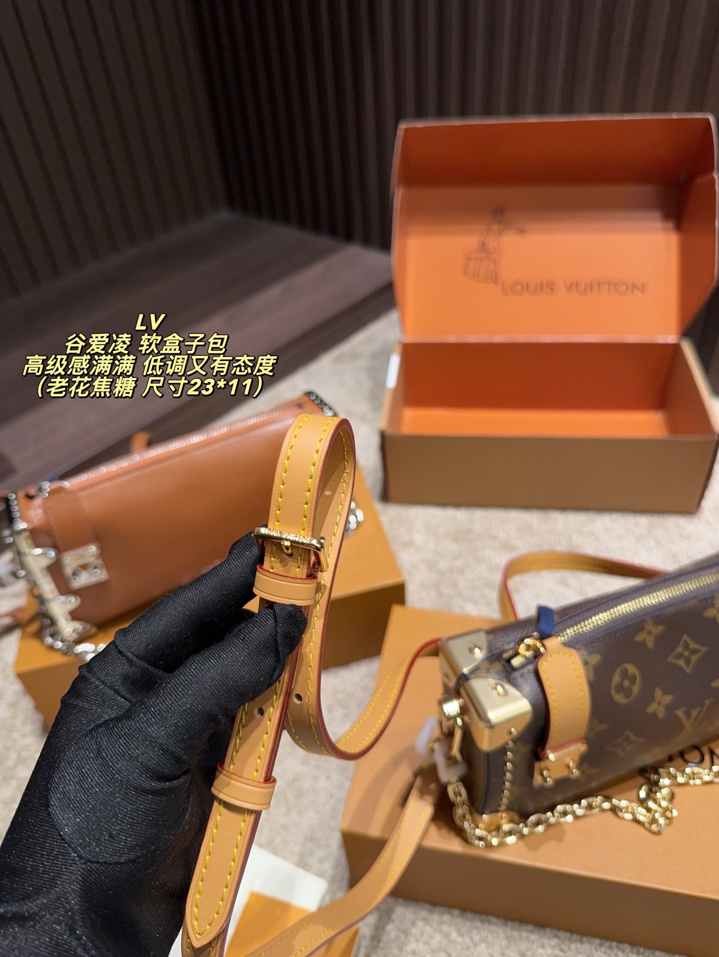 全套包装尺寸23 11 LV 谷爱凌 软盒子包 黑银链条 低调又有态度 五金部分都很有质感 包包皮质也很软糯 不重 我另外搭配了一根男装链条增加一些层次感 时髦感up up up平时都是爱金色系的我 对这次的黑银系列爱不释手