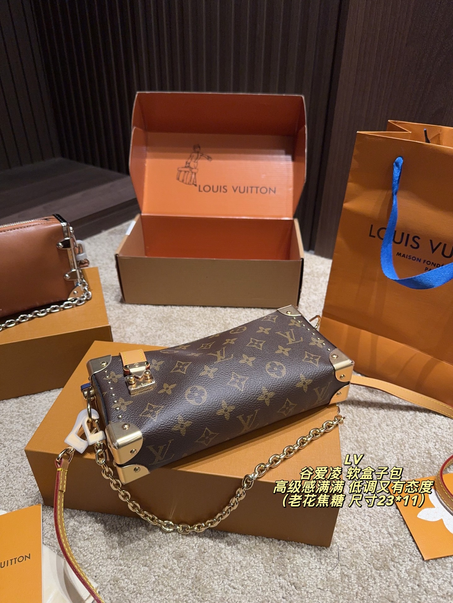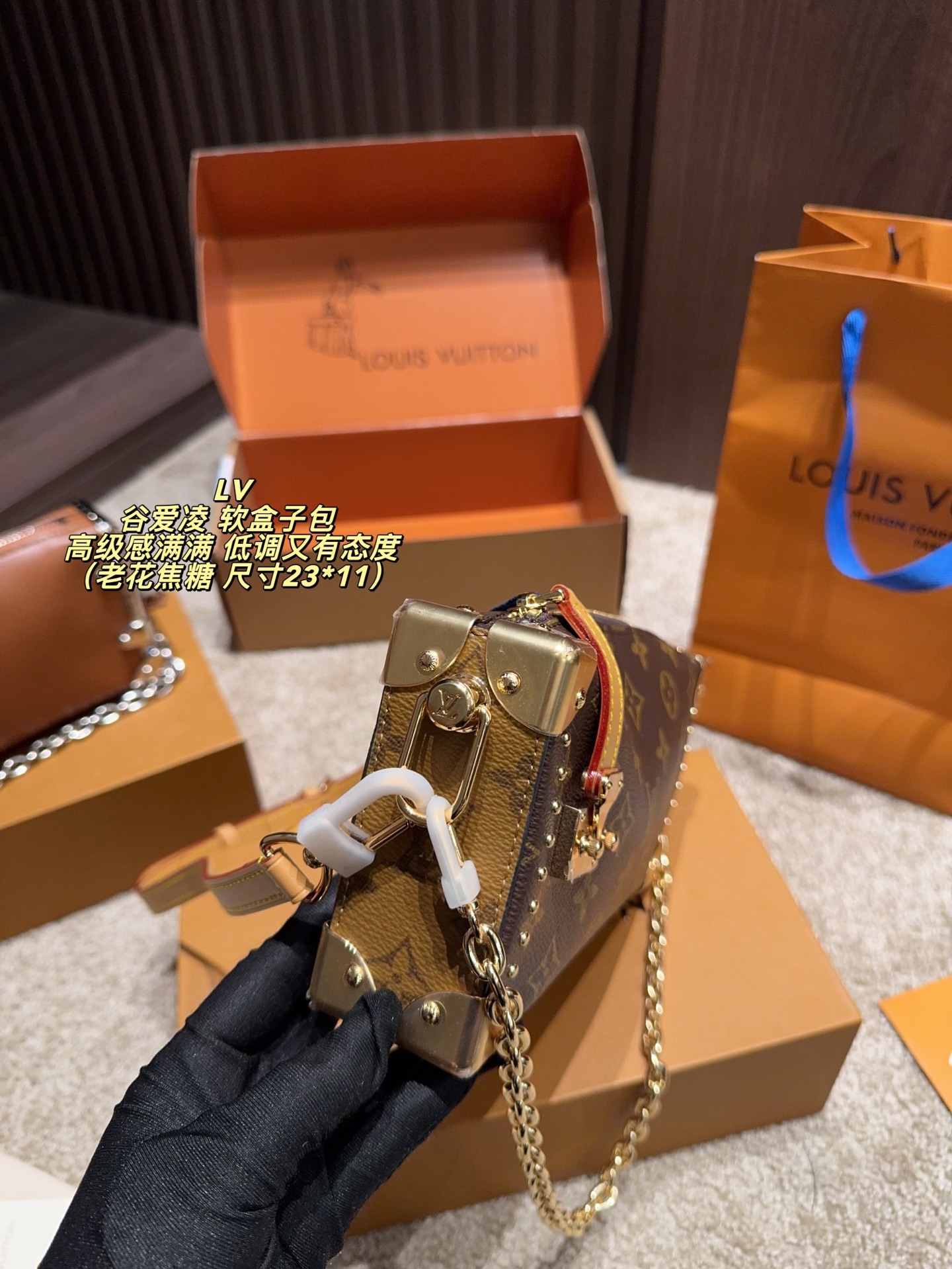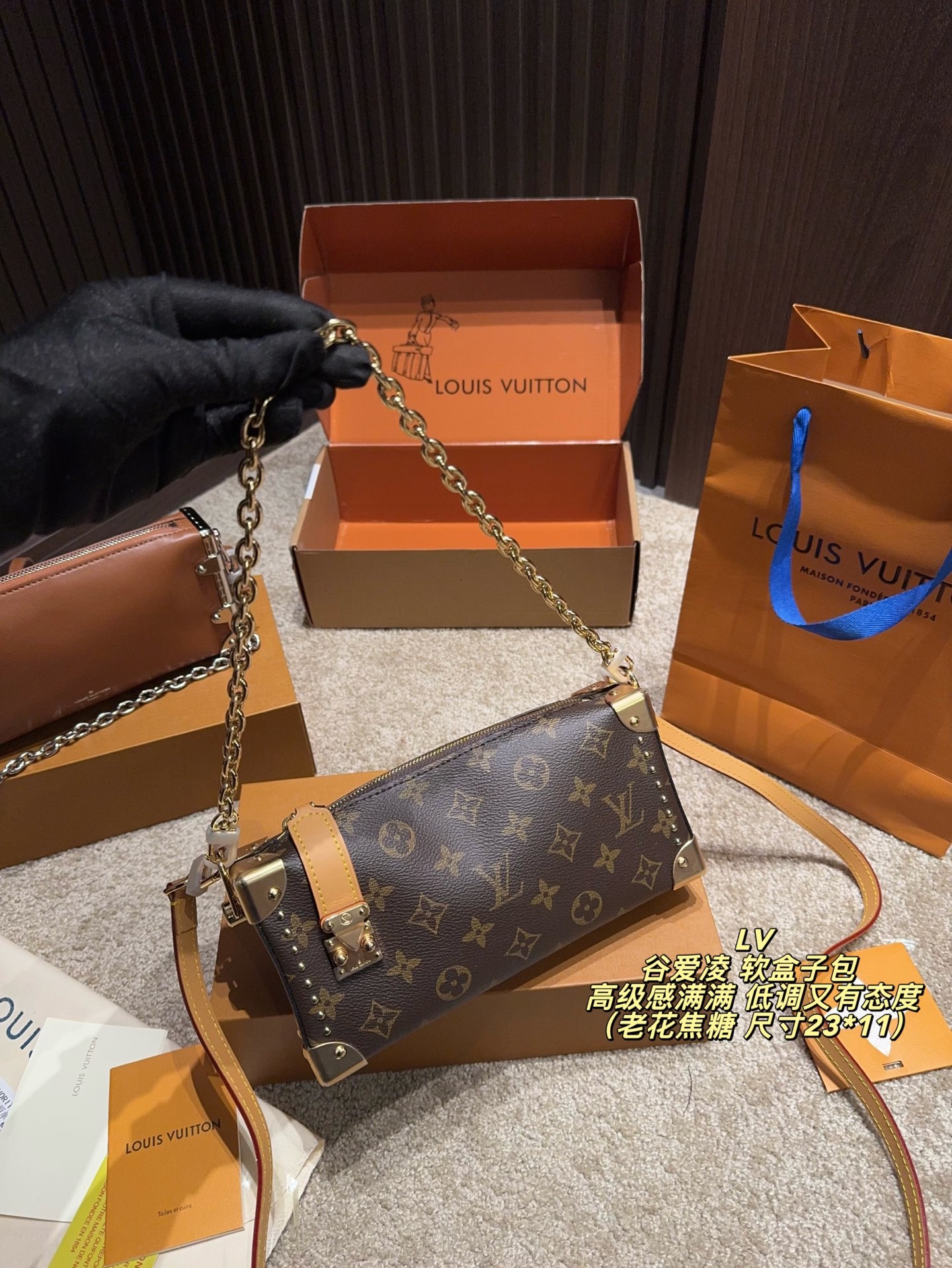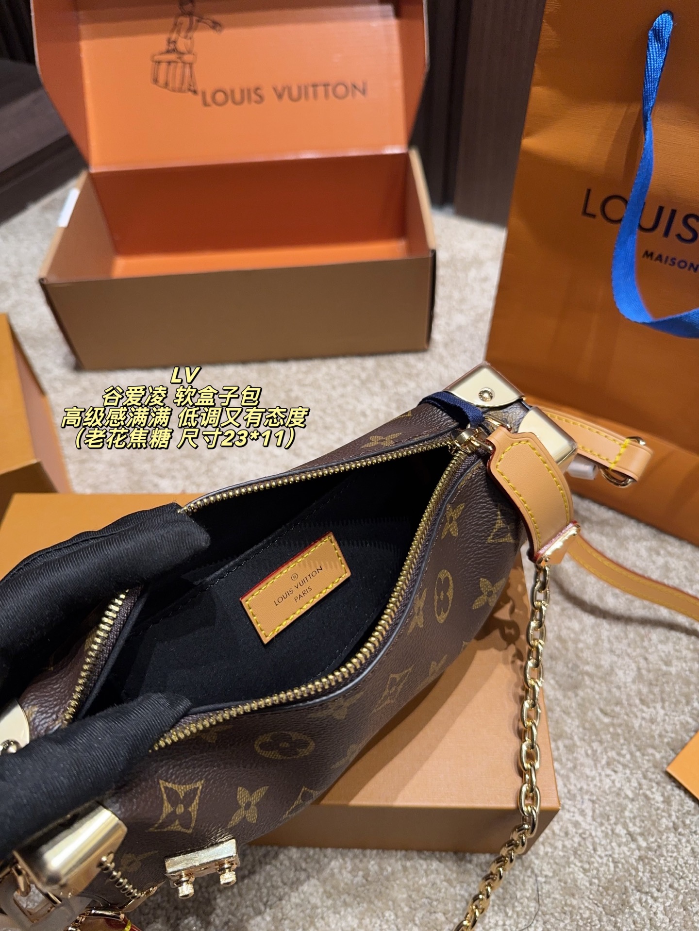 全套包装尺寸23 11 LV 谷爱凌 软盒子包 黑银链条 低调又有态度 五金部分都很有质感 包包皮质也很软糯 不重 我另外搭配了一根男装链条增加一些层次感 时髦感up up up平时都是爱金色系的我 对这次的黑银系列爱不释手