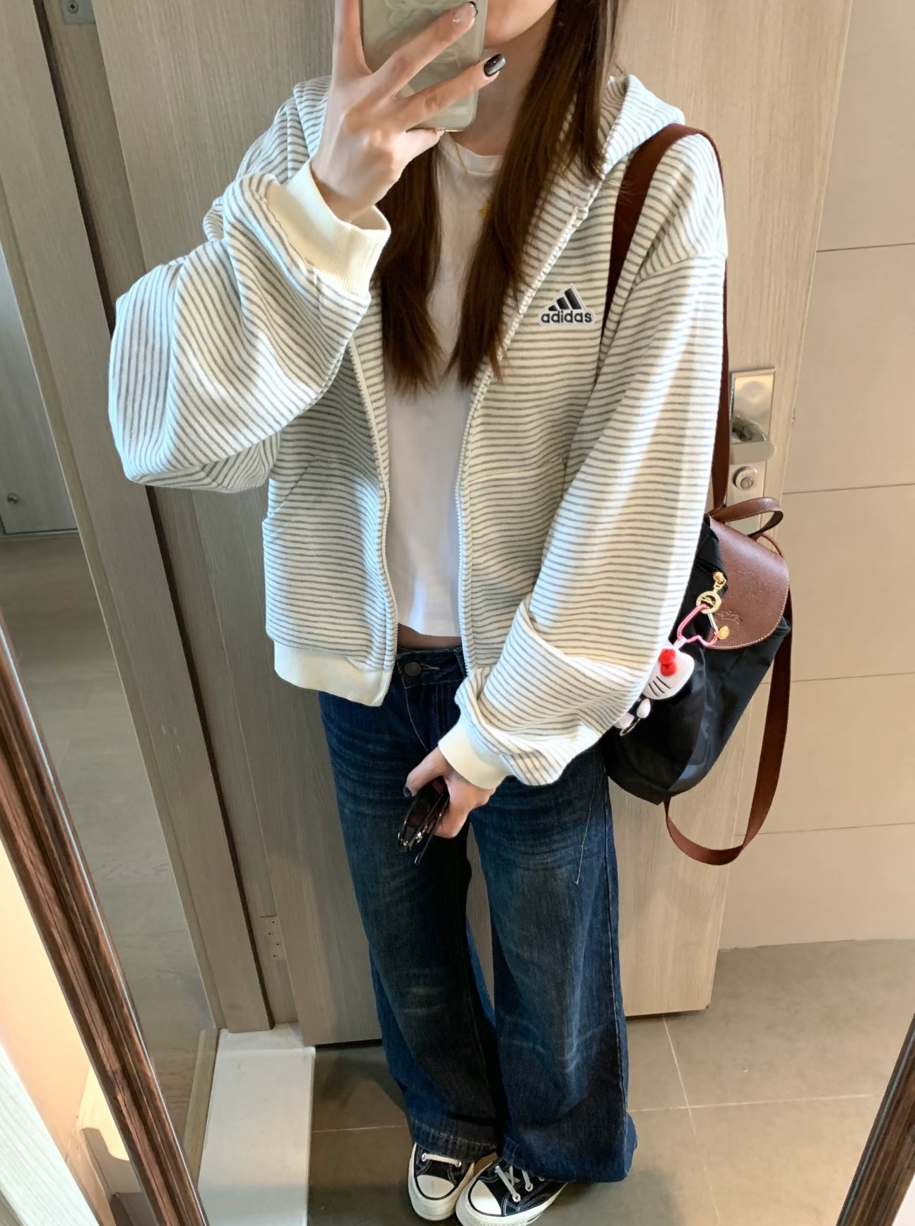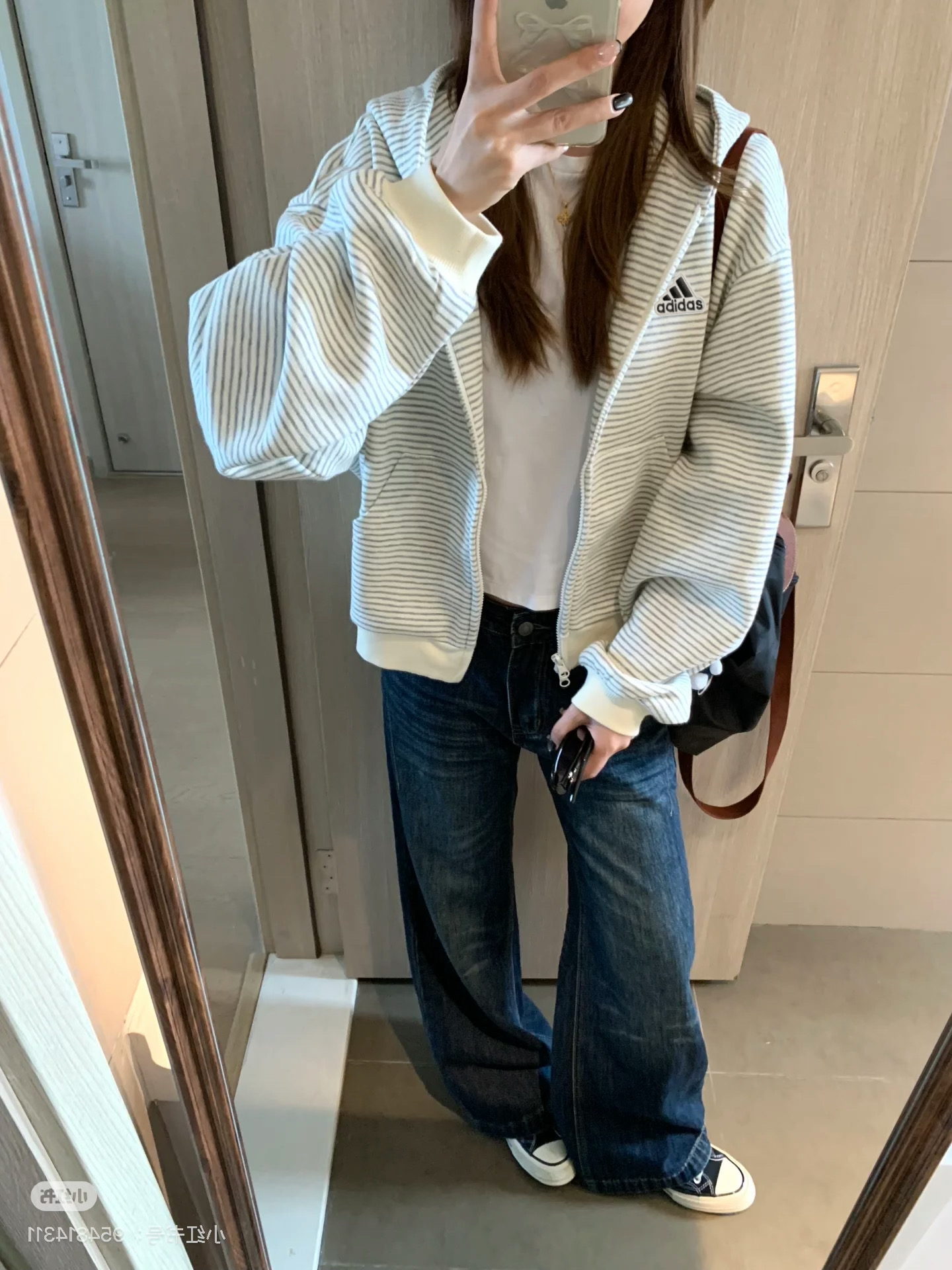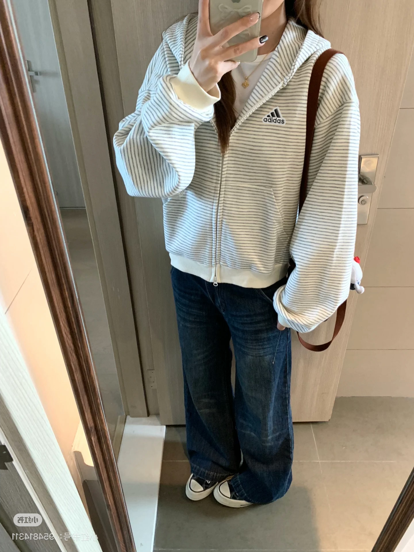阿迪达斯Adidas格子条纹外套秋季韩系氛围感宽松条纹开衫连帽卫衣女休闲长袖外套