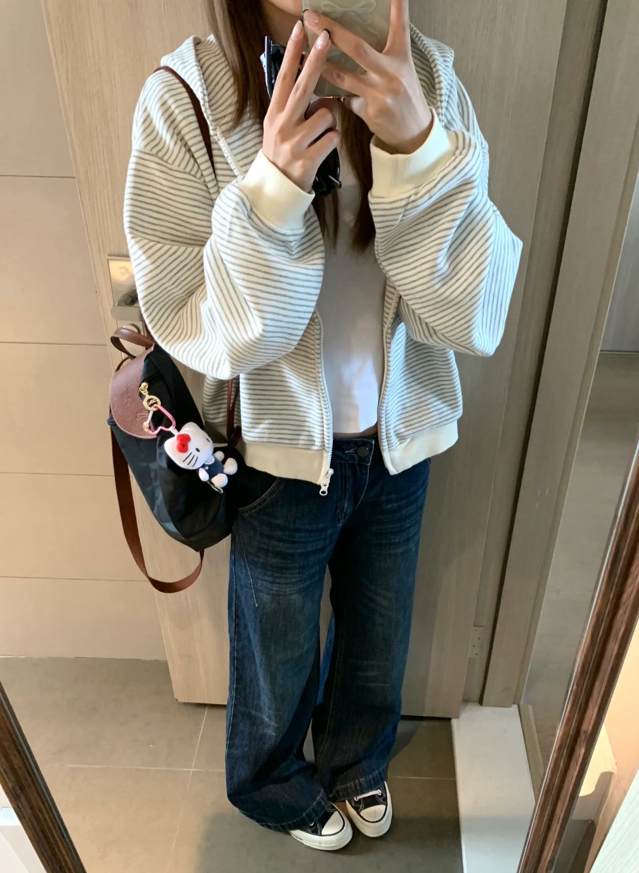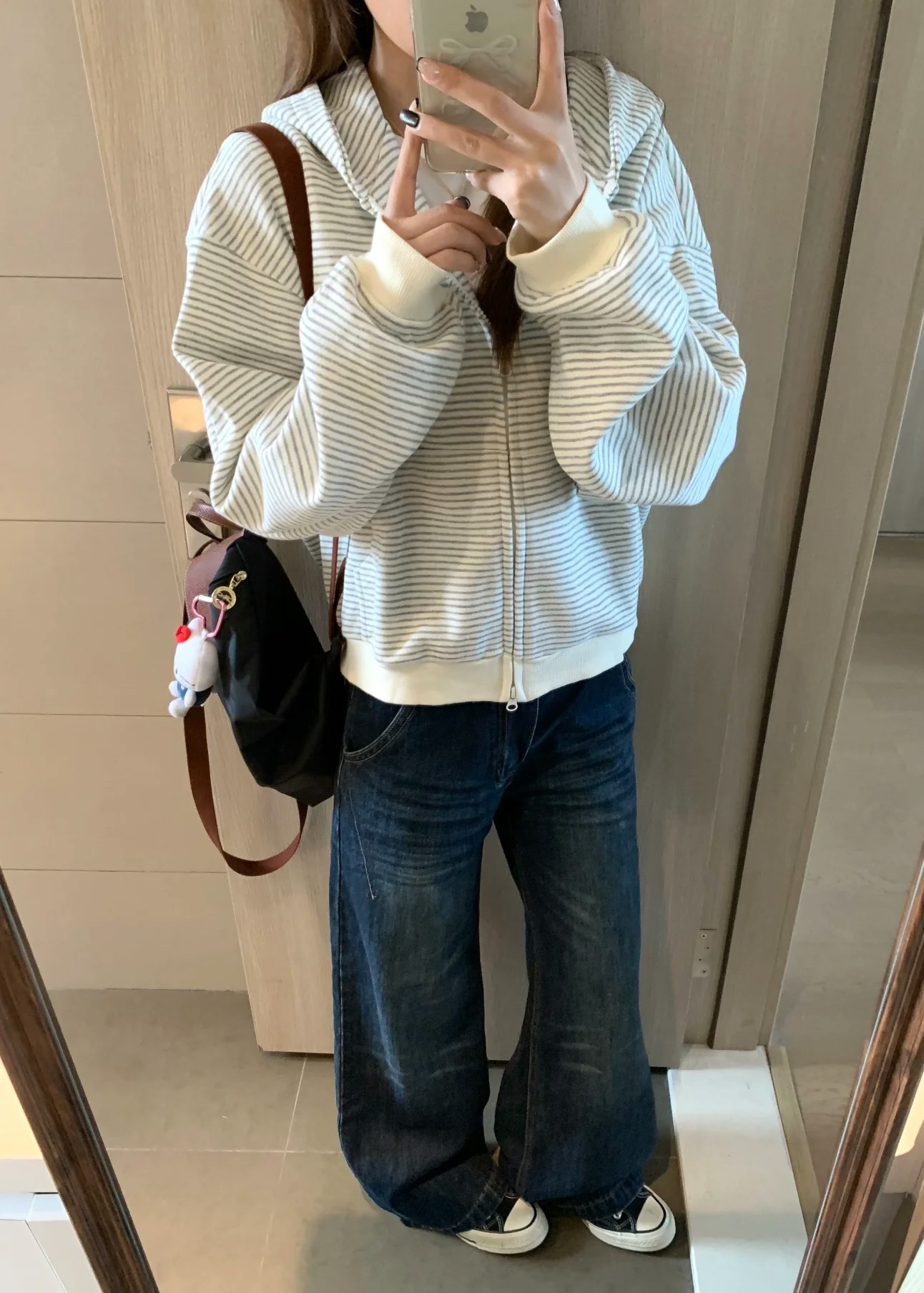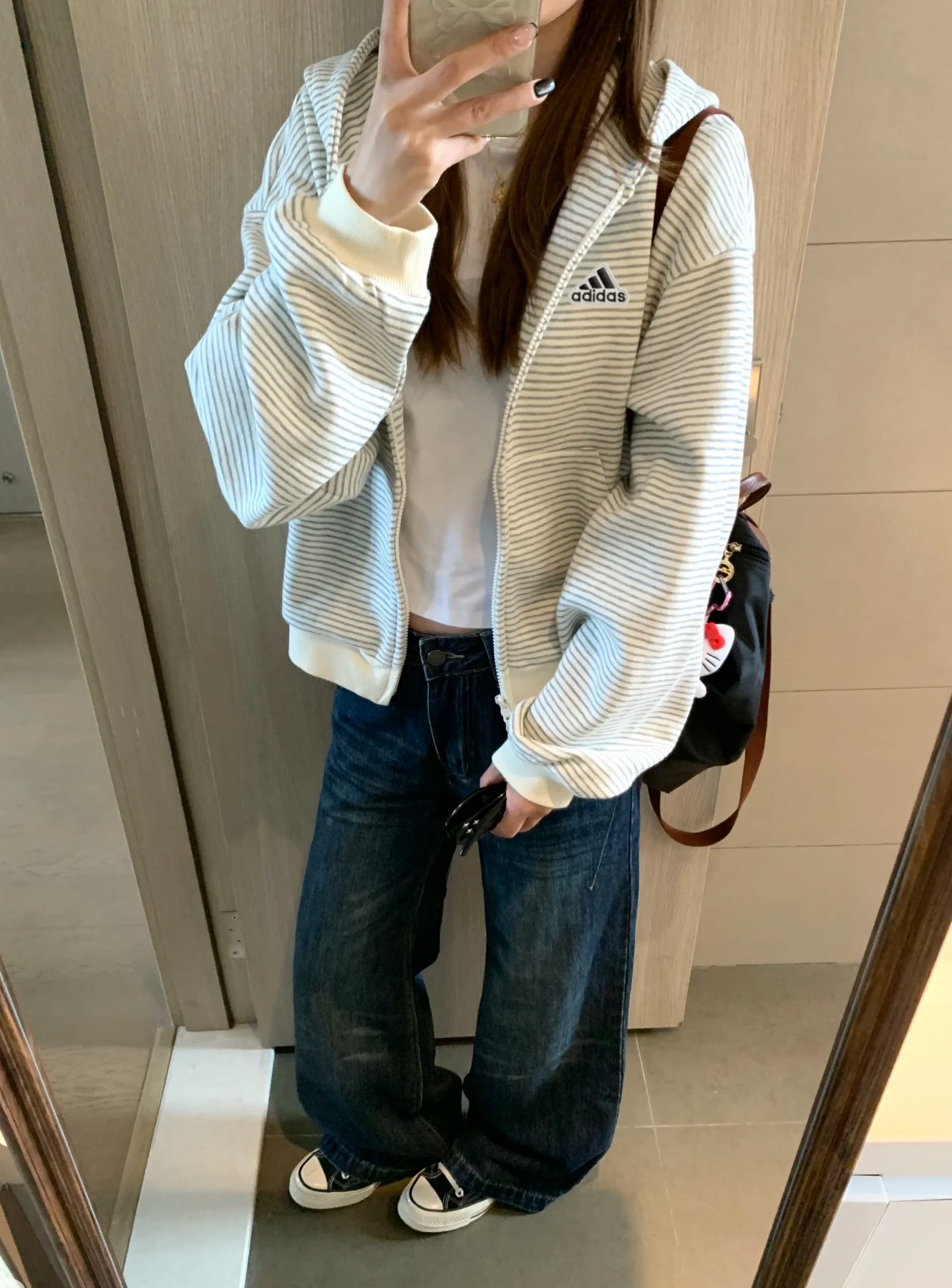 阿迪达斯Adidas格子条纹外套秋季韩系氛围感宽松条纹开衫连帽卫衣女休闲长袖外套