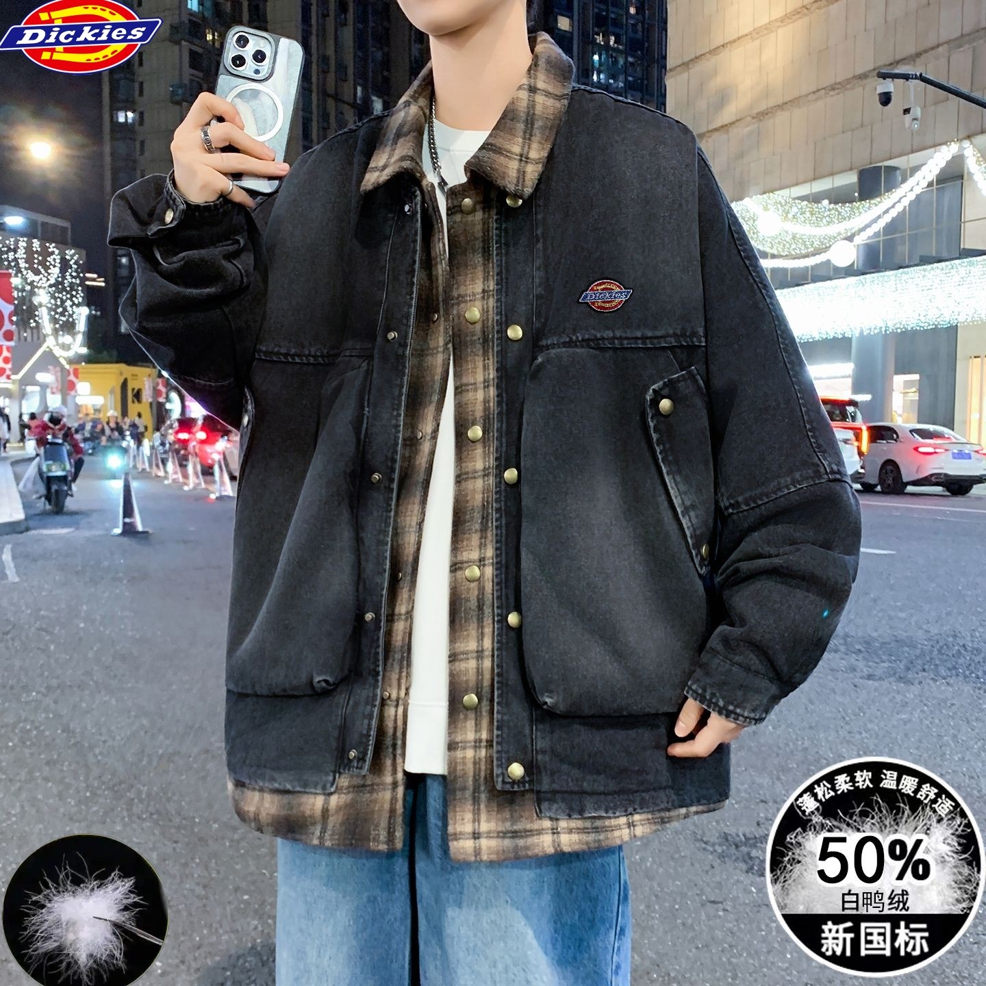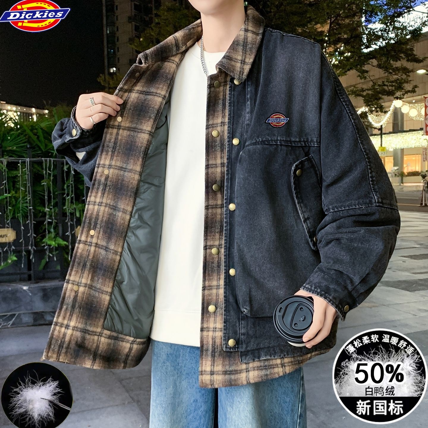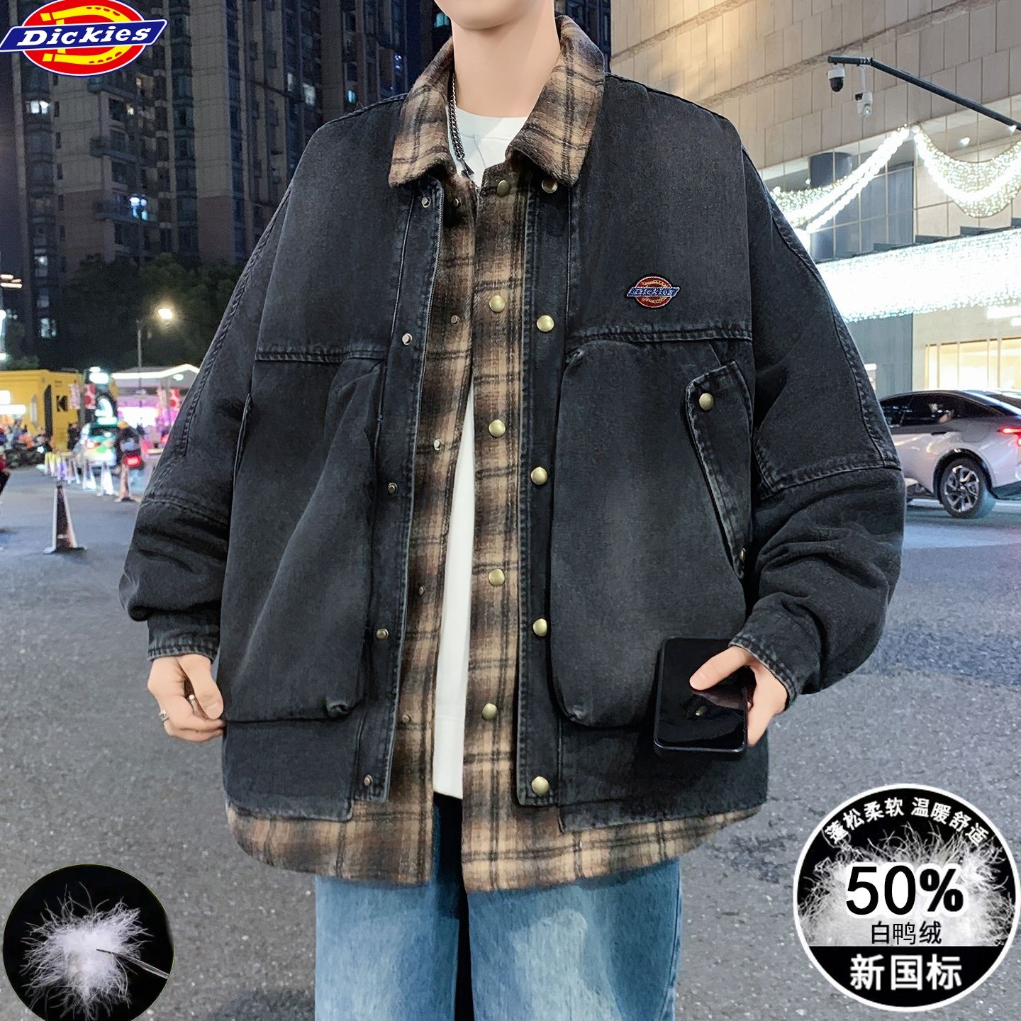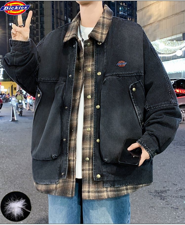 迪克斯Dickies冬季新款 男女同款格子拼接假两件白鸭绒水洗牛仔羽绒外套 男士翻领羽绒服外套
