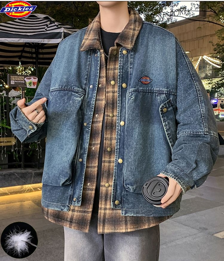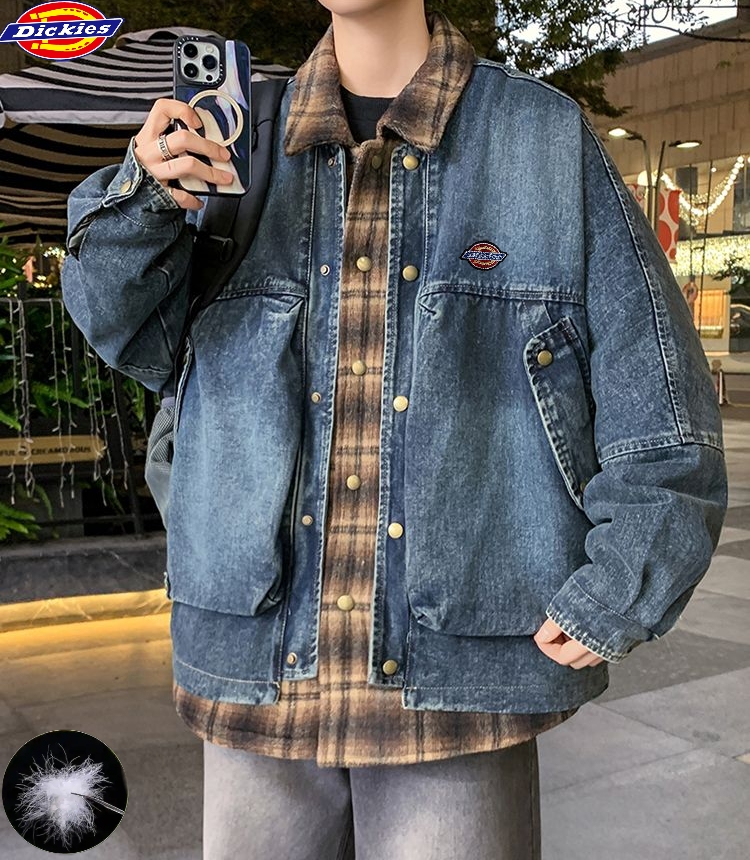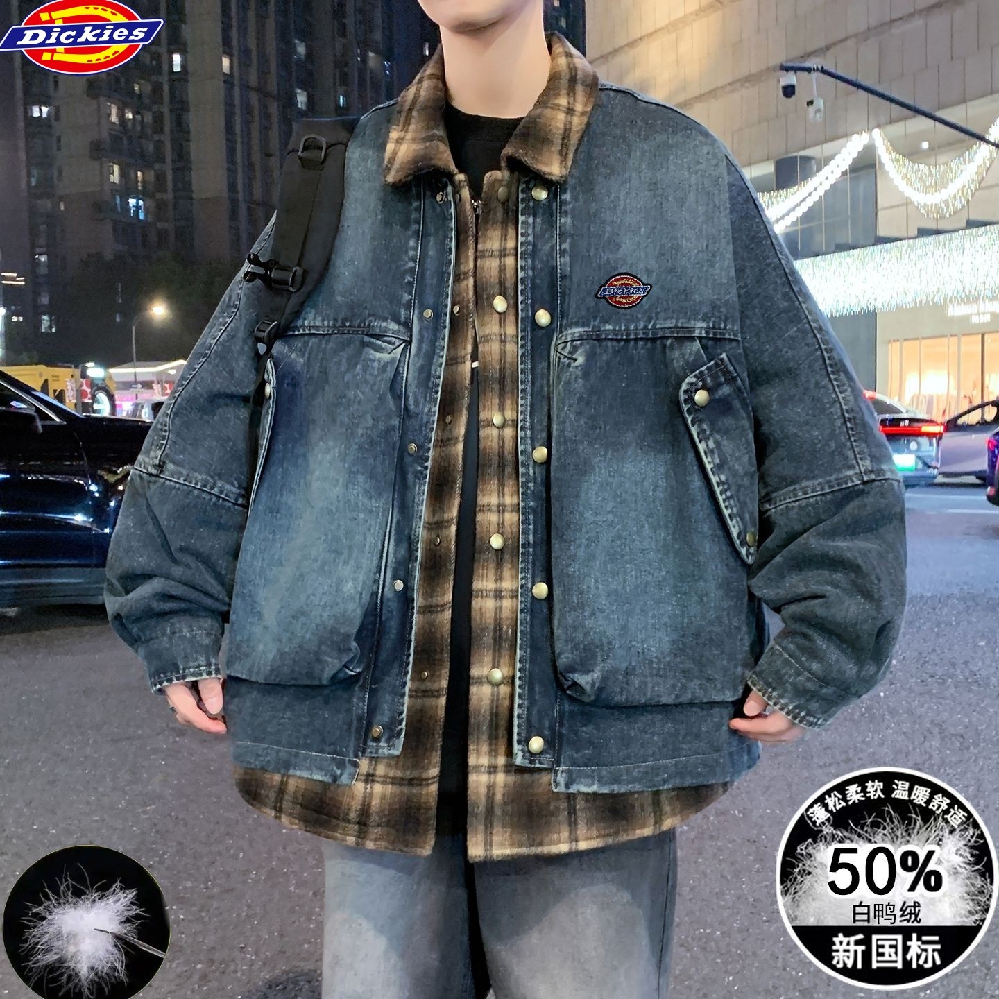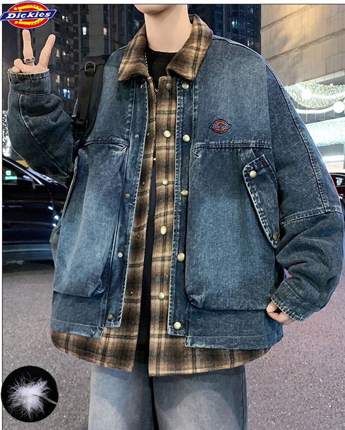 迪克斯Dickies冬季新款 男女同款格子拼接假两件白鸭绒水洗牛仔羽绒外套 男士翻领羽绒服外套