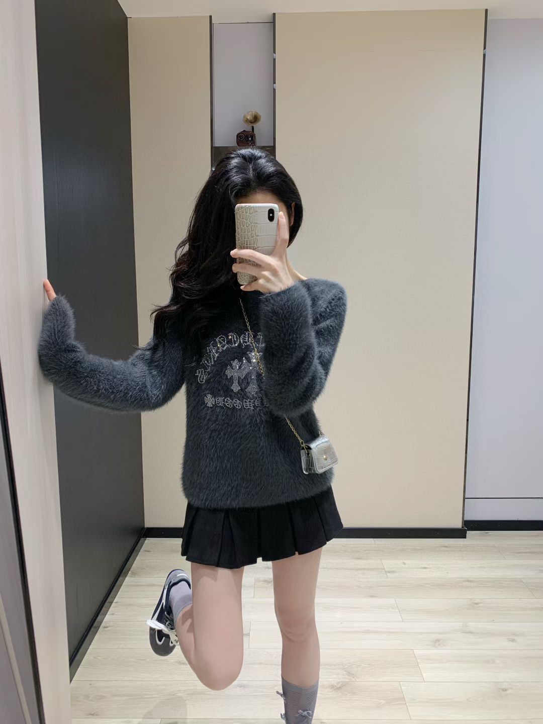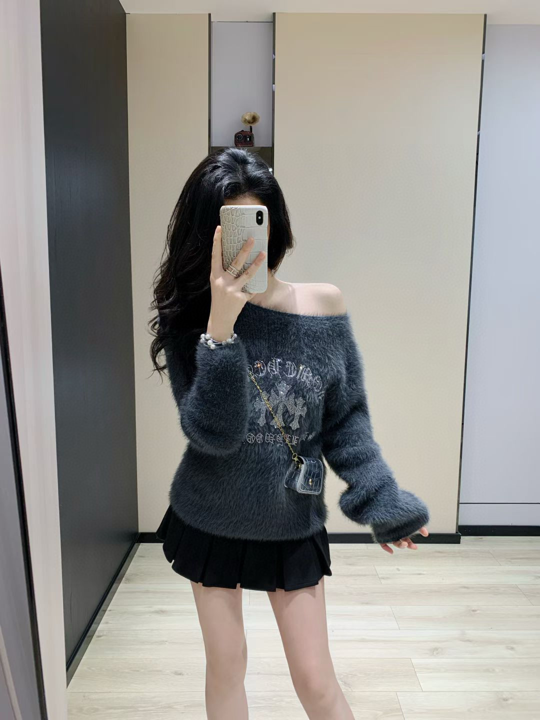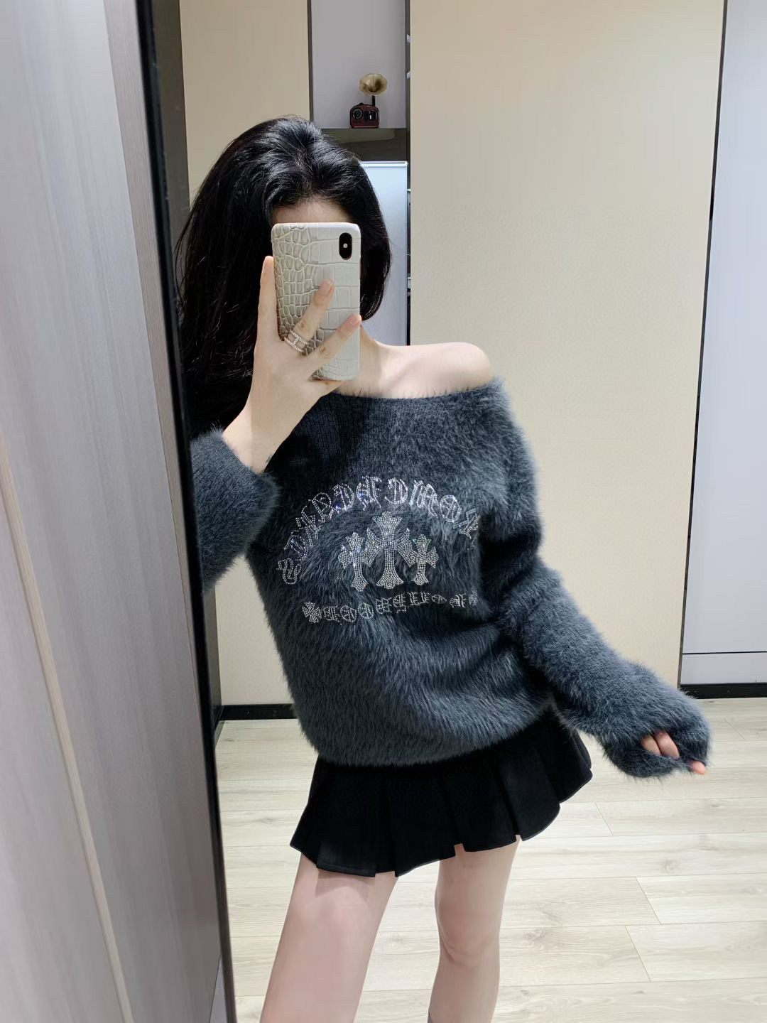 Chrome Hearts 克罗心CH十字架梵文烫钻毛毛绒一字肩针织毛衣