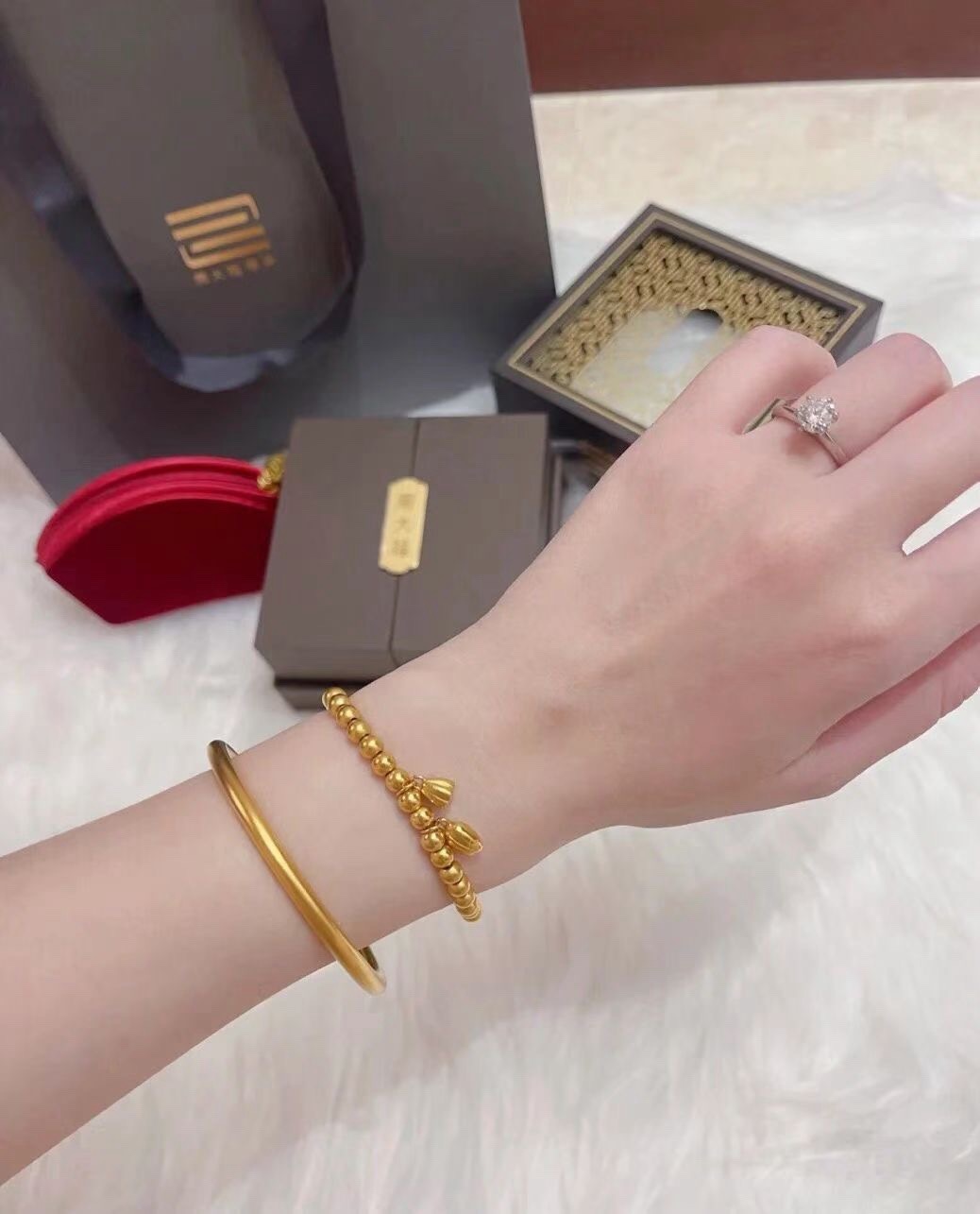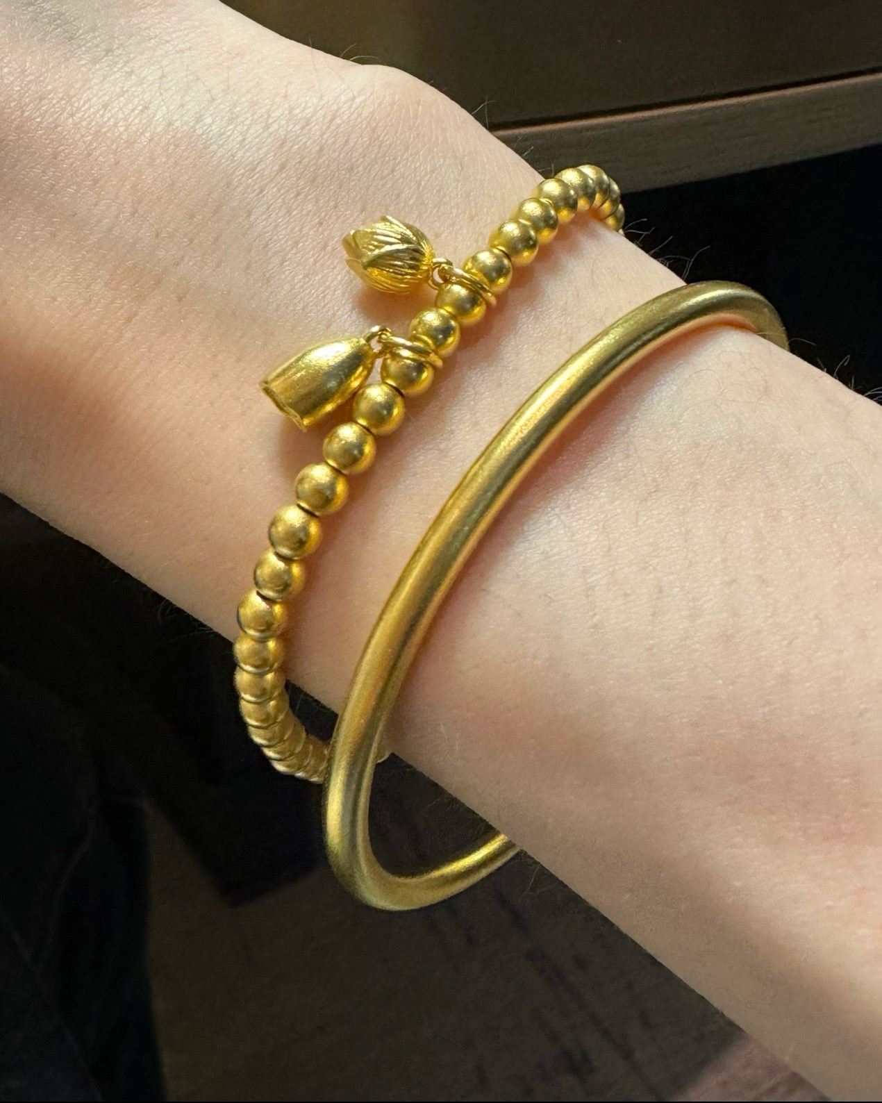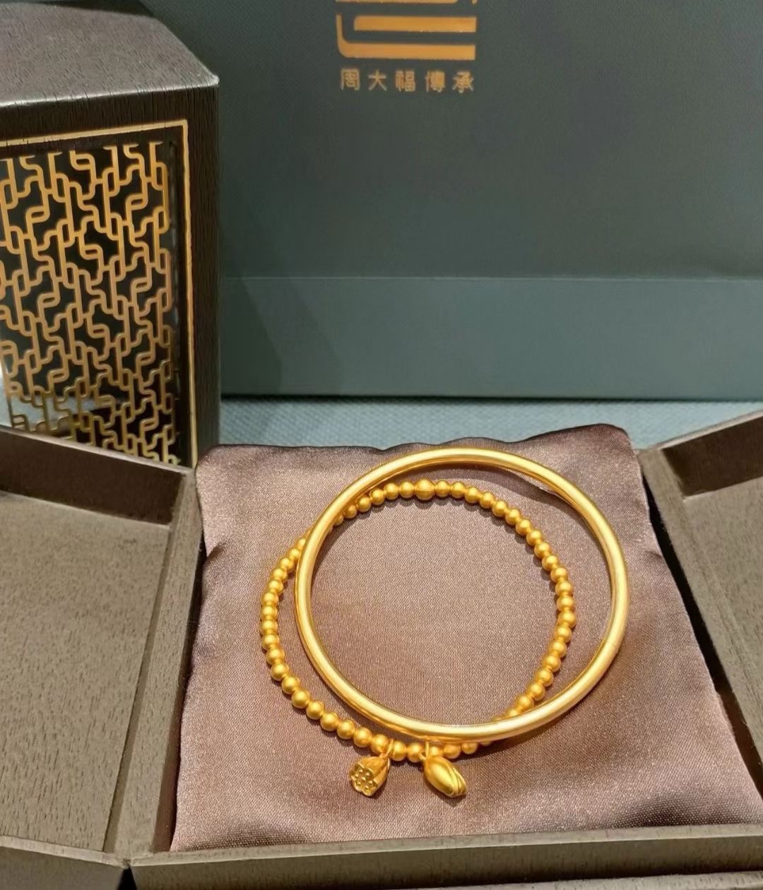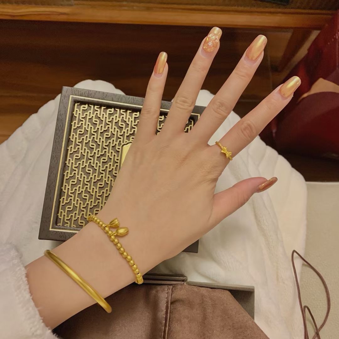 两世欢手链 黄金素圈 寓意也甜到不行 搭配在一起真的好嗑 古法沙金工艺 久不掉色 荷花 莲蓬点缀在金珠手链之上 叠戴两个手镯 正与两世欢的寓意相合 叠戴传承两世欢 雅致时尚不落俗 莲花洁净不染 莲蓬多子多福 莲花 莲蓬为同身两世 荷莲同根 并蒂同心