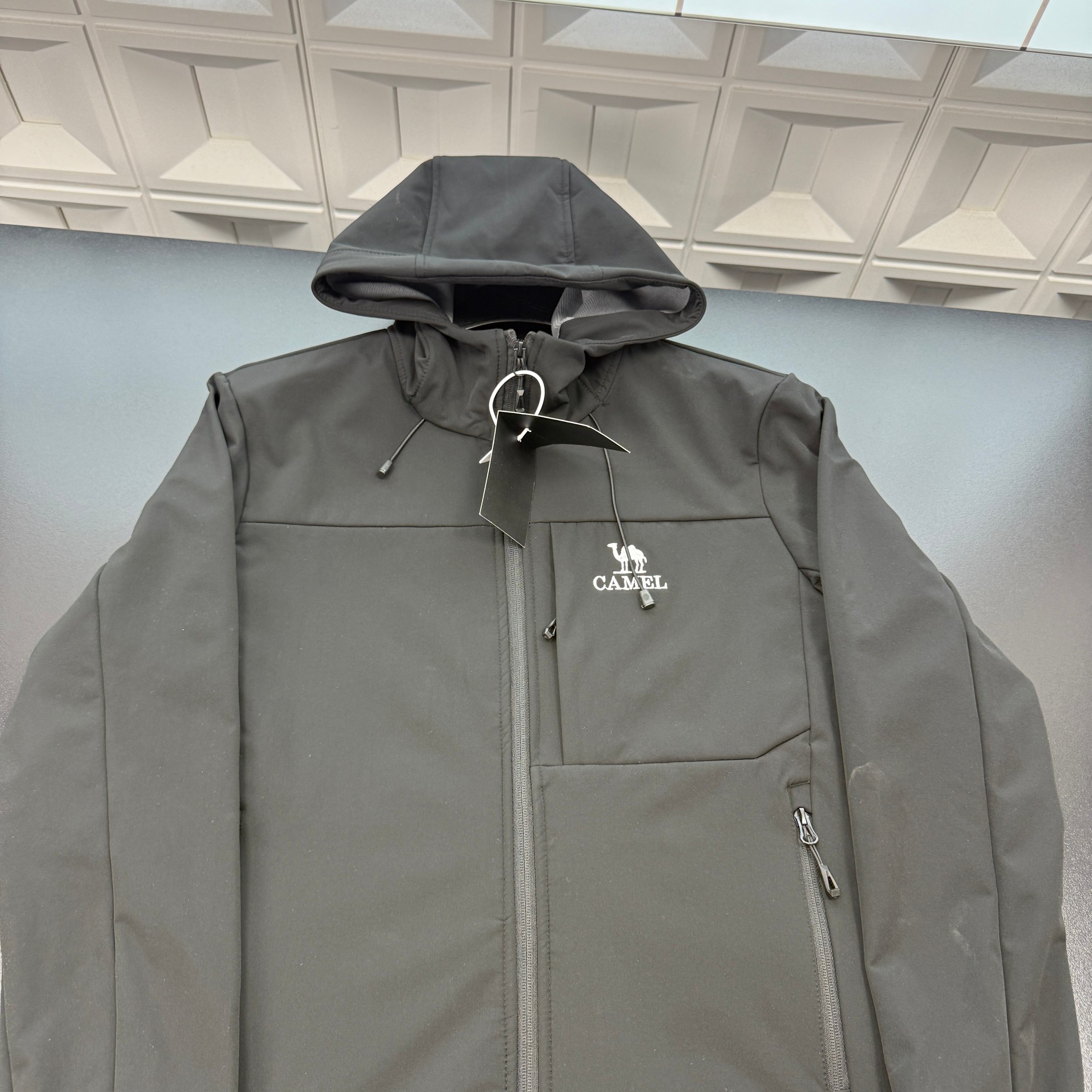 春季新款上新爆炸输出骆驼连帽冲锋衣外套 胸前刺绣骆驼图案 侧边小口袋拉链 纯色机能软壳冲锋衣 三标齐全官网一致 放大看细节原相机实物拍摄 颜色 黑色 尺码 L 4xl L 80 105斤 XL 105 120斤 2XL 120 140斤 3XL 140 160斤 4XL 160 180斤