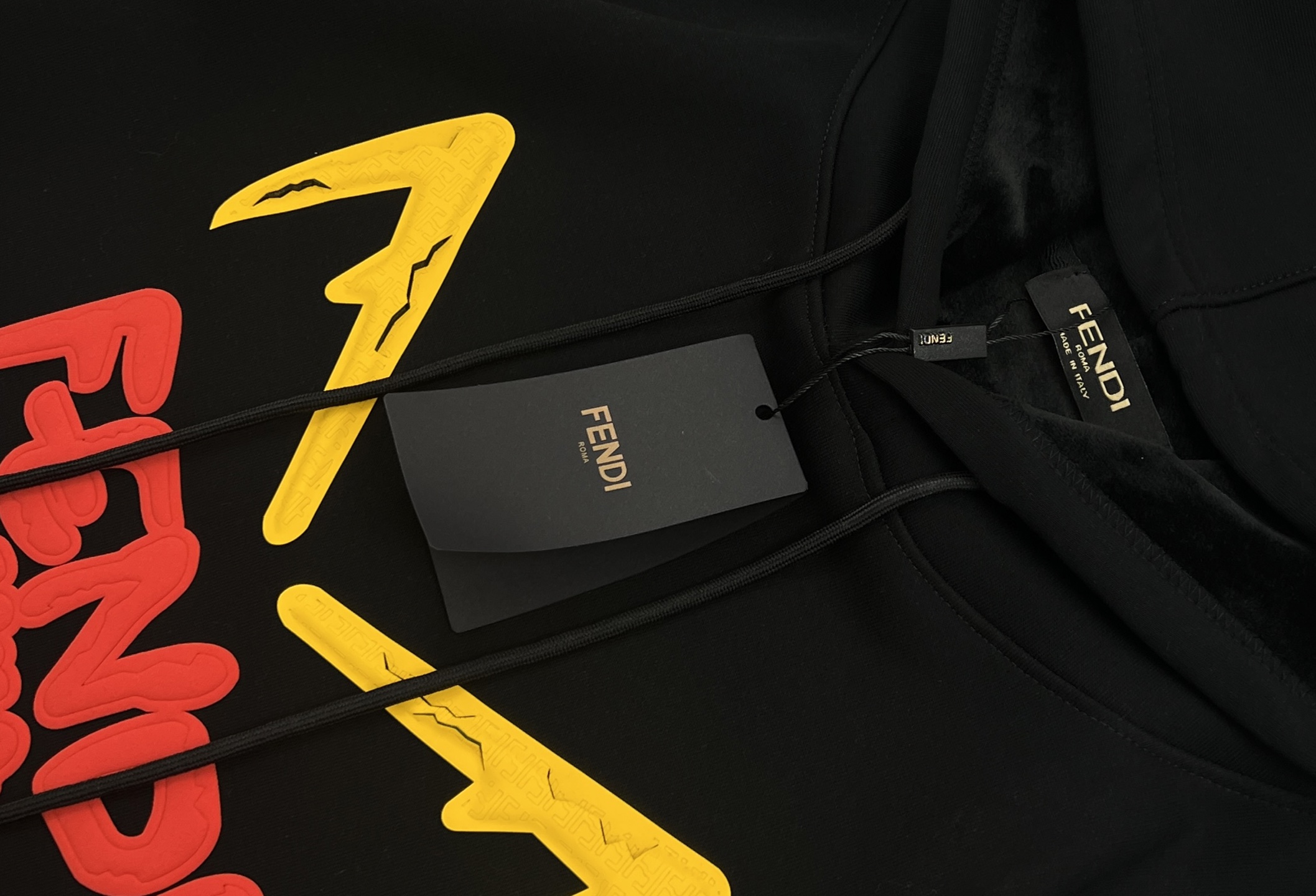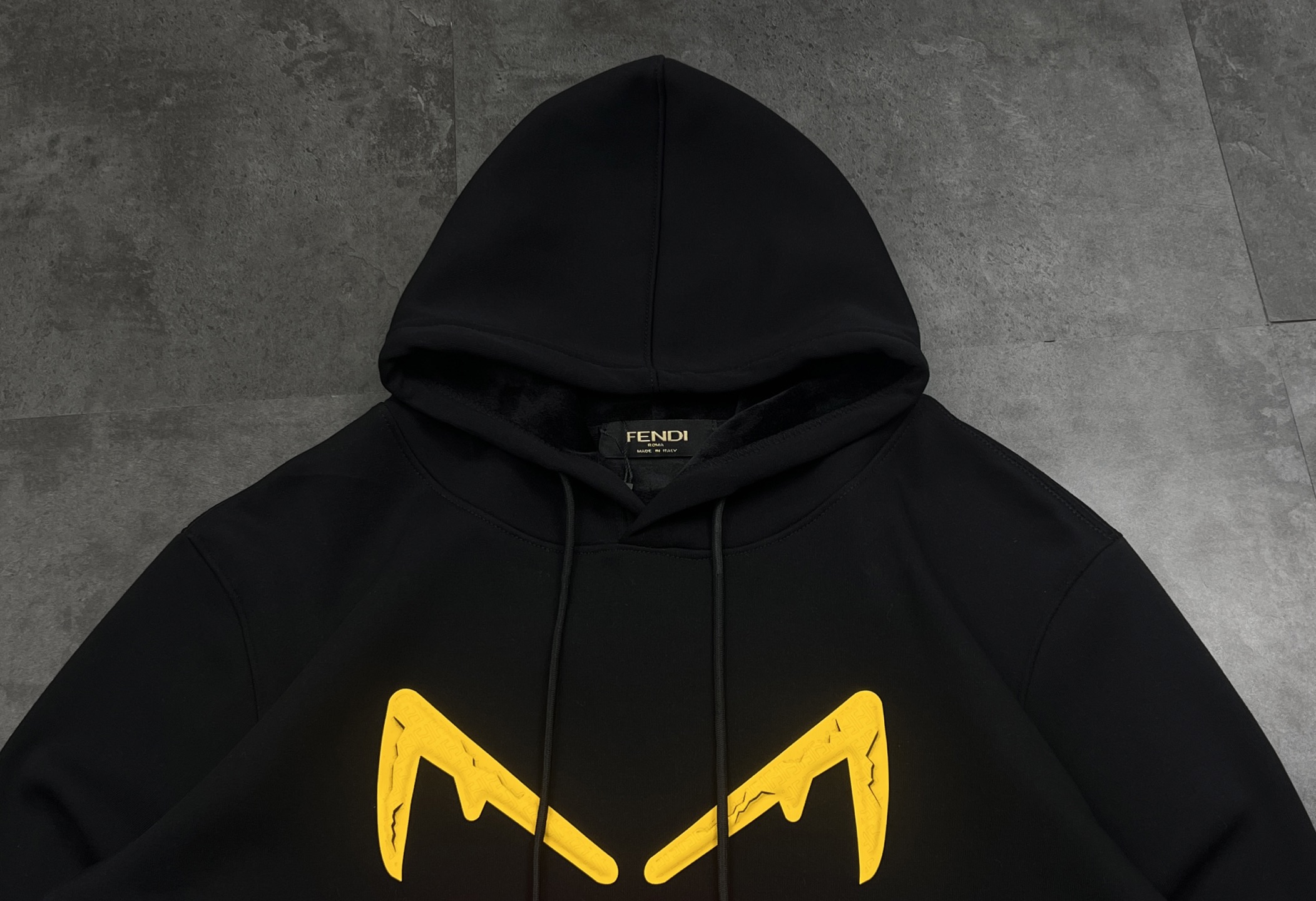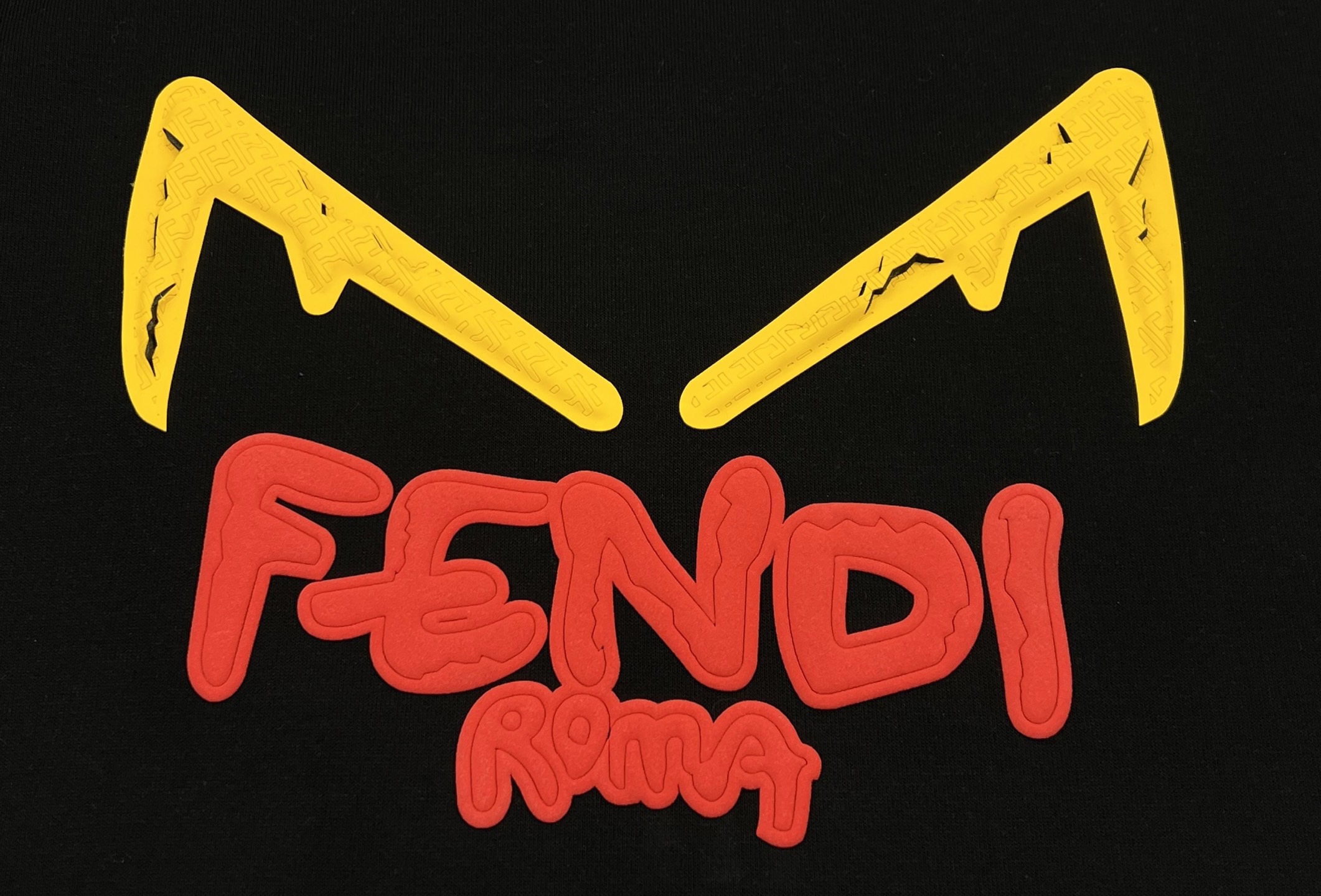 最惊艳的还是工艺细节 胸前的小怪兽眼睛用了立体硅胶烫印工艺 黄色硅胶里还嵌了芬迪经典的迷宫纹暗纹 裂纹设计做了做旧处理 摸上去有凹凸的肌理感 下方的FENDI字母和ROMA字样是植绒发泡工艺 红色植绒的蓬松感和硅胶的硬质肌理形成反差 边缘切割得利落又精致 完全没有毛边 领口的织唛是烫金压印的芬迪logo 吊牌也是品牌专属的黑金配色 就连衣服的走线都是意式精工的密拷边 每一处细节都透着顶奢的底气