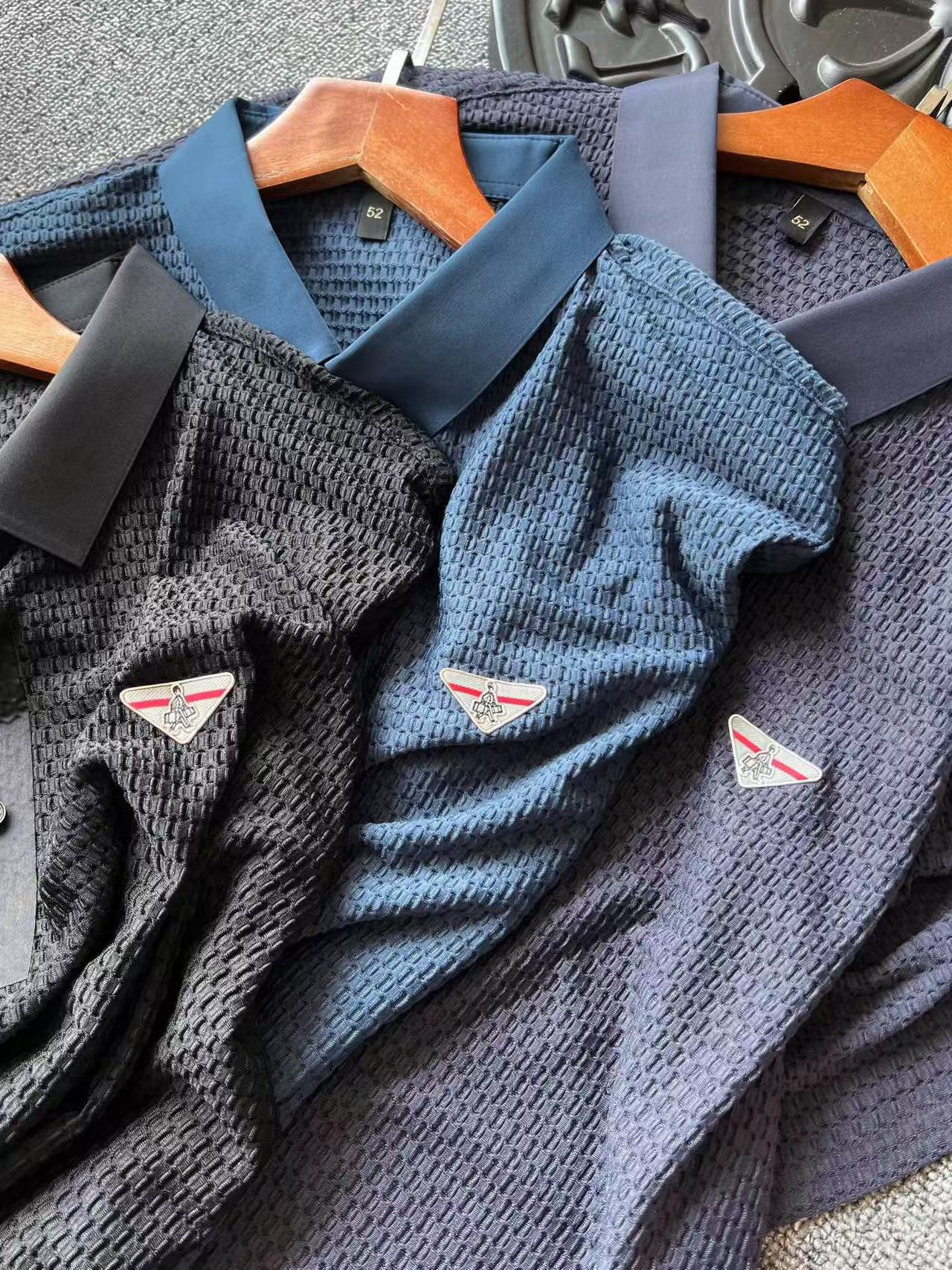 细节细节再细节 Prada专柜液氨冰氧锦棉无痕Polo衫 面料3D高频凹凸工艺 极具质感 胸前采用进口TPU金属拉丝倒三角内里镶嵌小仆人公文包标识 灰红组合底色 精致感满满 从领口门襟到双袖下摆全部做了无缝压胶锁边工艺 做到久穿不变形不卷边