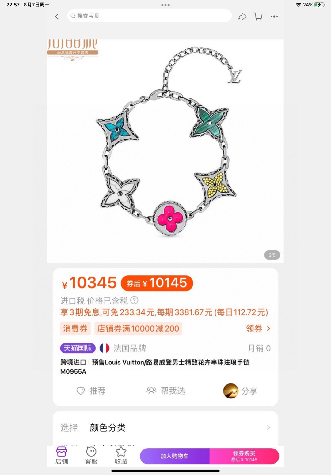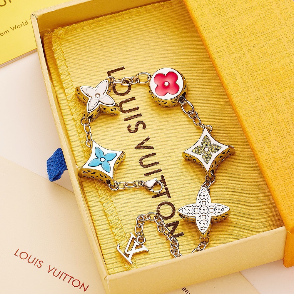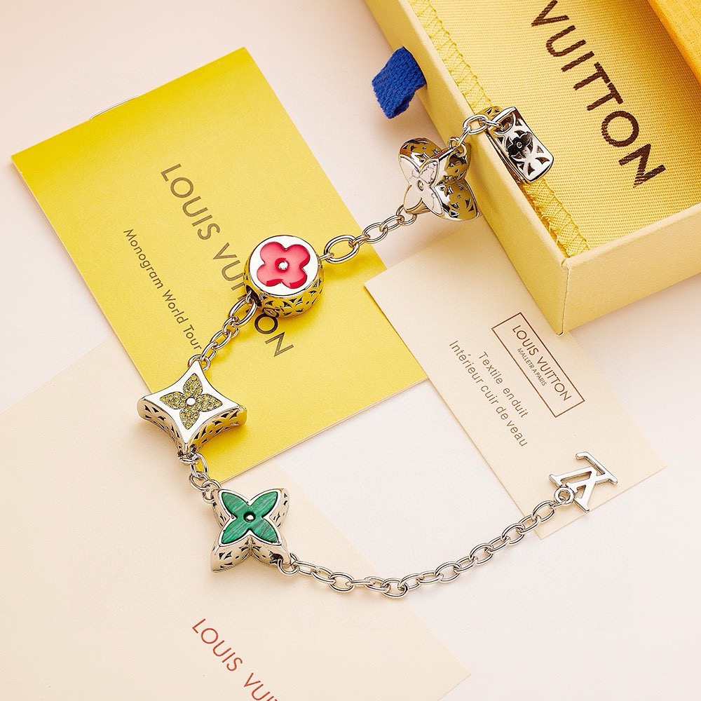 LV路易威登五花带钻手链 配全套包装 MNG BigParty手链以Monogram花卉串珠构筑奇趣美学 多彩珐琅 宝石效果树脂 人造水晶和金属彰显品牌精湛匠艺 LV字母点缀可调节链条 详细特征