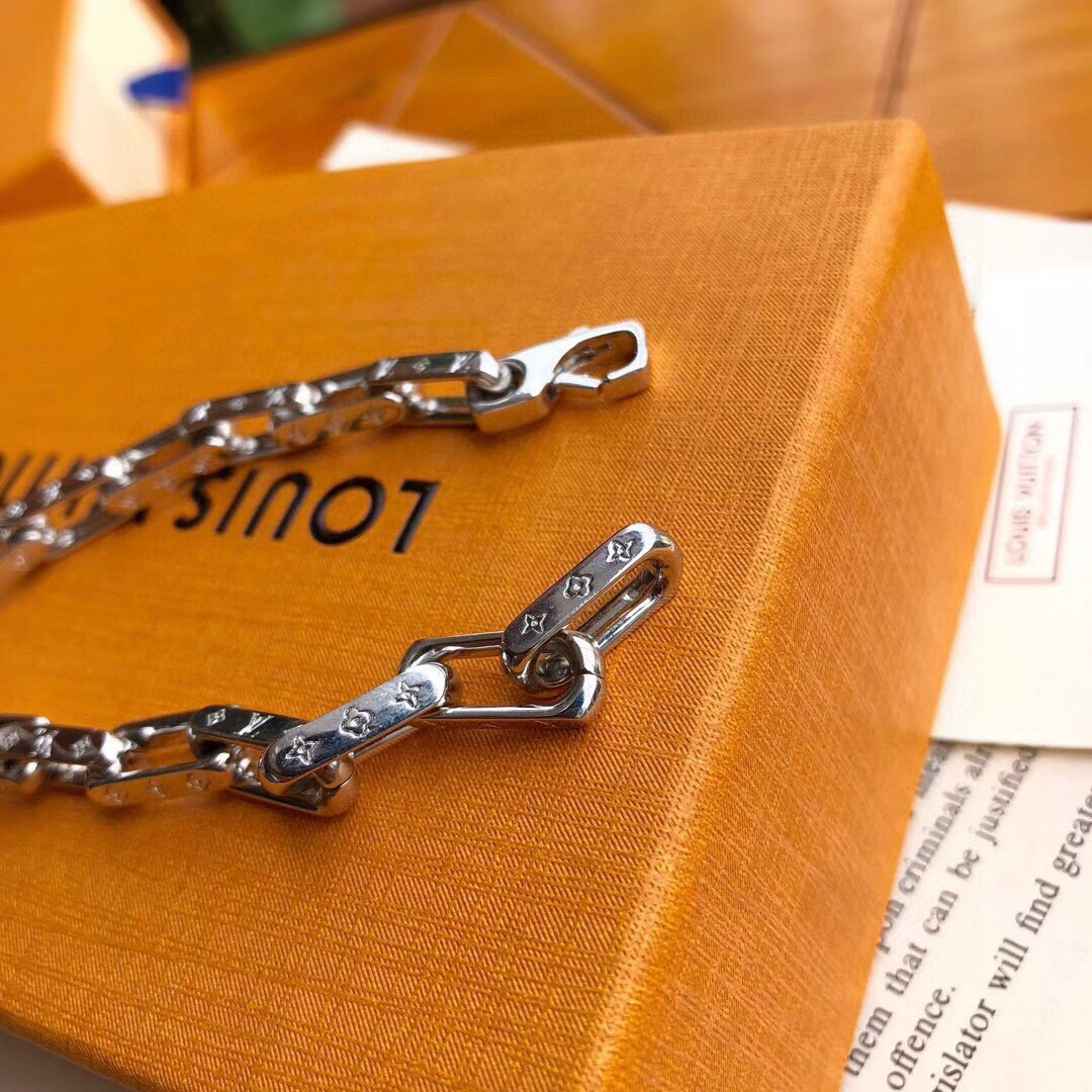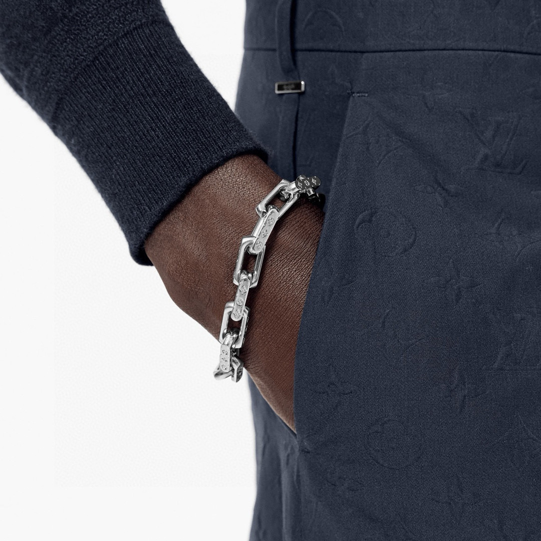 Monogram 手链以当下潮流思维诠释路易威登的经典珠宝主题 大号银色金属链铭刻别致的 Monogram 图案 既是本季新品 又传承着品牌经典设计的内涵