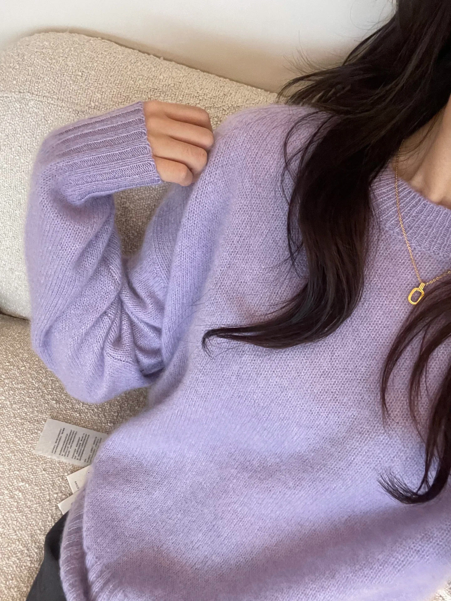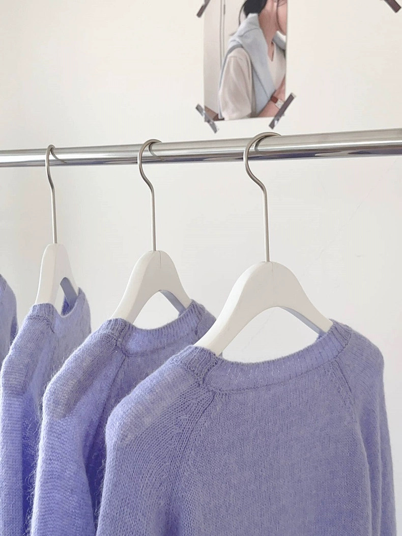 让人眼前一亮的色彩感 星黛露紫 显白高级 不易撞衫 市面少有类似 这个紫色像清晨雾中的薰衣草田 又像加了双倍奶霜的香芋拿铁 饱和度刚好落进视觉舒适区 衬得肤色像裹了层柔光滤镜 这种紫是 情绪缓冲色 没有黑色的沉闷 少了粉色的甜腻 裹在身上时 连呼吸都跟着慢下来 衣身的剪裁是微宽松的H型 不挑身材的同时 又不会像oversize款那样压个子 领口是恰到好处的圆领 不贴颈的宽松度 既能露出一点纤细锁骨 又不会在穿内搭时显得臃肿 叠戴项链时 满满精致感 肩袖一体设计 简洁不累赘 贴合身形 视觉上更显干净利落 暖冬天气 没有厚重的外套 单穿也非常好看 不管是北方室内暖气房 还是商场 空调房内 单穿或者叠穿各种毛呢外套 羽绒马甲 风衣 羽绒服合适 显瘦耐看 绝绝子