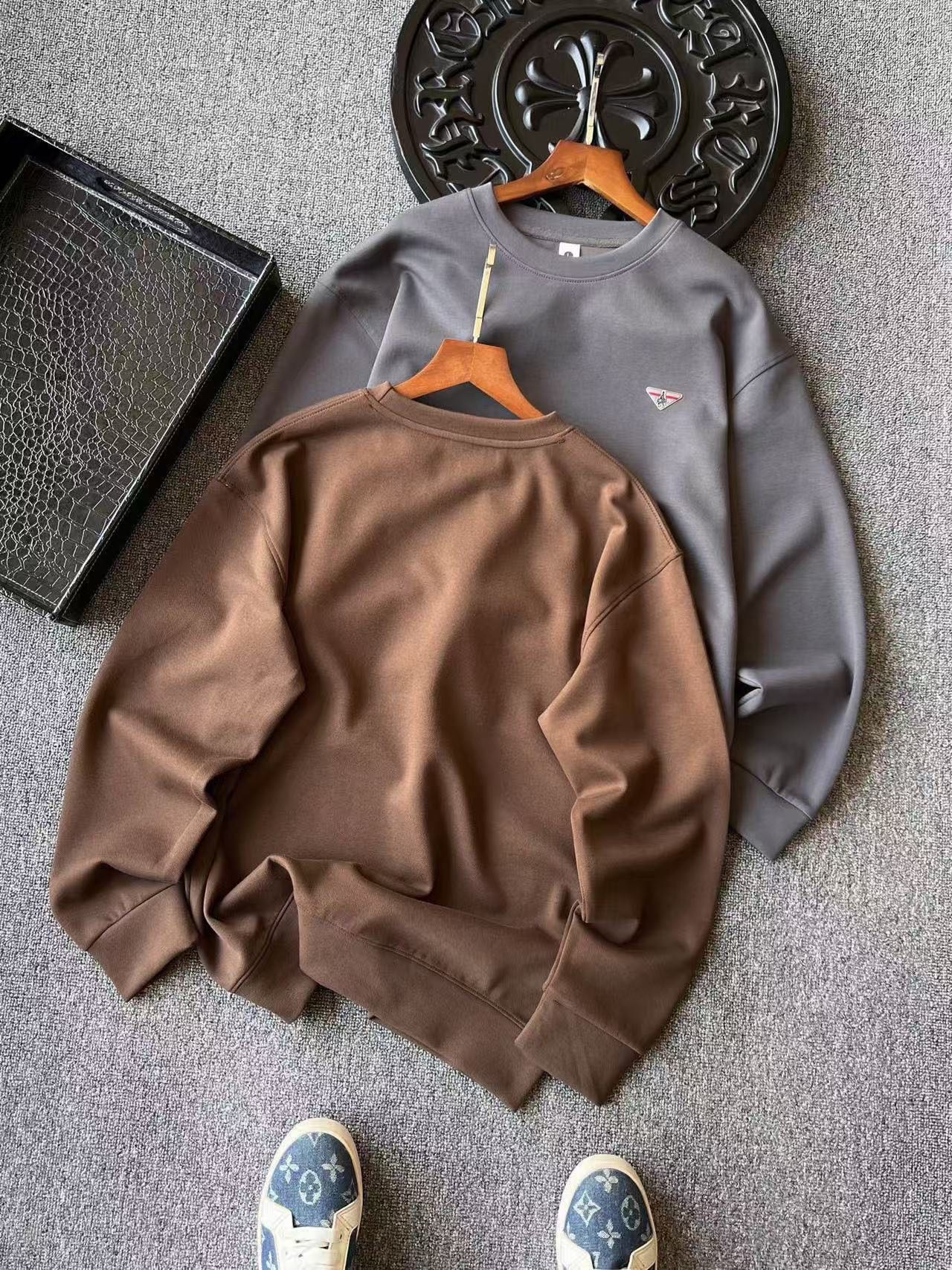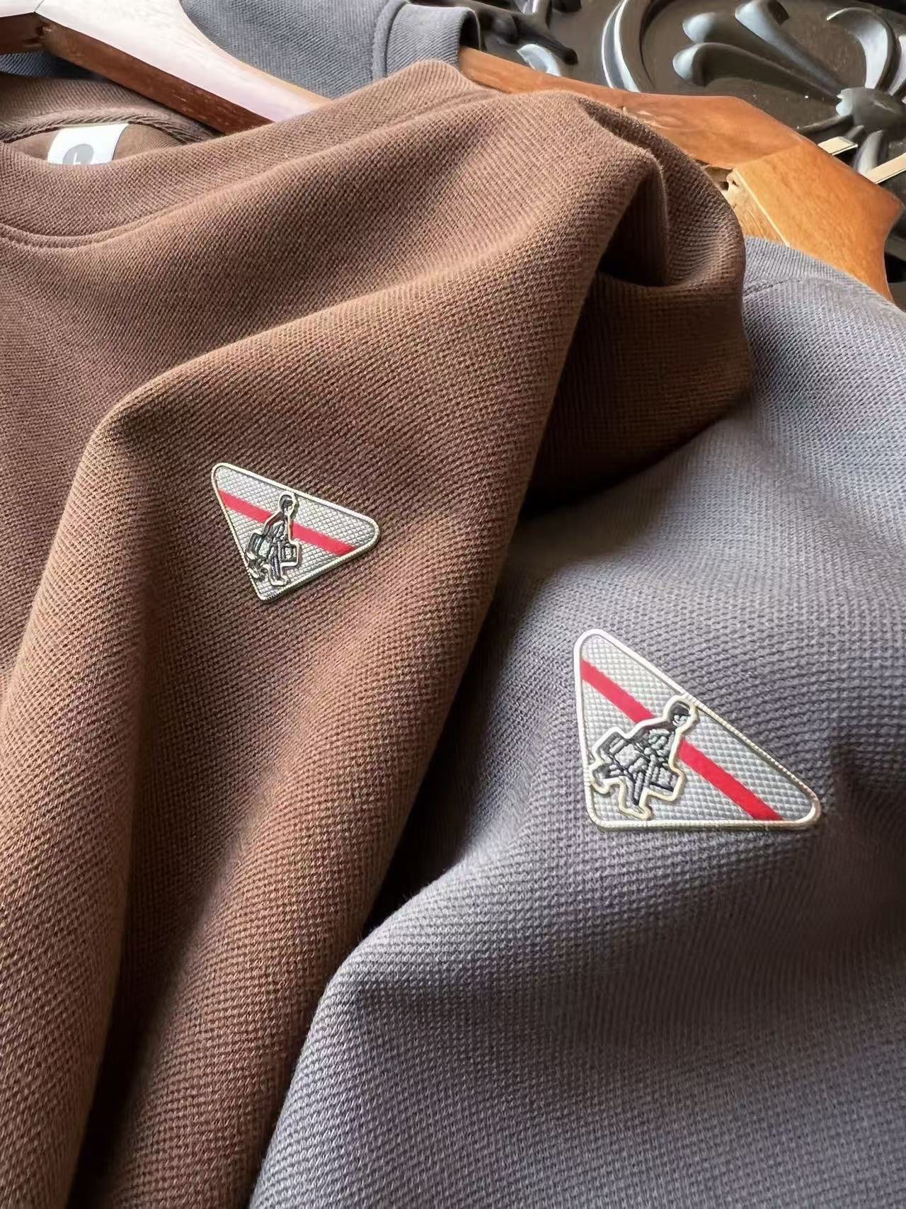 细节细节再细节 Prada小仆人公文包专柜新品高奢圆领卫衣 全身精致简约 纯正摩卡色以及高级水泥灰 胸前采用进口TPU金属拉丝倒三角内里镶嵌小仆人公文包标识 灰红组合底色 精致感满满 所有拼接接缝处全部做了双针压线 精湛做工天花板