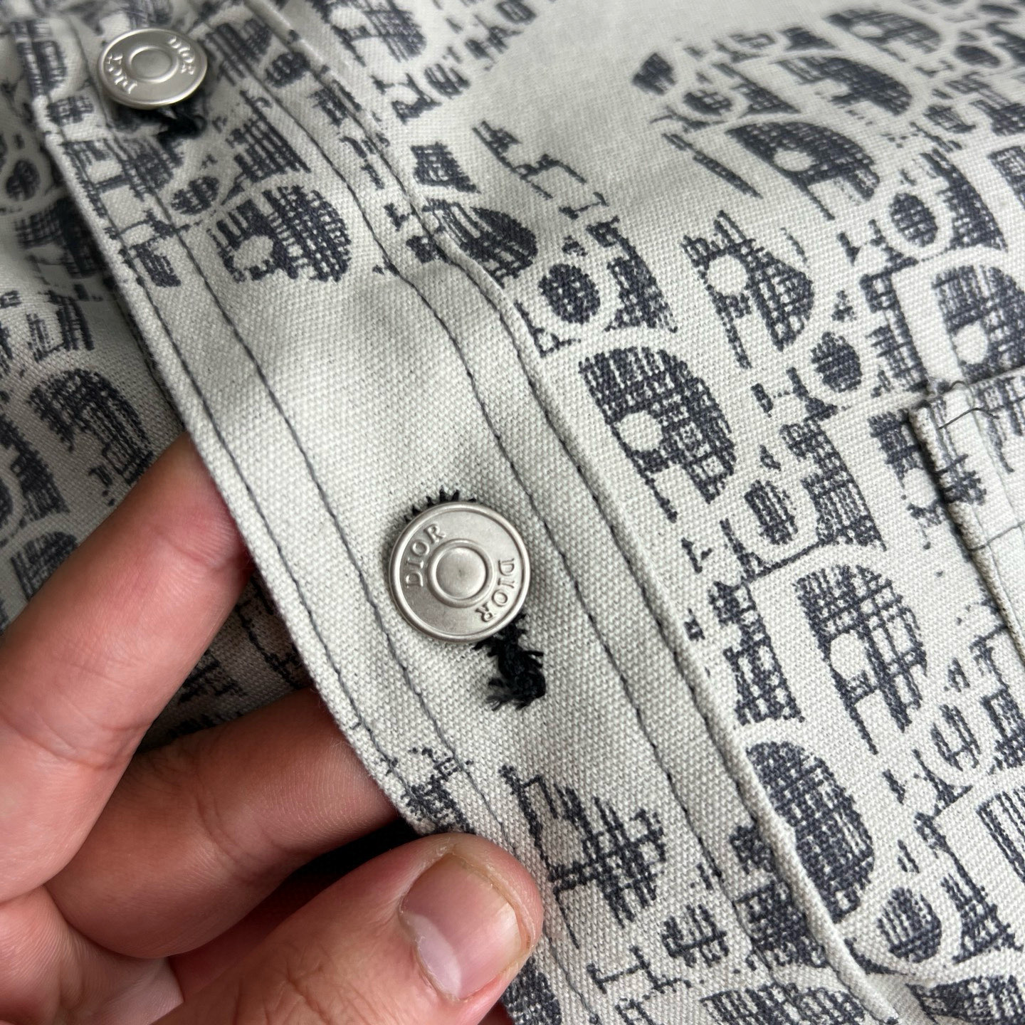 面料定制纯棉质牛仔布 手感细腻柔软 质感挺廓有型 白色漂白印花 做旧仿补丁刺绣效果与原版一致重工精致 定制原版银色带logo扣子 细节感满满