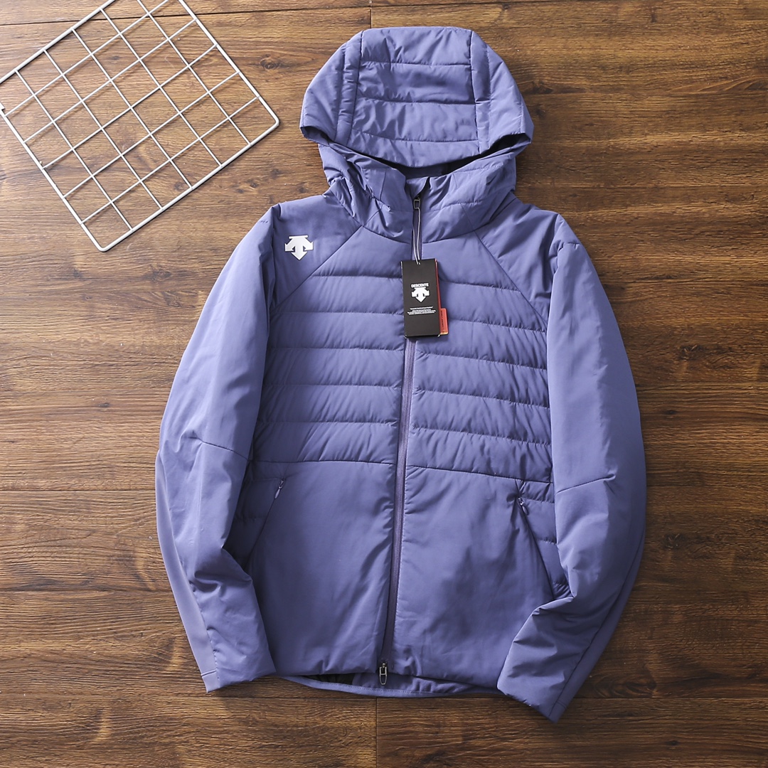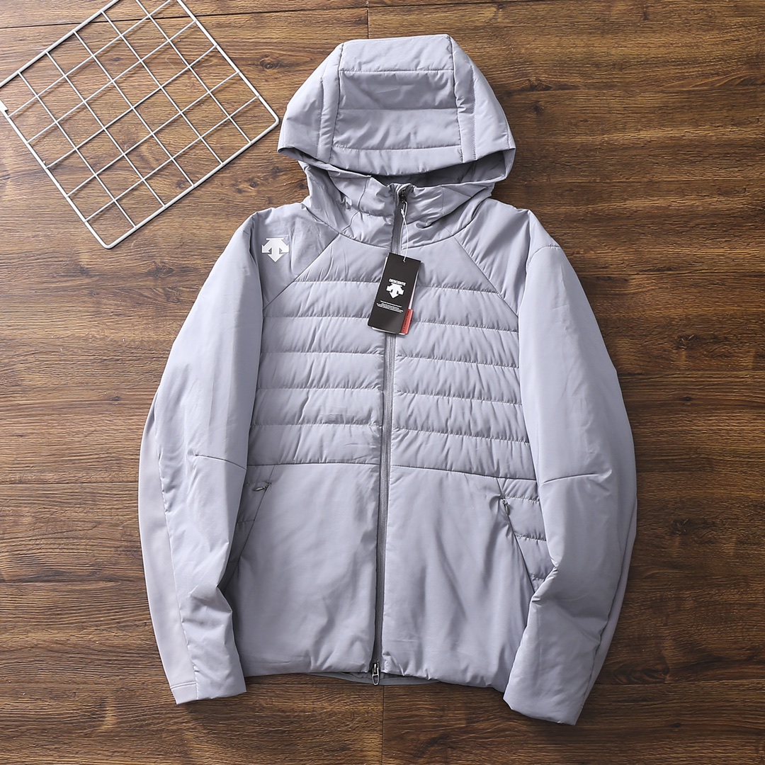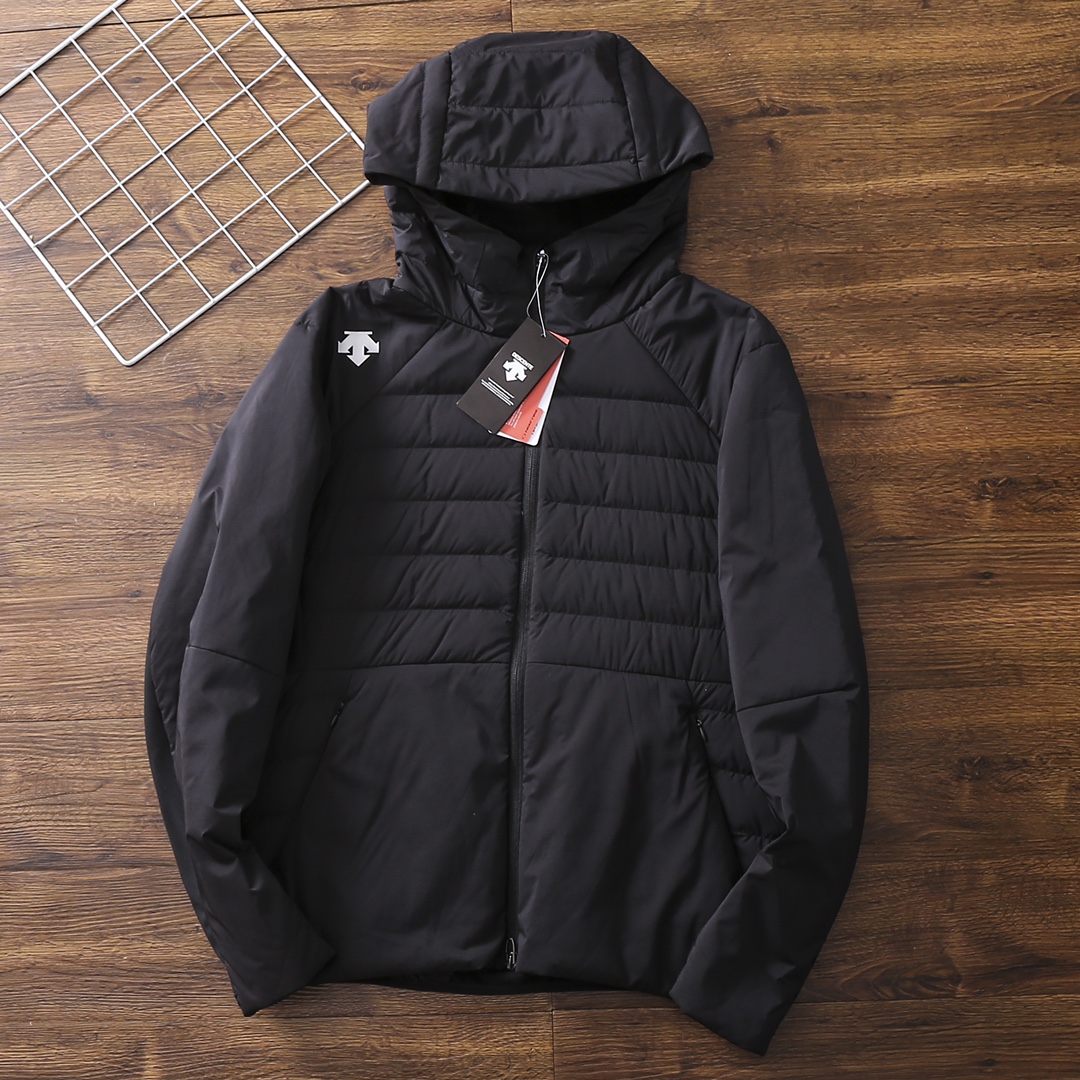 严选好货 DESCENTE迪桑特新款男士轻薄款连帽羽绒服外套 经典时尚款 客供超轻羽绒专用科技面料 内里白鸭绒填充 轻盈蓬松 保暖舒适 3D立体裁剪版型 腋下 袖子弹力加绒面料 拼接设计 更具舒展性 满足运动时的扩张需求 后腰拉链口袋设计 原版五金辅料 做工细节都无可挑剔 上身效果一级棒 喜欢的兄弟不要错过 颜色 黑色 灰色 卡其色 蓝色 尺码 4一12