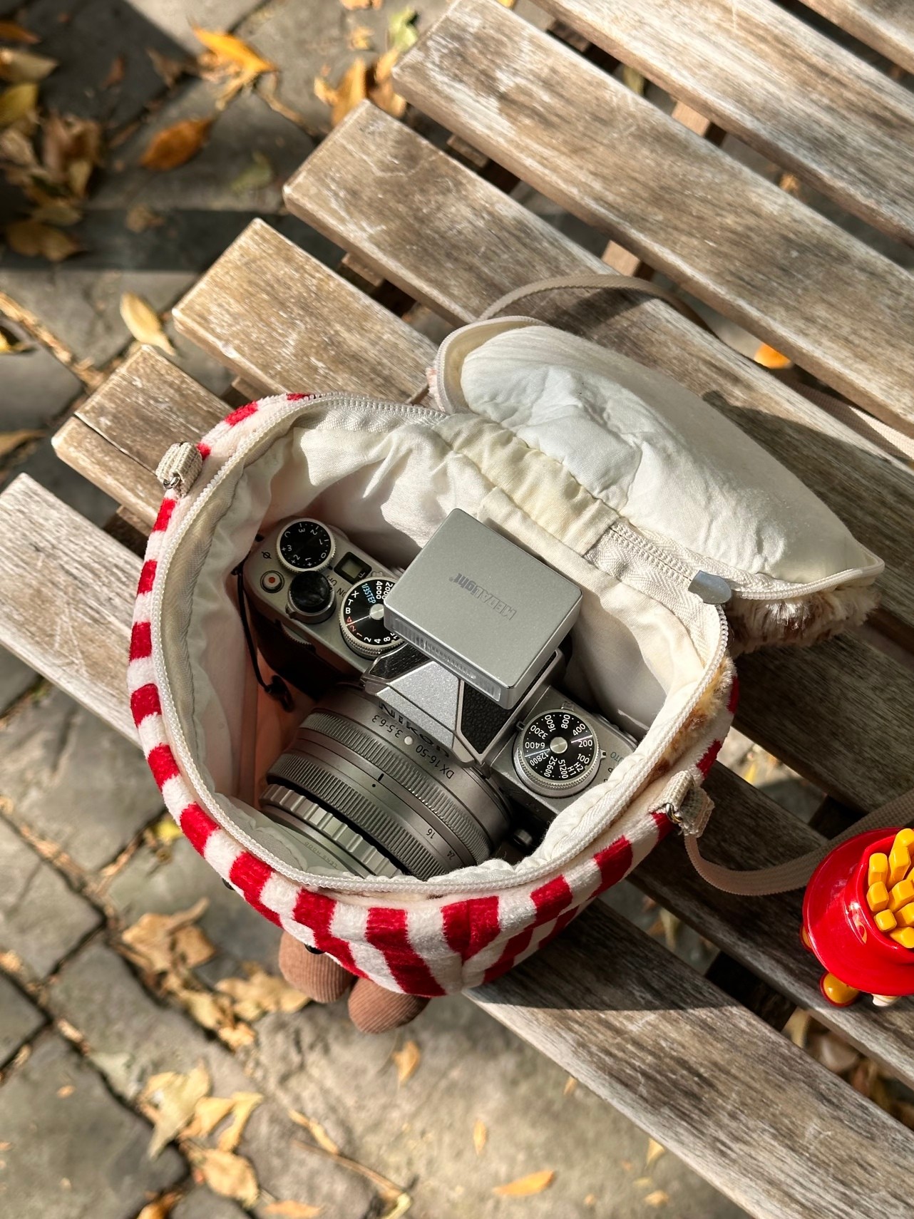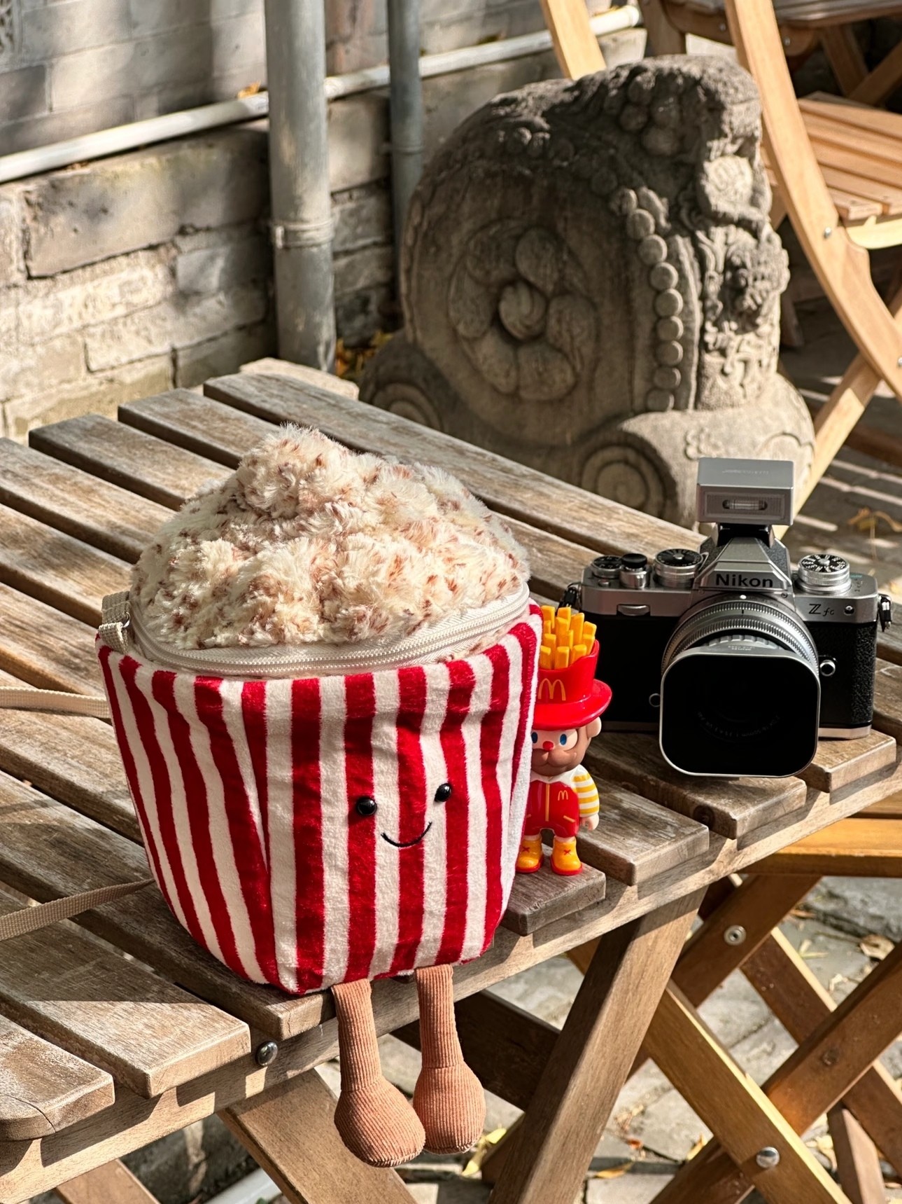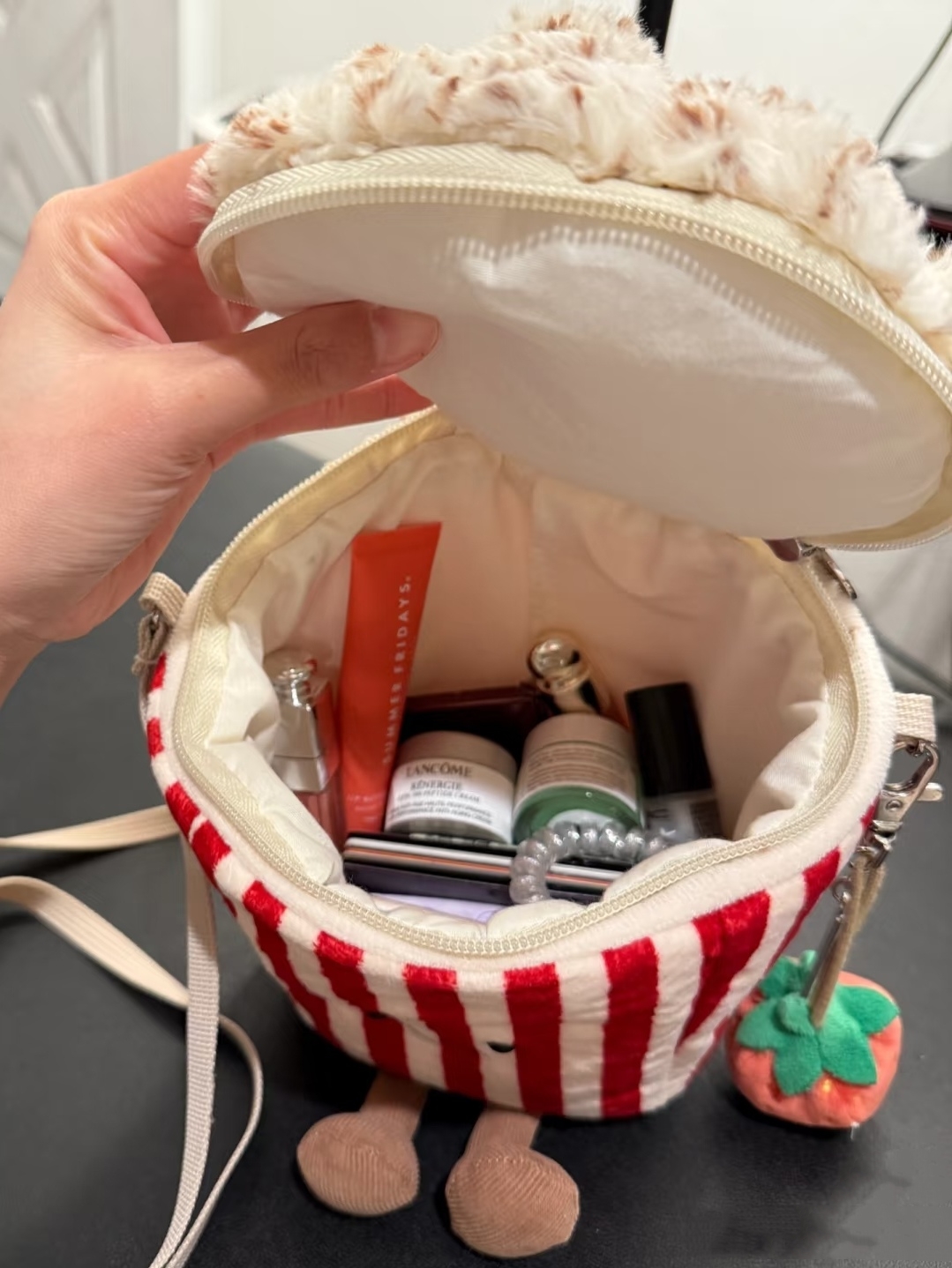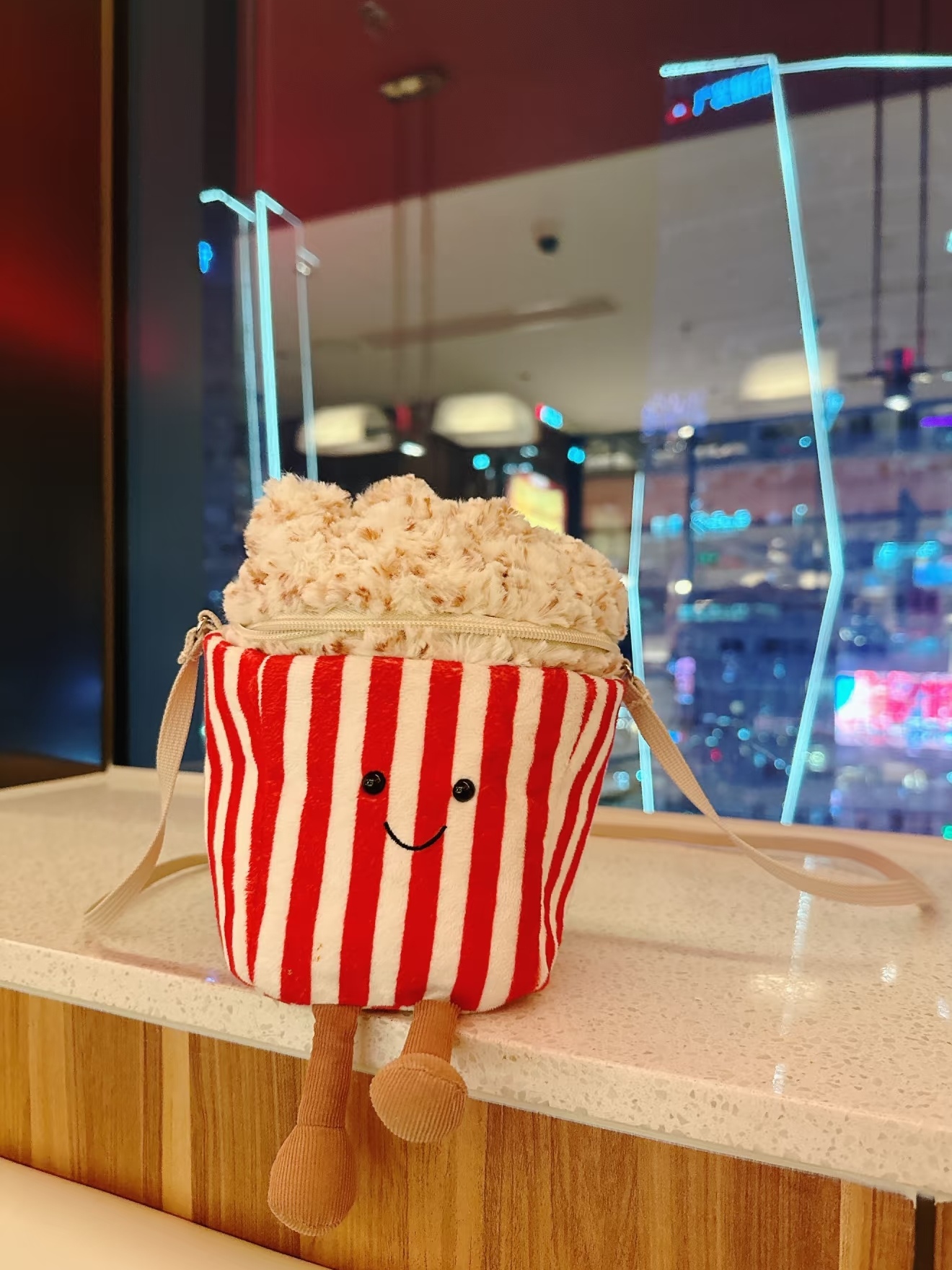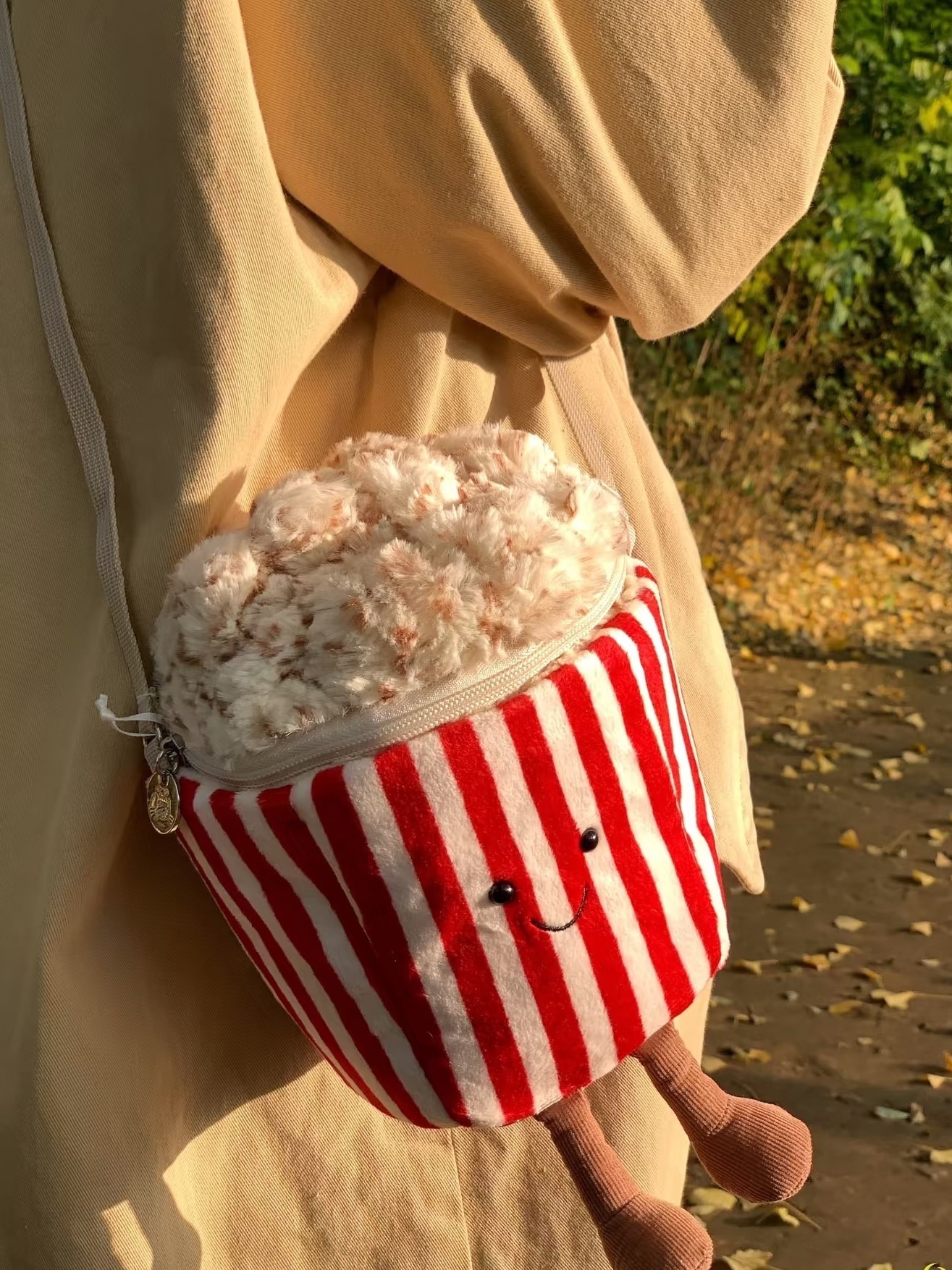 以经典红白条纹爆米花桶为设计原型 瞬间拉满童趣氛围 包身采用柔软的布艺材质 红白竖条纹配色还原了爆米花桶的经典视觉 正面绣有小巧的黑色圆眼和弯弯的微笑线条 赋予了包包拟人化的萌趣神态 顶部的 爆米花 部分用蓬松的毛绒材质打造 纹理逼真又柔软 还做了拉链开合设计 兼具装饰性与实用性 包包配有细巧的白色肩带 可斜挎也能手提 下方还垂着两只小巧的布艺小短腿 灵动又可爱 整体尺寸适中 能放下口红 钥匙 耳机等小物件 既是个性十足的穿搭配饰 又能作为萌趣的收纳小包 不管是日常出街还是游乐园打卡 都能成为吸睛的时尚单品
