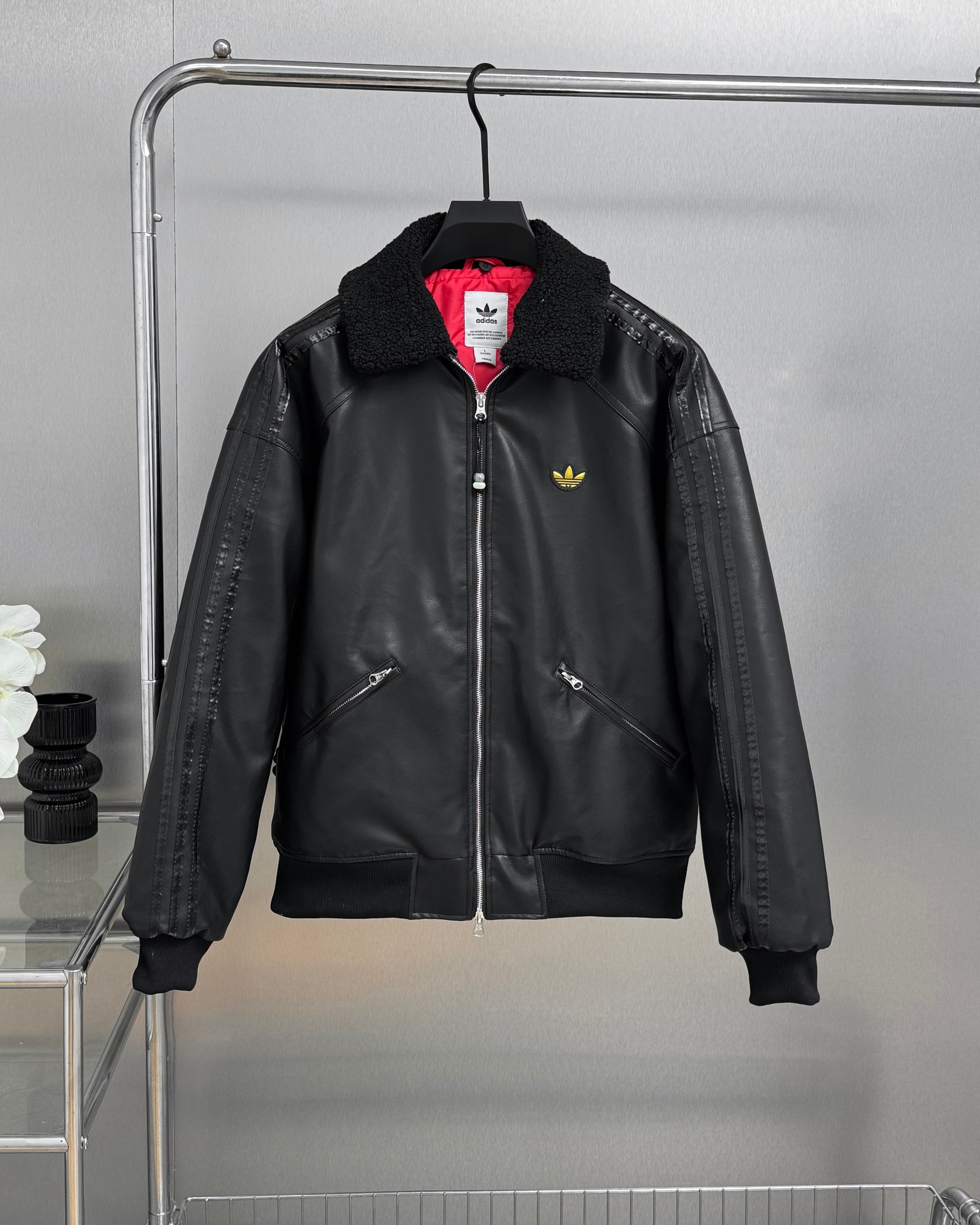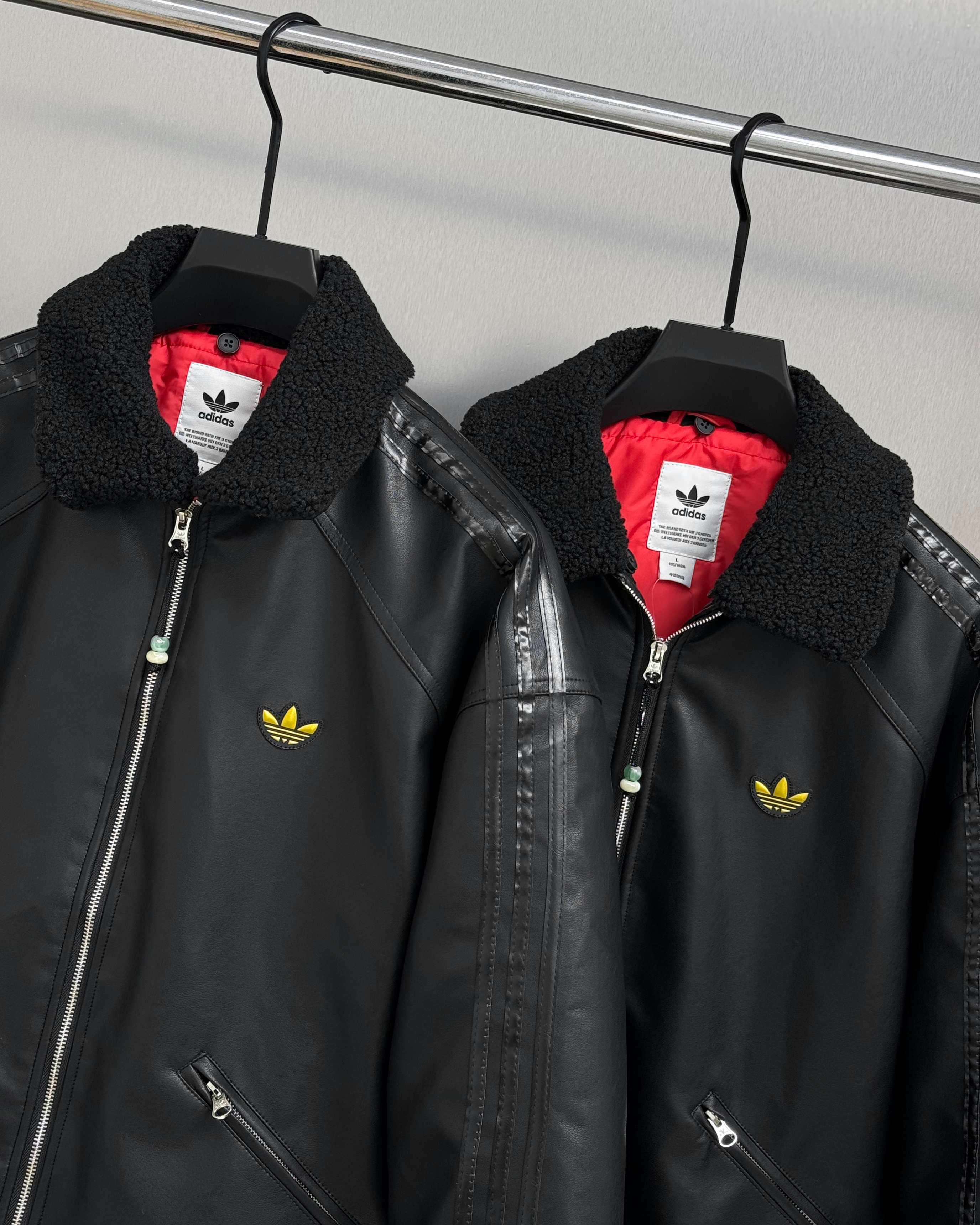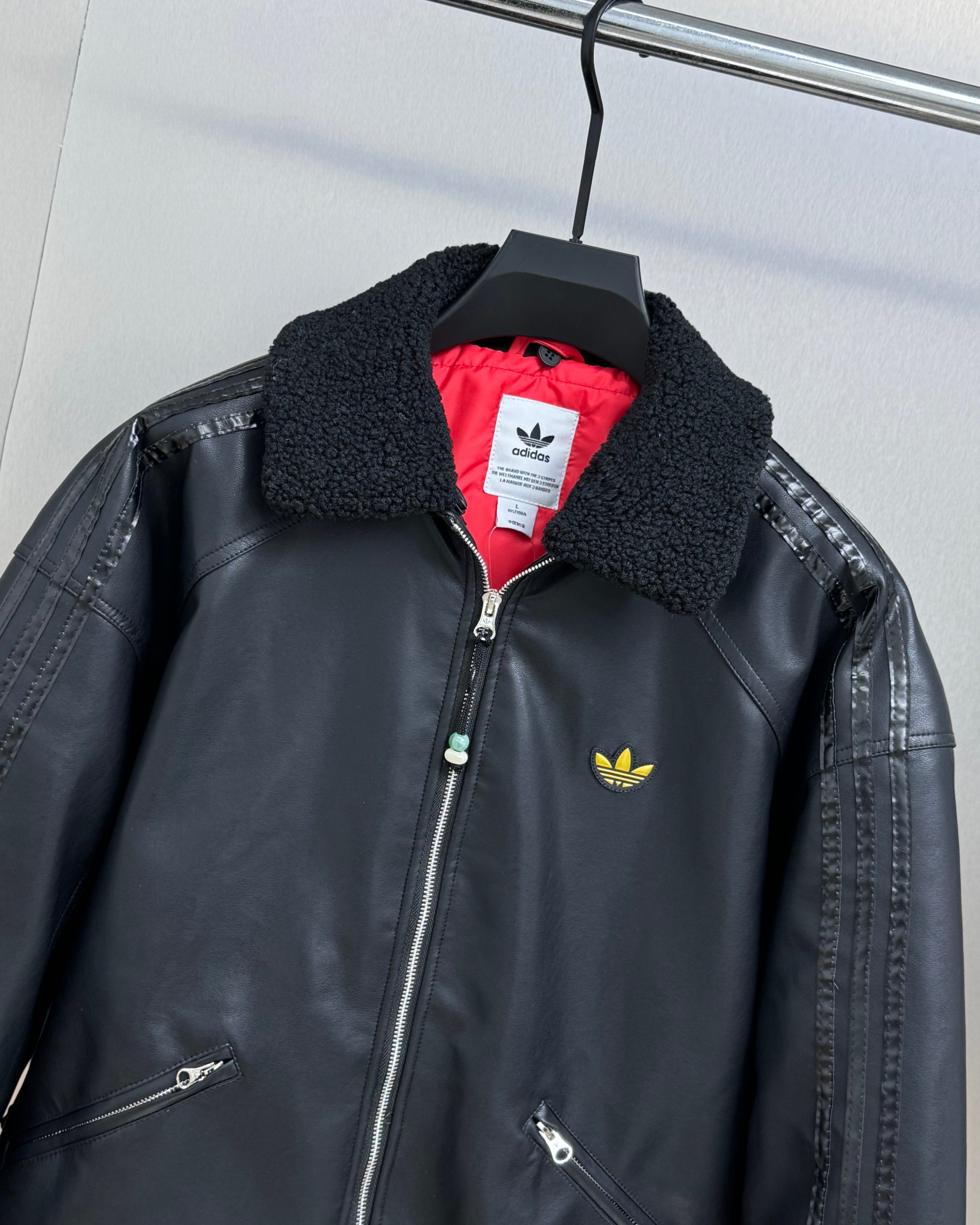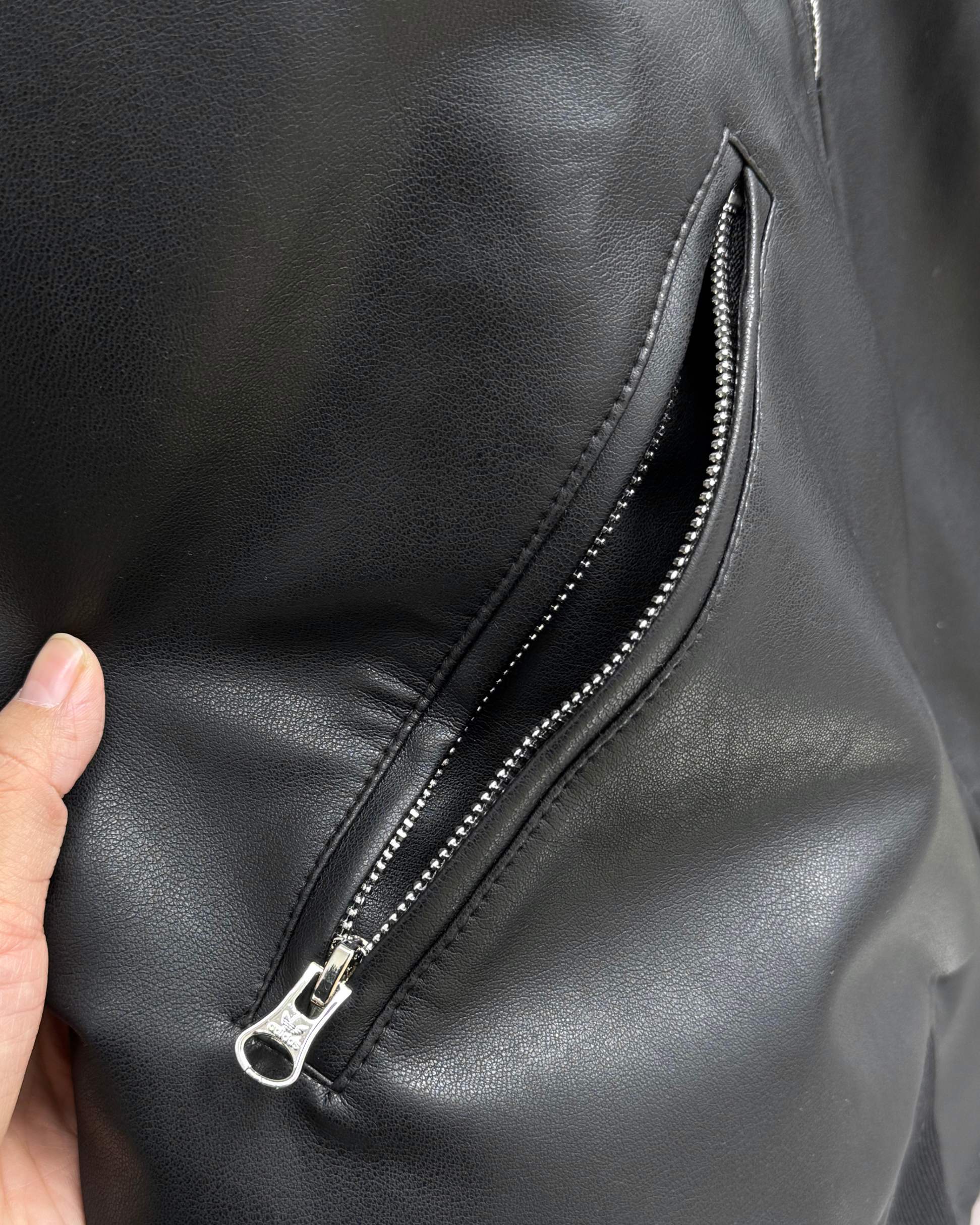 全套定制辅料 面料采用定制pu皮面料 原版钢印开模 皮质柔软 保暖又不会显臃肿 整件衣服原版剪裁设计非常个性 立领夹克的版型上身超酷 胸口经典刺绣logo搭配纯色整体 简约又不简单 下摆两侧都有口袋 定制拉链有三叶草logo 定制玉坠绝对的用心之作 百分百还原 插肩袖的版型尽显复古风 男女同款上身效果百搭