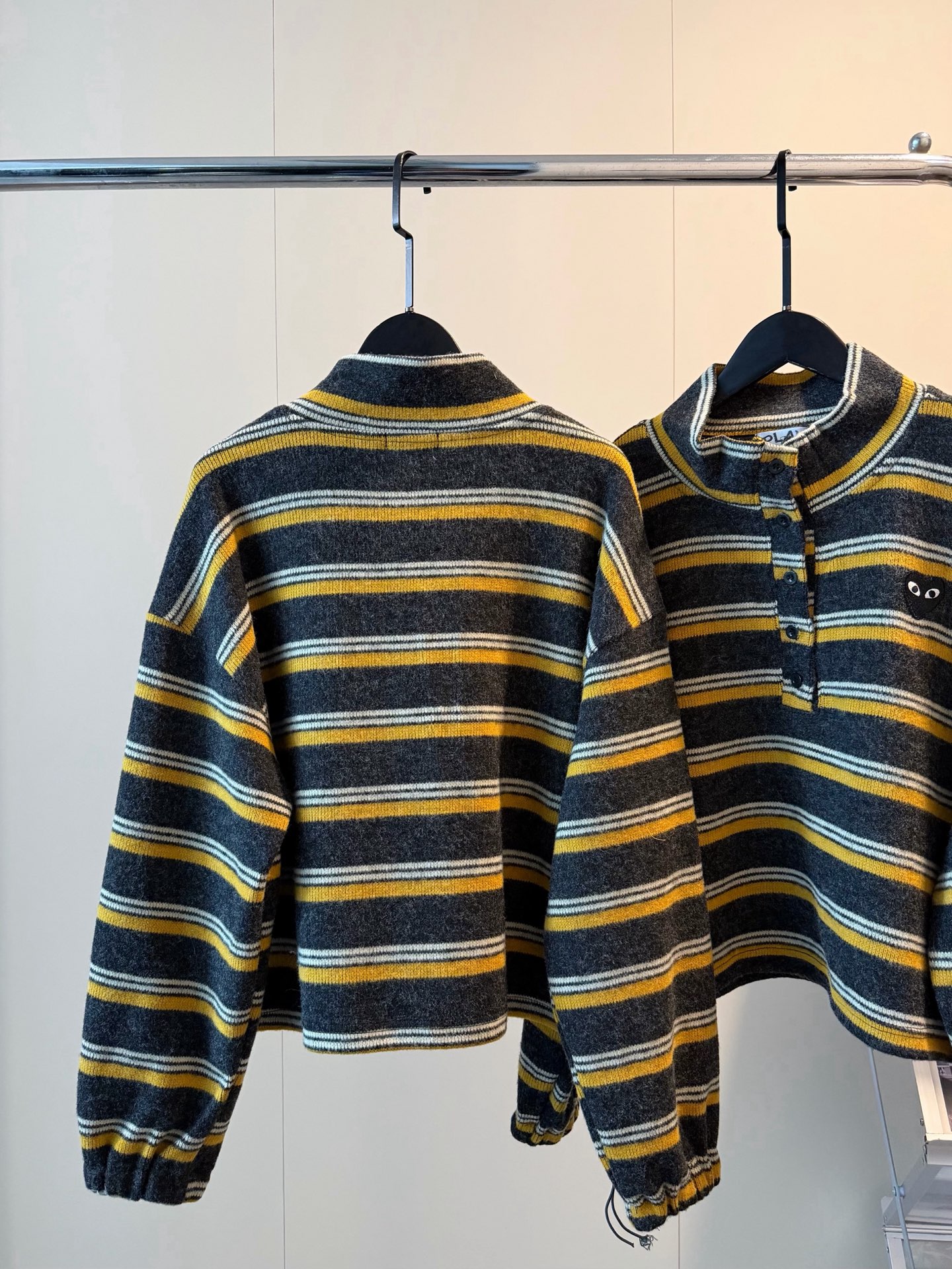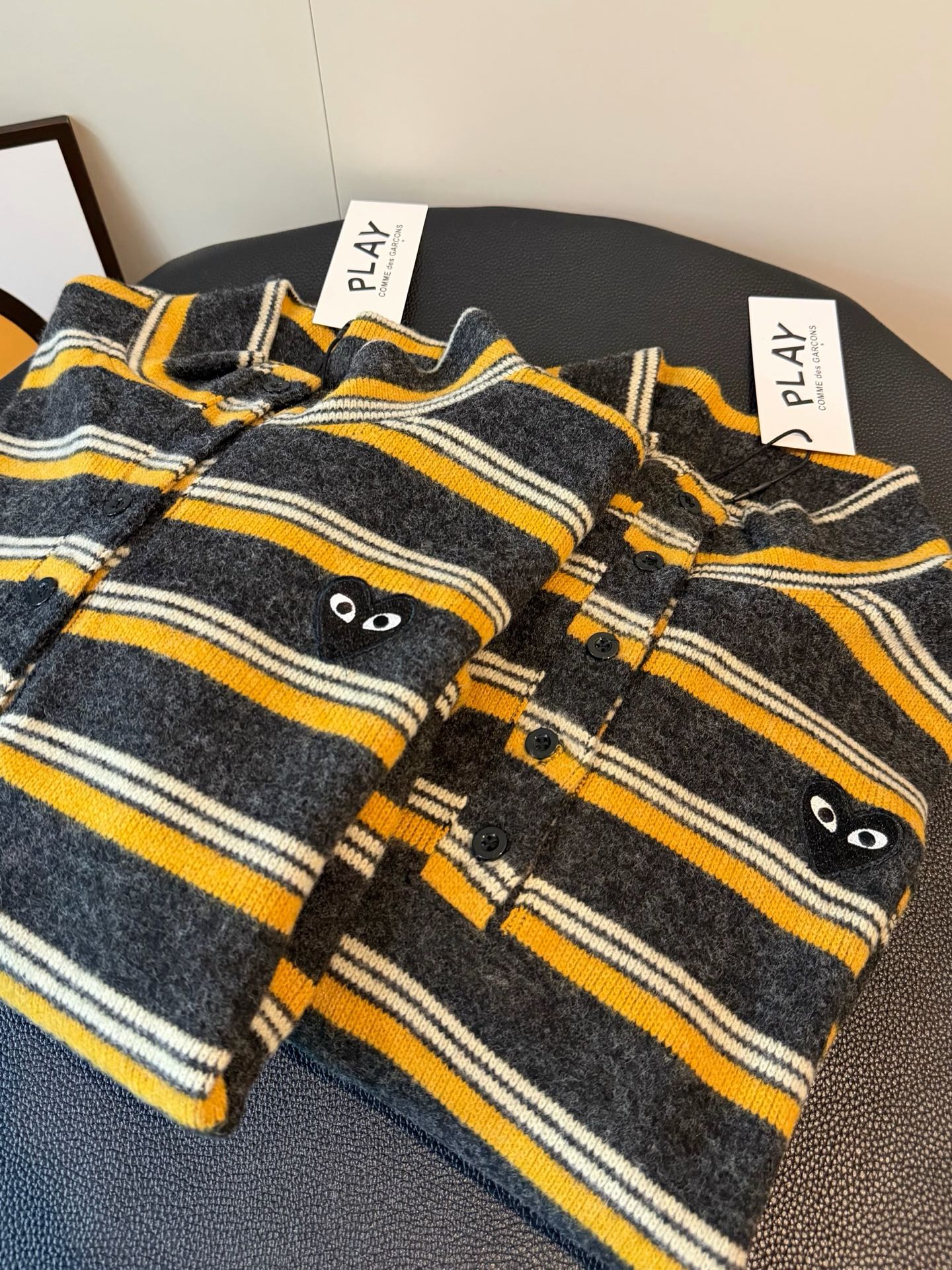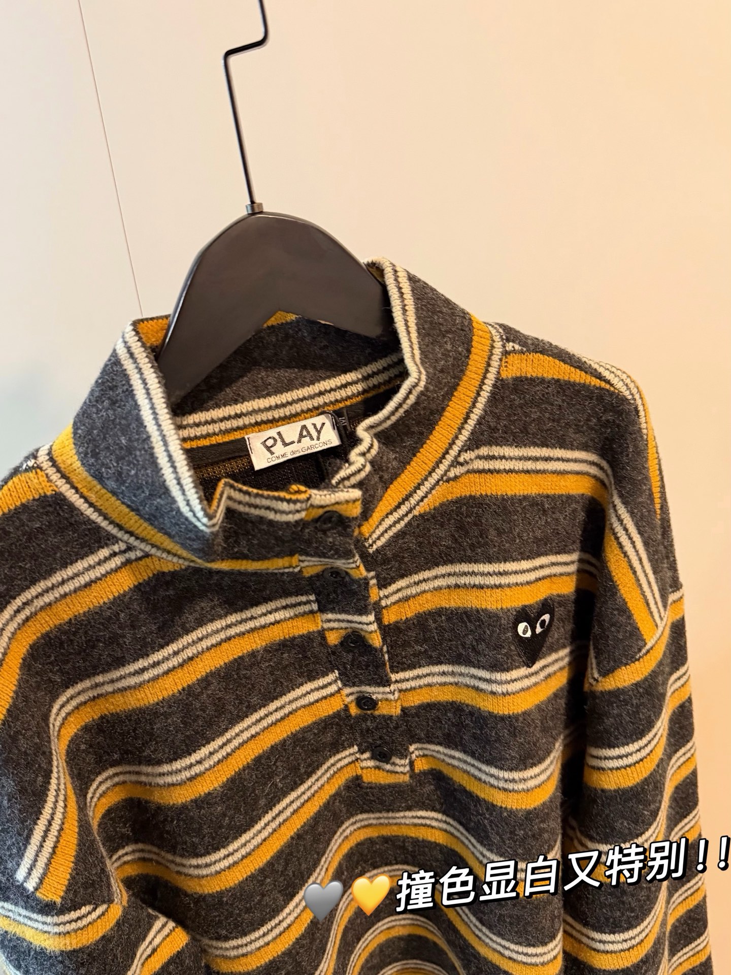 CDG川久保玲PLAY羊绒爱心刺绣撞色条纹短款纽扣磨毛卫衣
