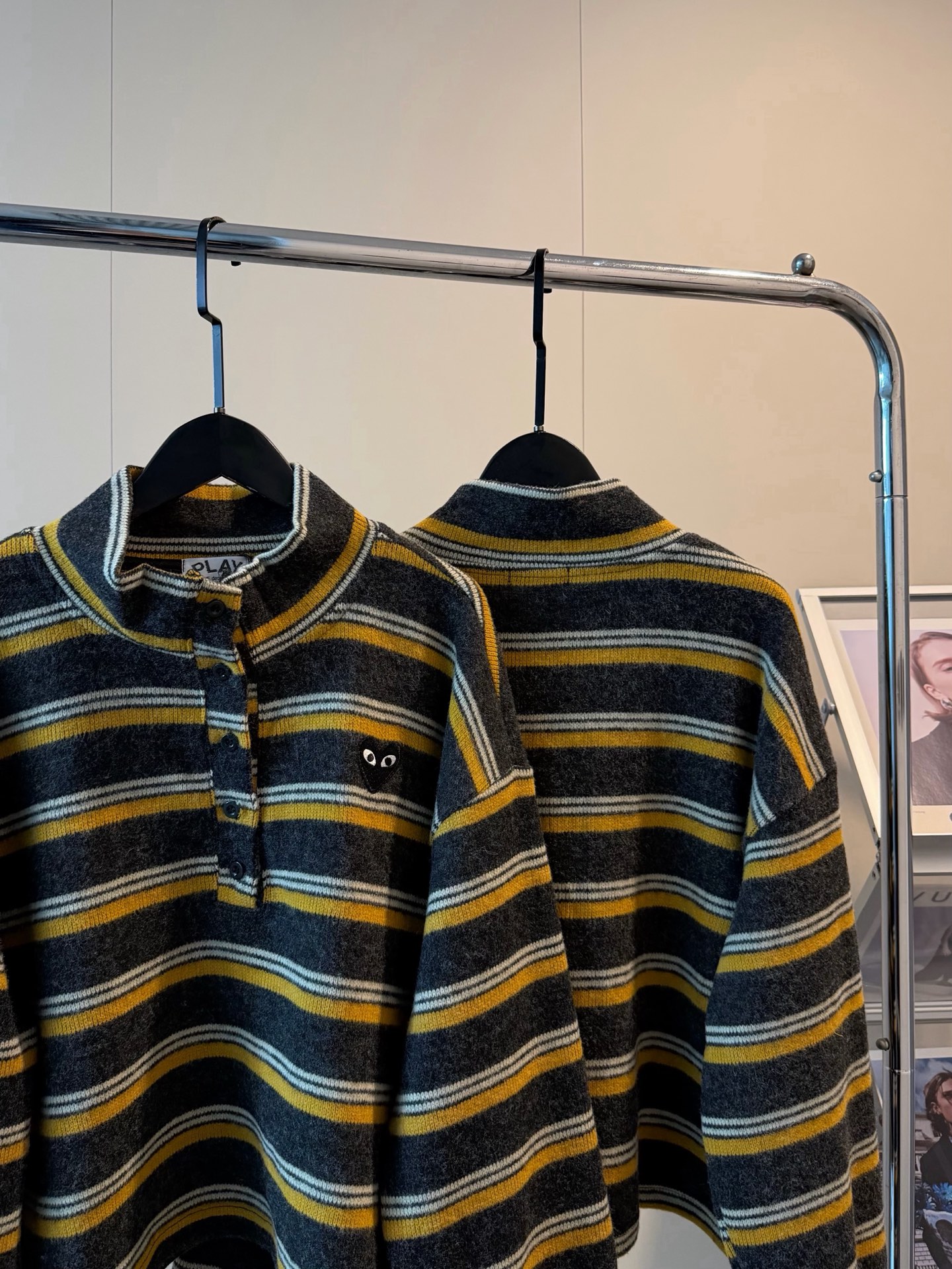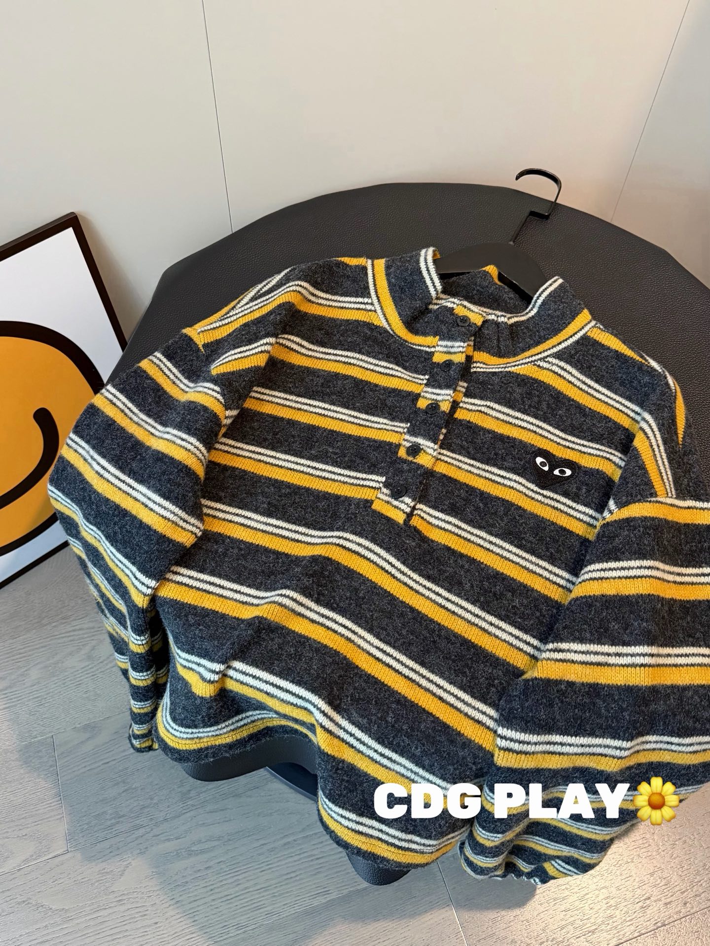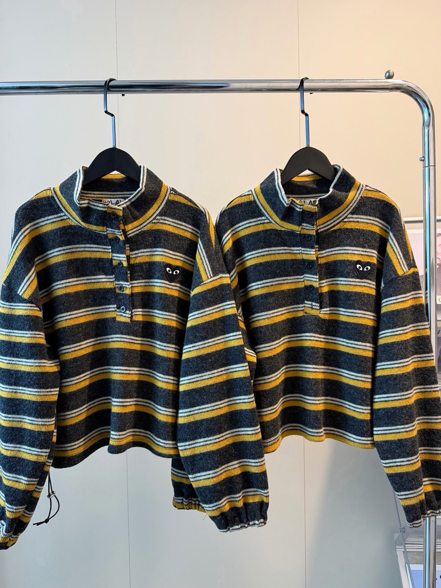 CDG川久保玲PLAY羊绒爱心刺绣撞色条纹短款纽扣磨毛卫衣
