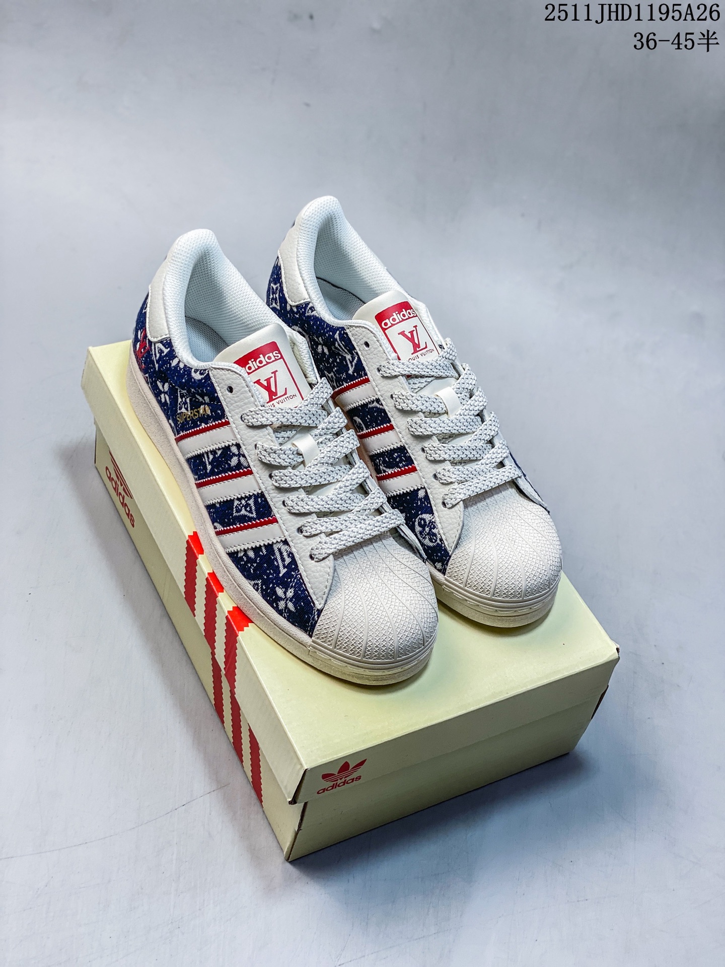 纯原 CLOT x AD Originals Superstar 金标 贝壳头LV联名限定 贴合柔软布料蓝彩印花配色 这双鞋的整体设计思路和风格可以说很CLOT 鞋款整体选用了易穿搭的白色作为主色调 而加厚的锯齿形外底以及标志性的贝壳头无疑把鞋款的独特属性进一步展现出来
