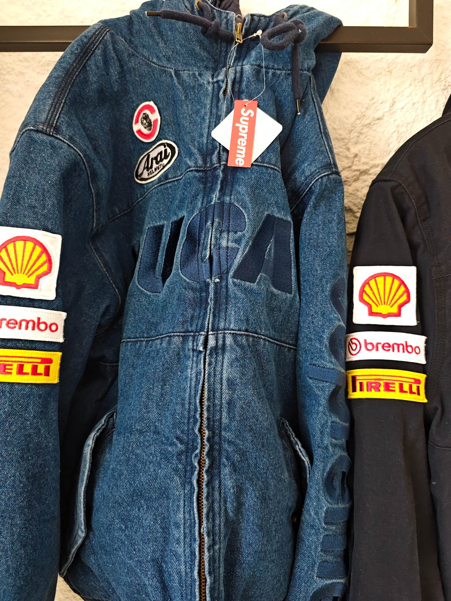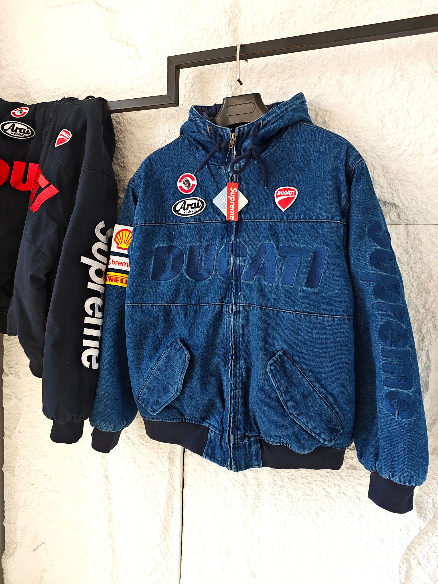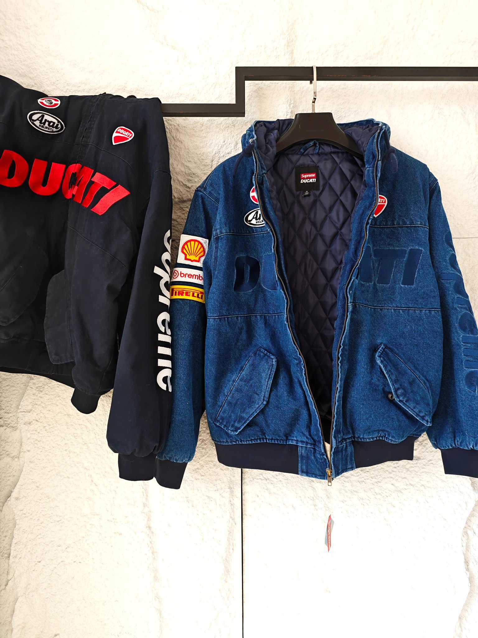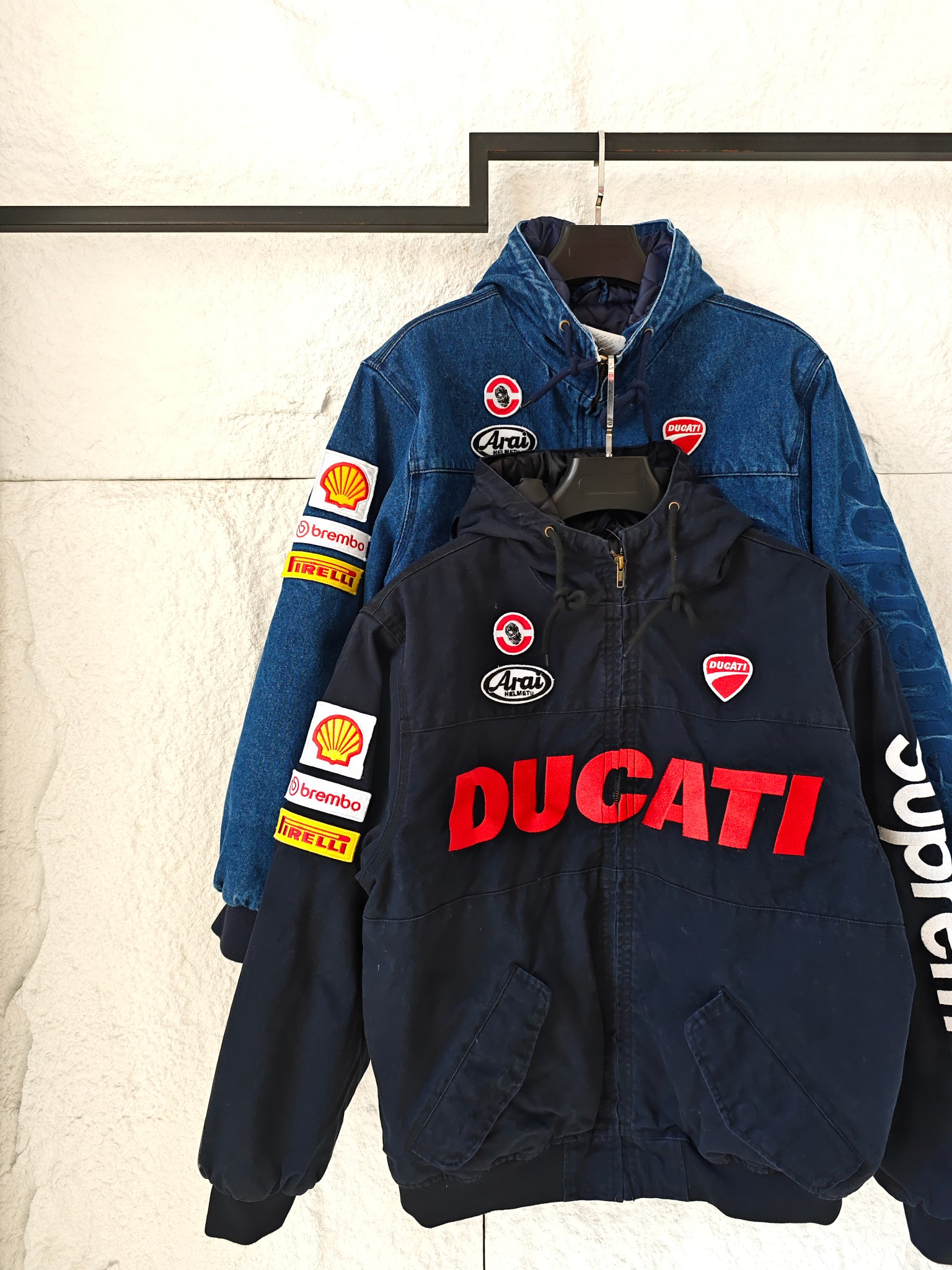 以专业赛车服为蓝本 杜卡迪标志性标识 Arai头盔 壳牌 Brembo 倍耐力等赛车圈经典赞助贴标铺满衣身 机车热血氛围直接拉满 侧边Supreme竖排大logo自带炸街buff 走到哪都是视线焦点