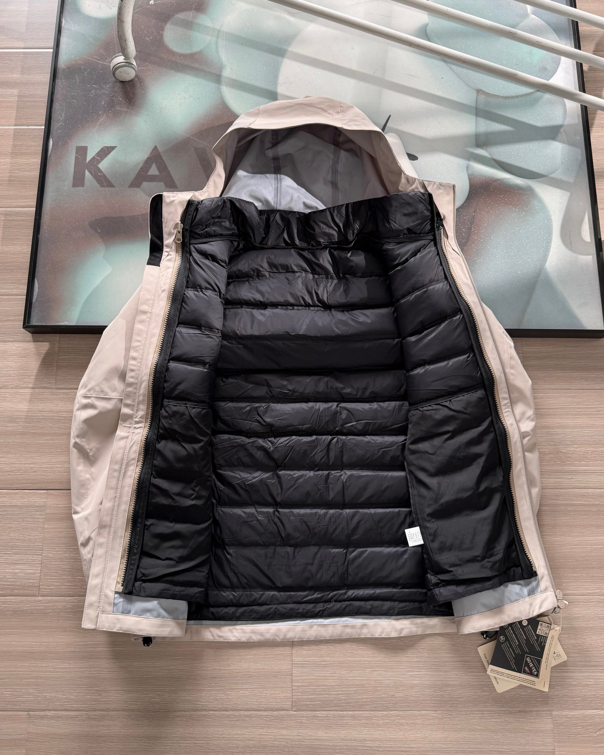 面料 采用原版B1297一比一定织定染GORE TEX硬壳三合一面料 防雨 防风 防撕裂 保暖透气 内丹为尼丝纺羽绒面料 双层内丹不跑绒