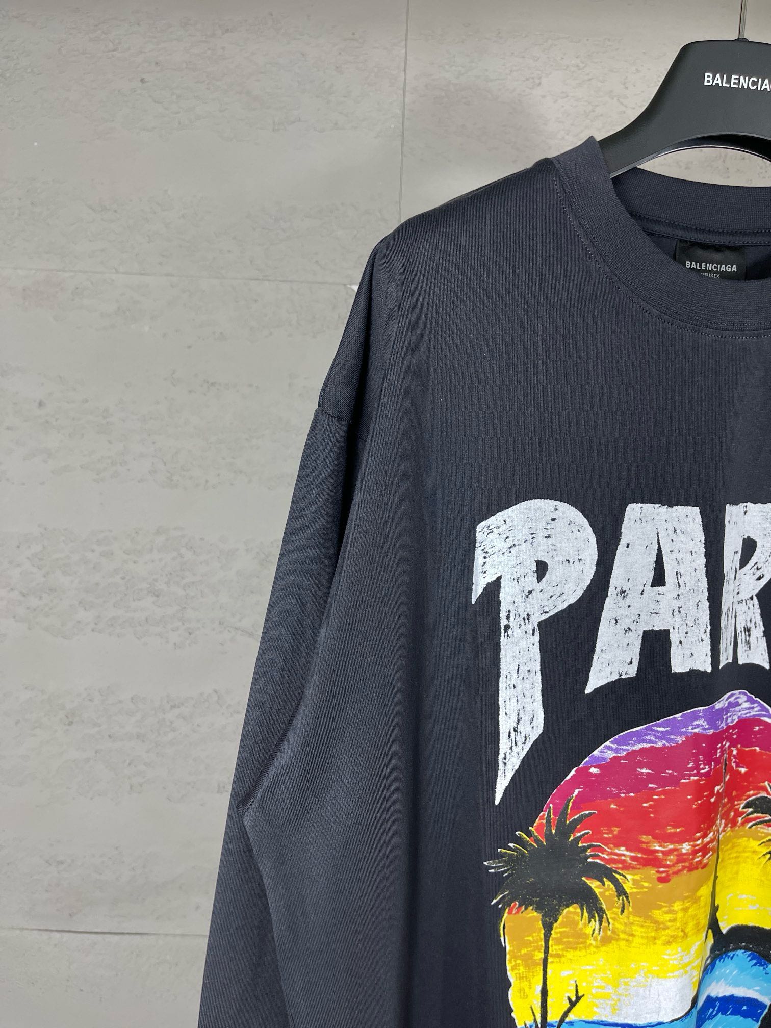 实拍图 顶级版本 官网品质 BALENCI GA 巴黎 夏威夷落日椰树铁塔LOGO图案长袖T恤 砖柜同步 面料采用巴黎ZP定织定染全棉卫衣 克重260克 布面干净 布纹清晰 柔软舒适 螺纹釆用定染无色差 经典图案印花采用进口机器直喷印花 效果立体 还原砖柜 巨别市场通货 欢迎对比 版型釆用OS宽松落肩版型 男女同款