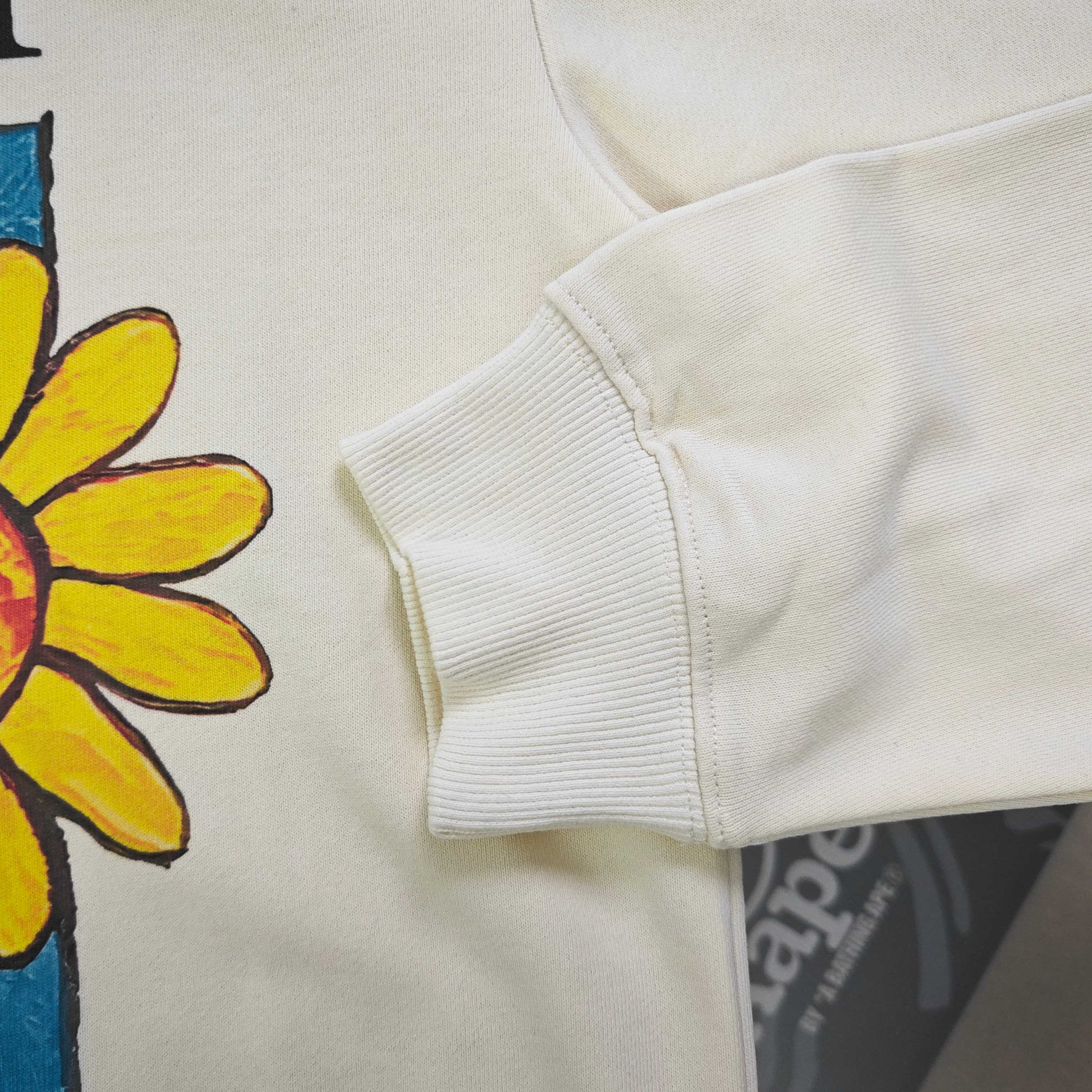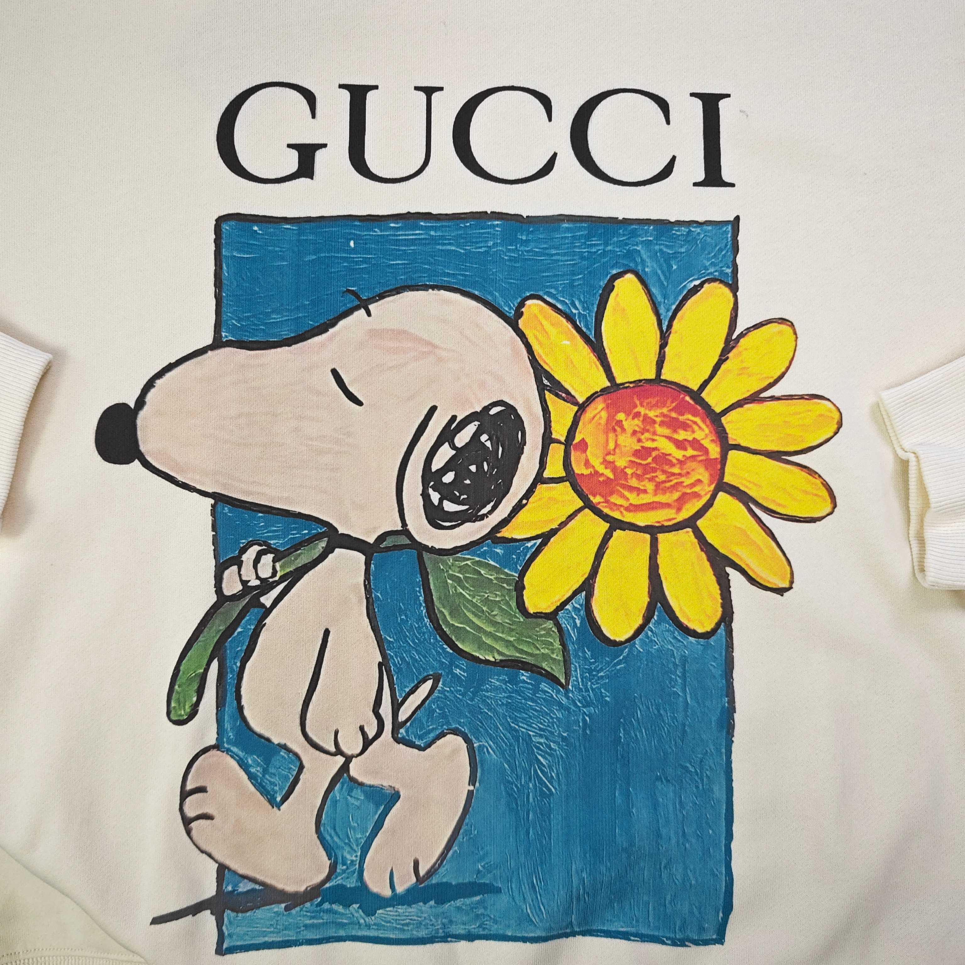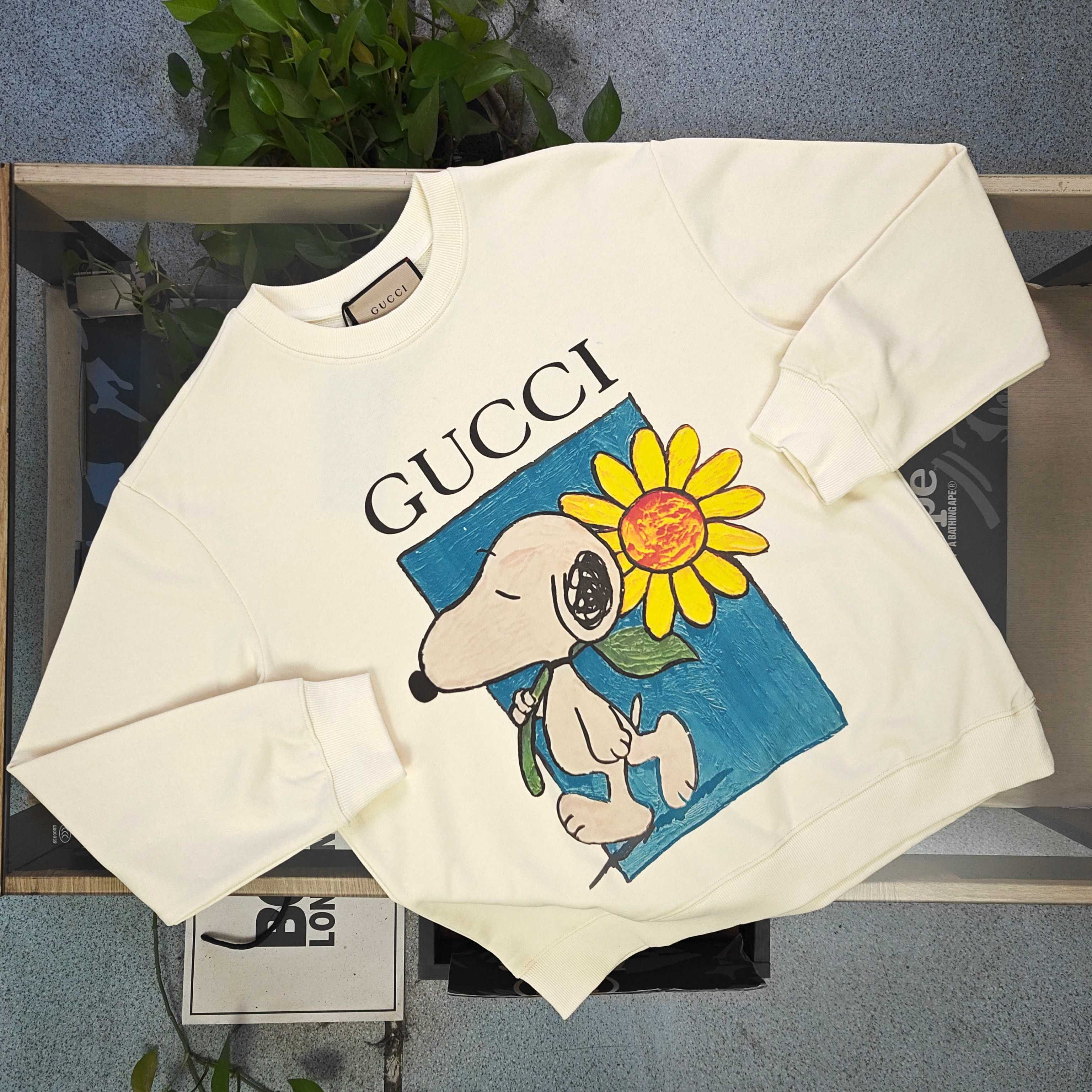 2025秋冬新款Gucci古驰史努比抱向日葵图案logo印花休闲情侣圆领卫衣 380g大毛圈面料 厚实亲肤且挺括 秋冬穿着保暖性绝佳 给你满满穿搭安全感 奶油色衣身之上 GUCCI标识与萌宠图案巧妙融合 甜趣又具品牌辨识度 圆领设计简约大气 宽松版型适配各类身形