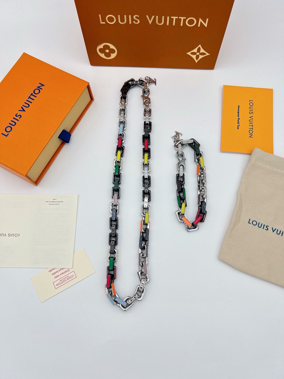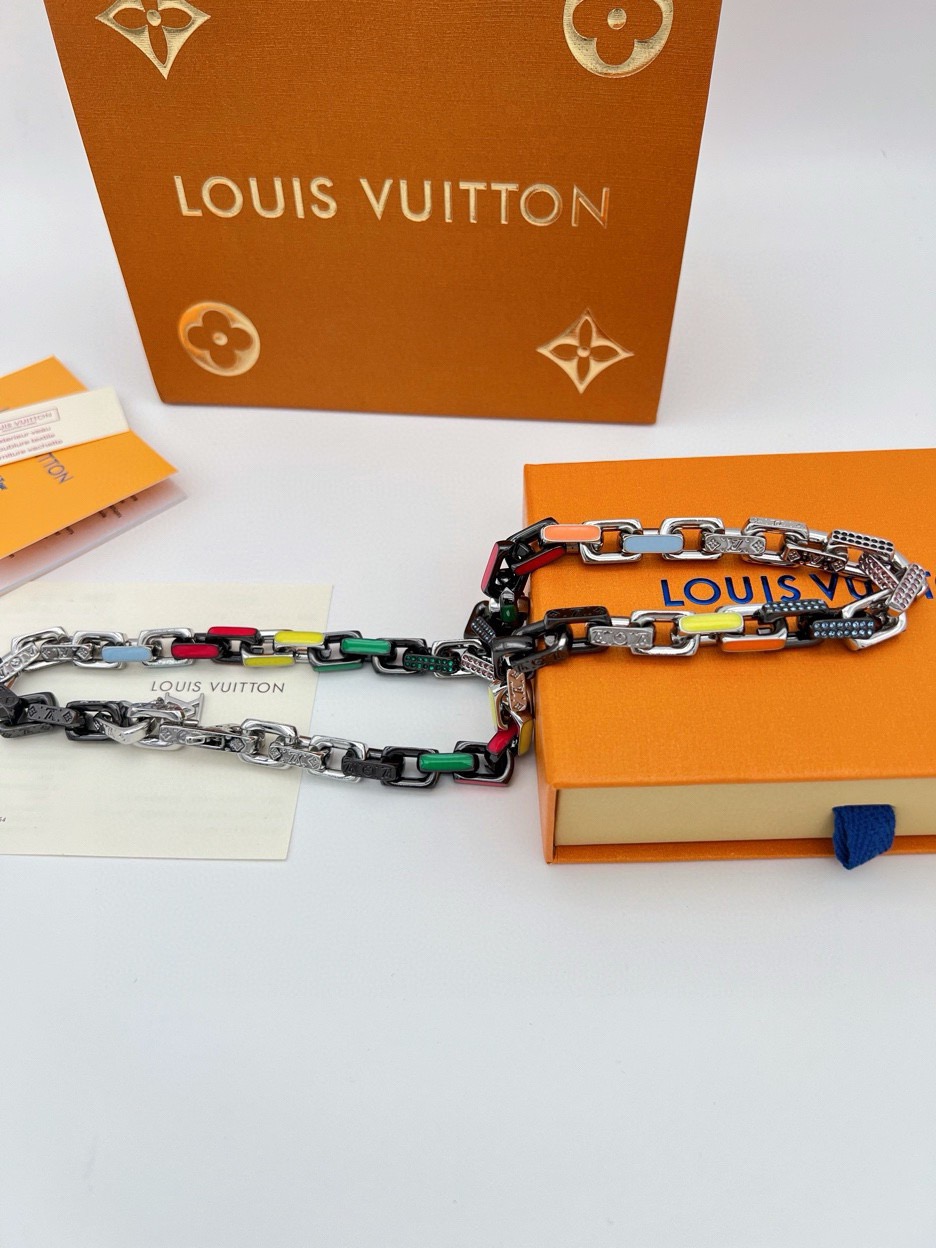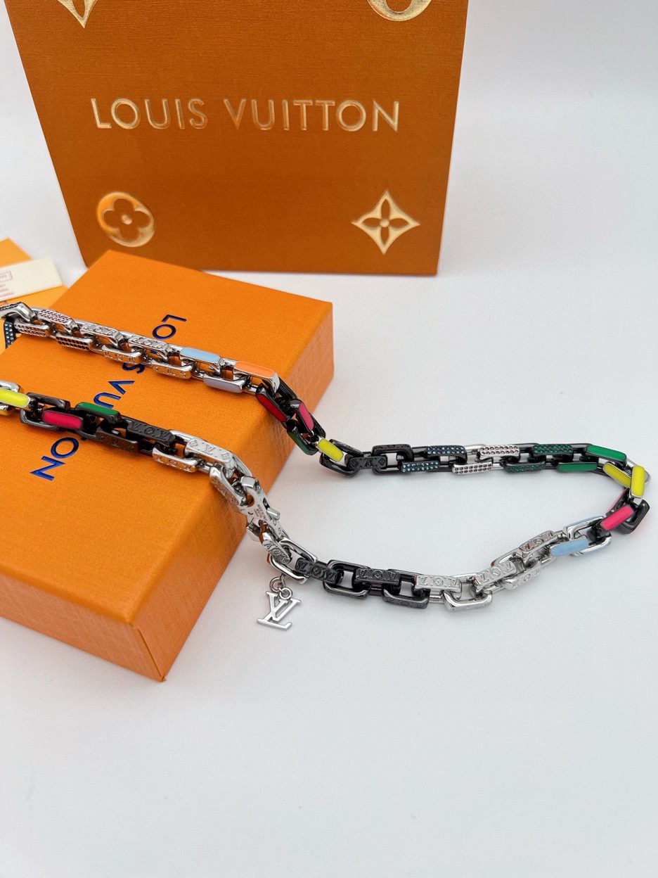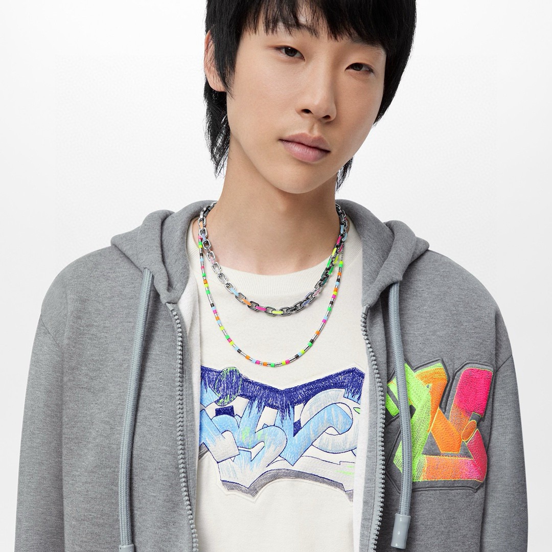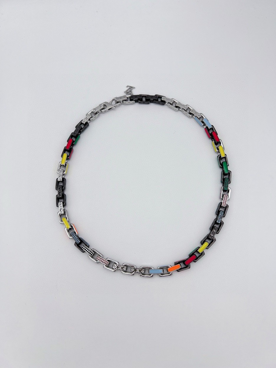 Paradise Chain 项链以彩虹色调和潮流理念俘获视线 珐琅和透明玻璃浸染明快亮彩 链环精致镂刻 Monogram 图案 开合处的 LV 字母挂饰完善整体设计