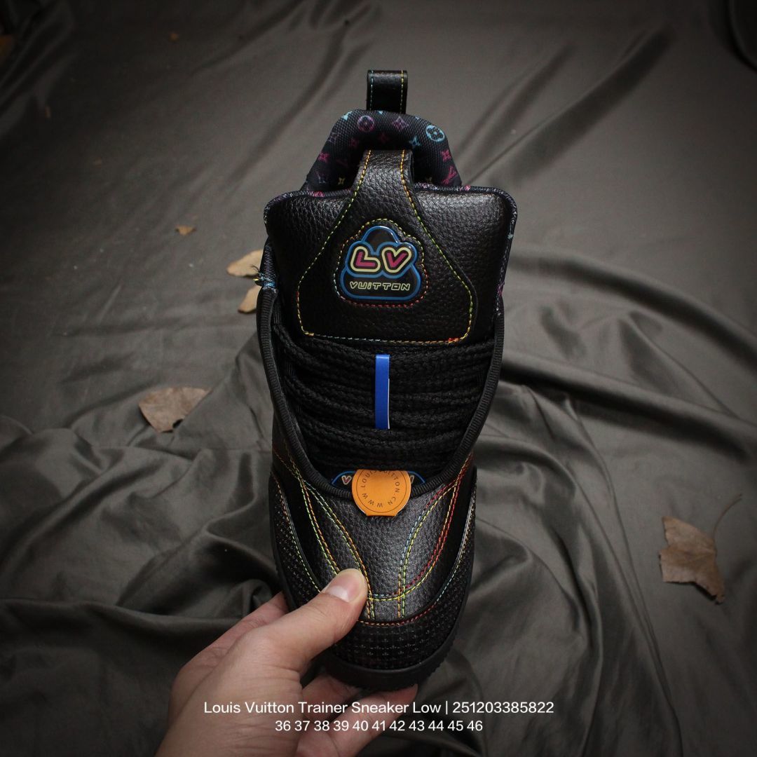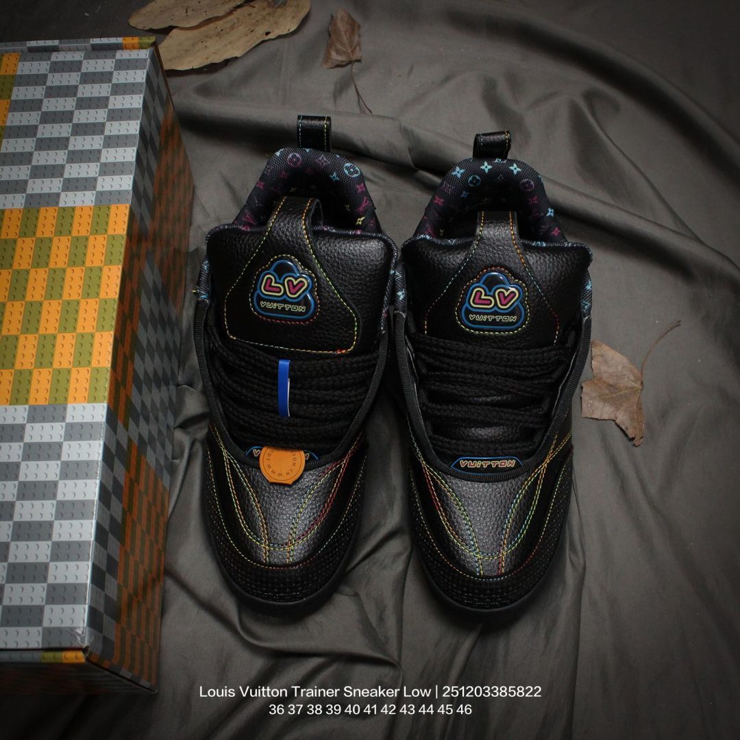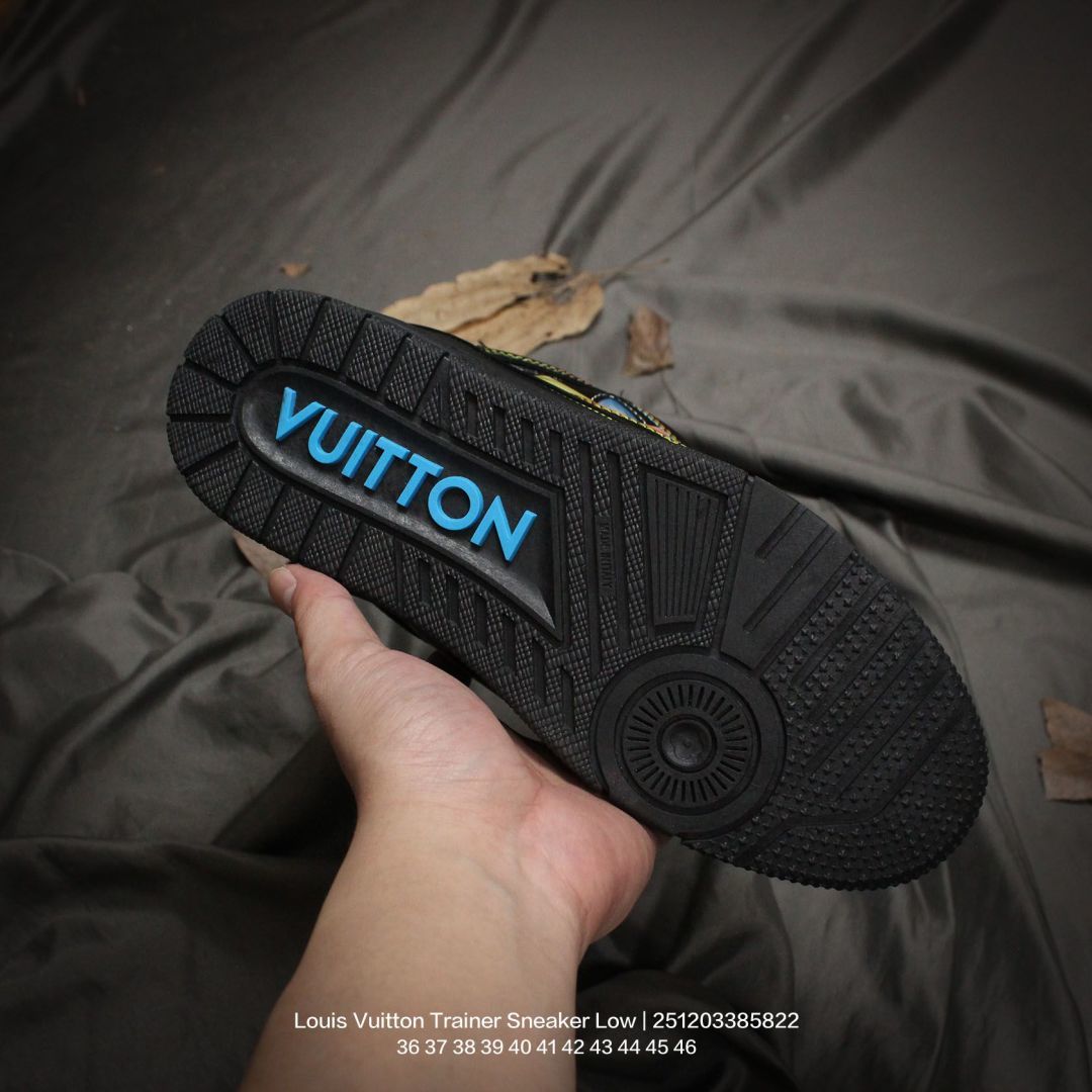 Louis Vuitton 路易威登 男女鞋配置厚实抽屉礼品鞋盒 采用荔枝纹纤维革组合粒面牛剖革鞋面材质 鞋垫嵌入软脚感EVA物料 外置TPR光泽隔色鞋底法国巴黎百年奢侈品牌LV路易威登Louis Vuitton Trainer Sneaker Low 运动系列低帮复古百搭休闲运动文化篮球板鞋