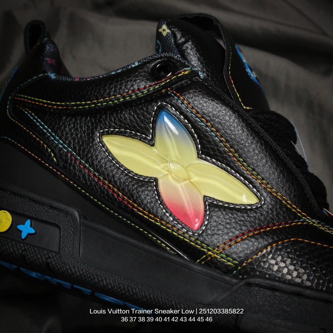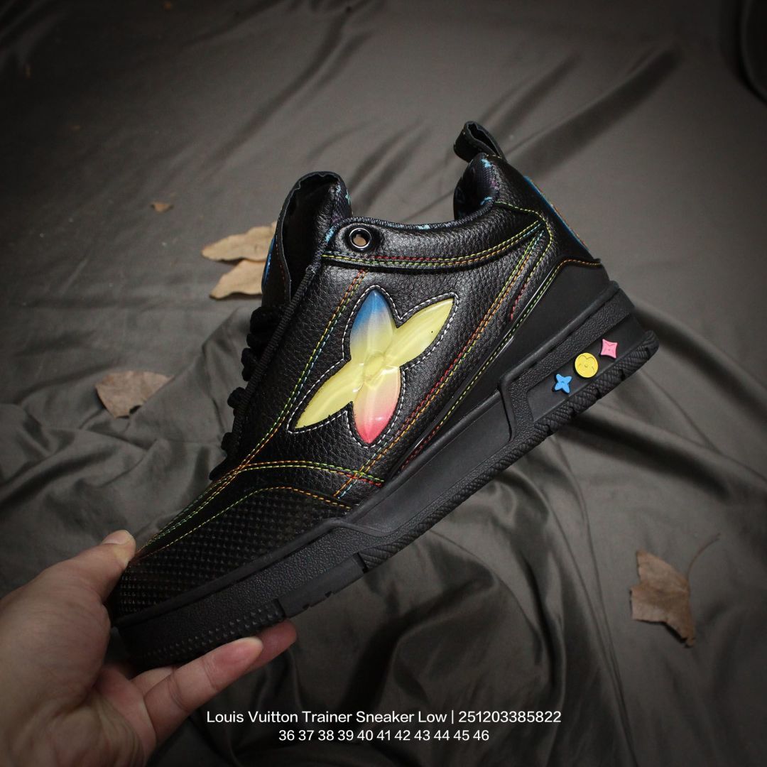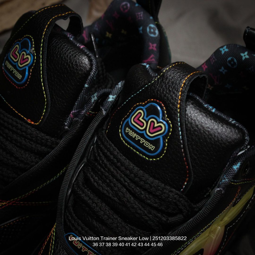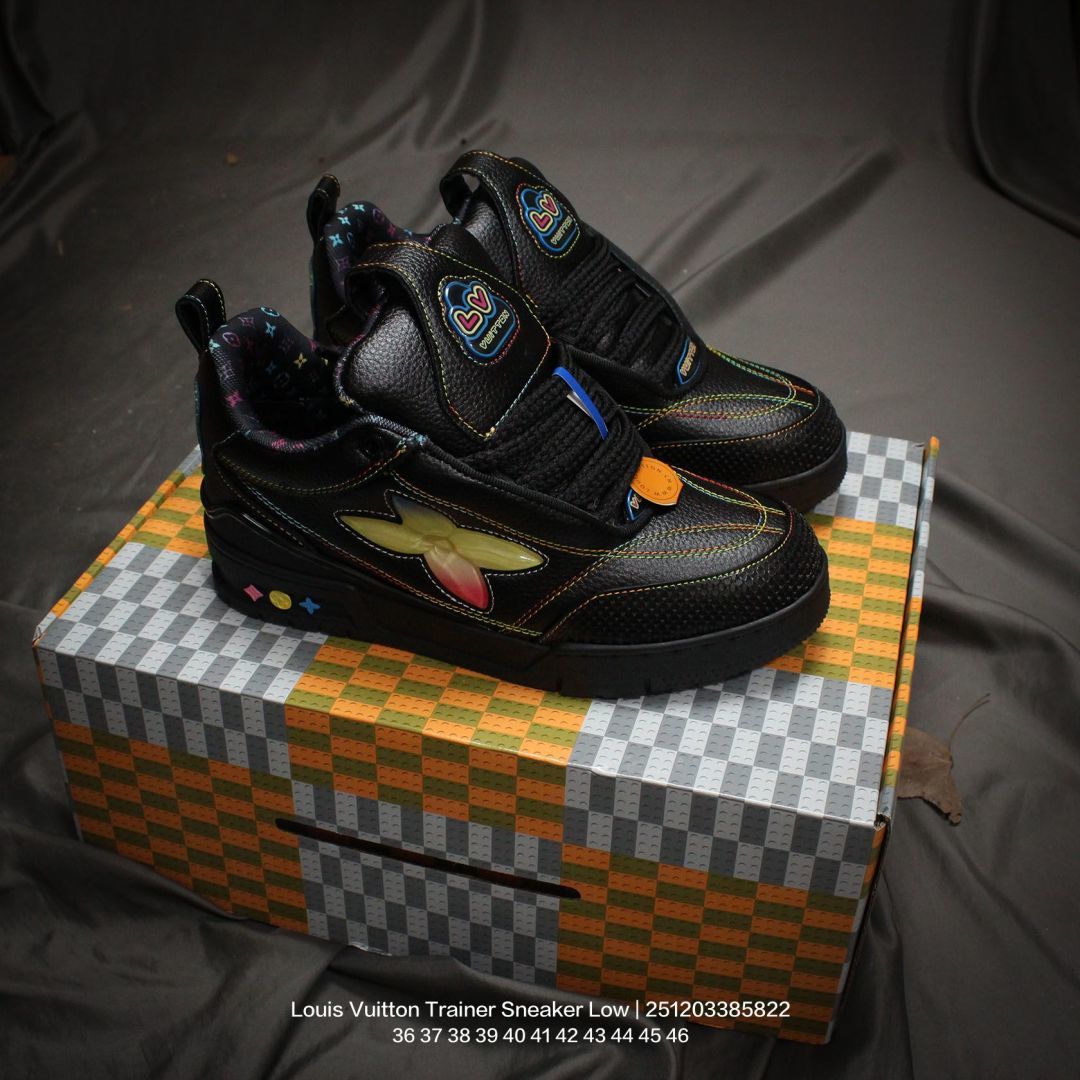 Louis Vuitton 路易威登 男女鞋配置厚实抽屉礼品鞋盒 采用荔枝纹纤维革组合粒面牛剖革鞋面材质 鞋垫嵌入软脚感EVA物料 外置TPR光泽隔色鞋底法国巴黎百年奢侈品牌LV路易威登Louis Vuitton Trainer Sneaker Low 运动系列低帮复古百搭休闲运动文化篮球板鞋