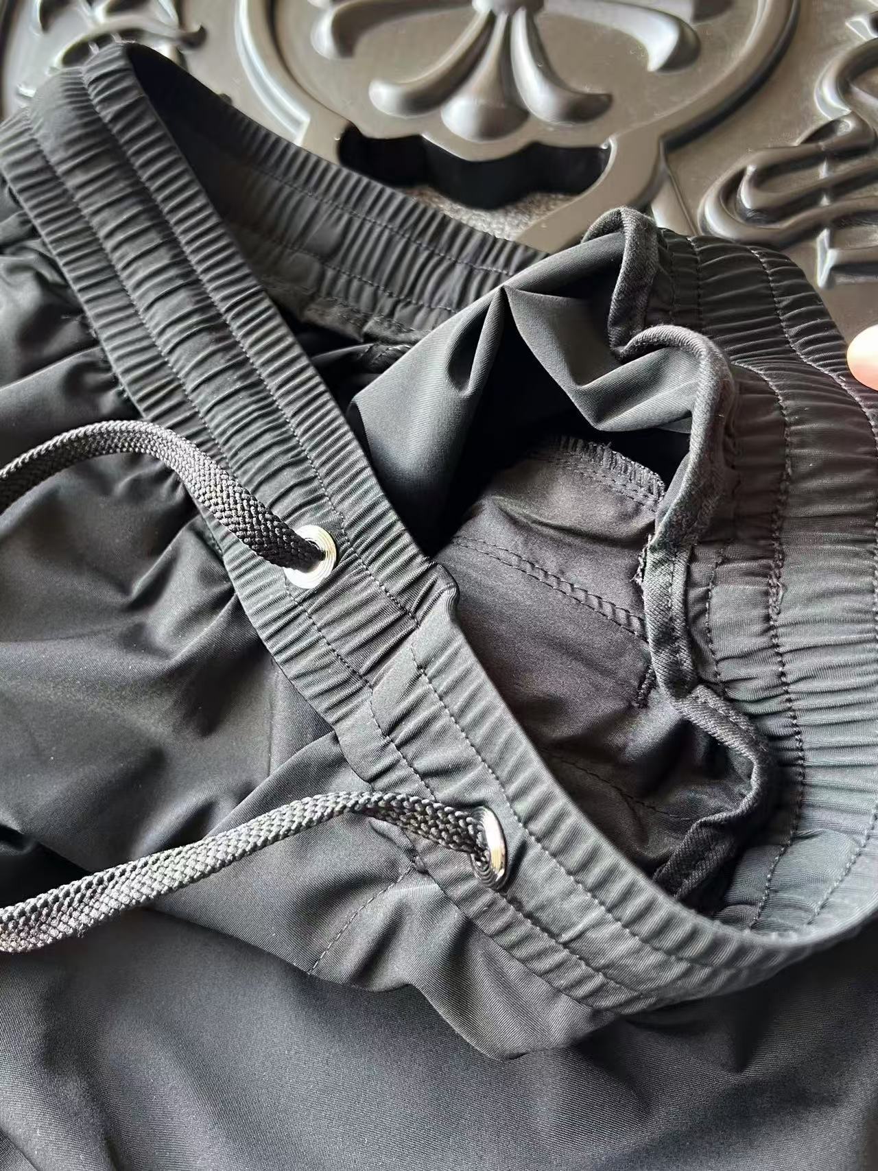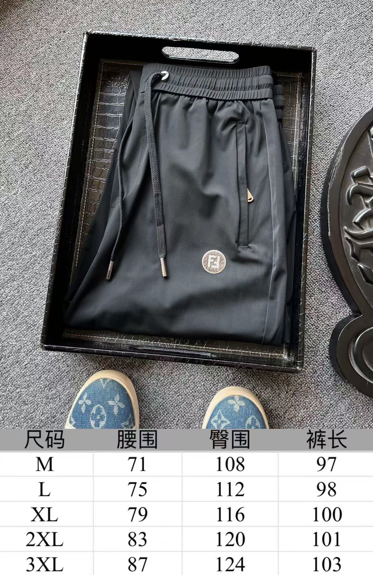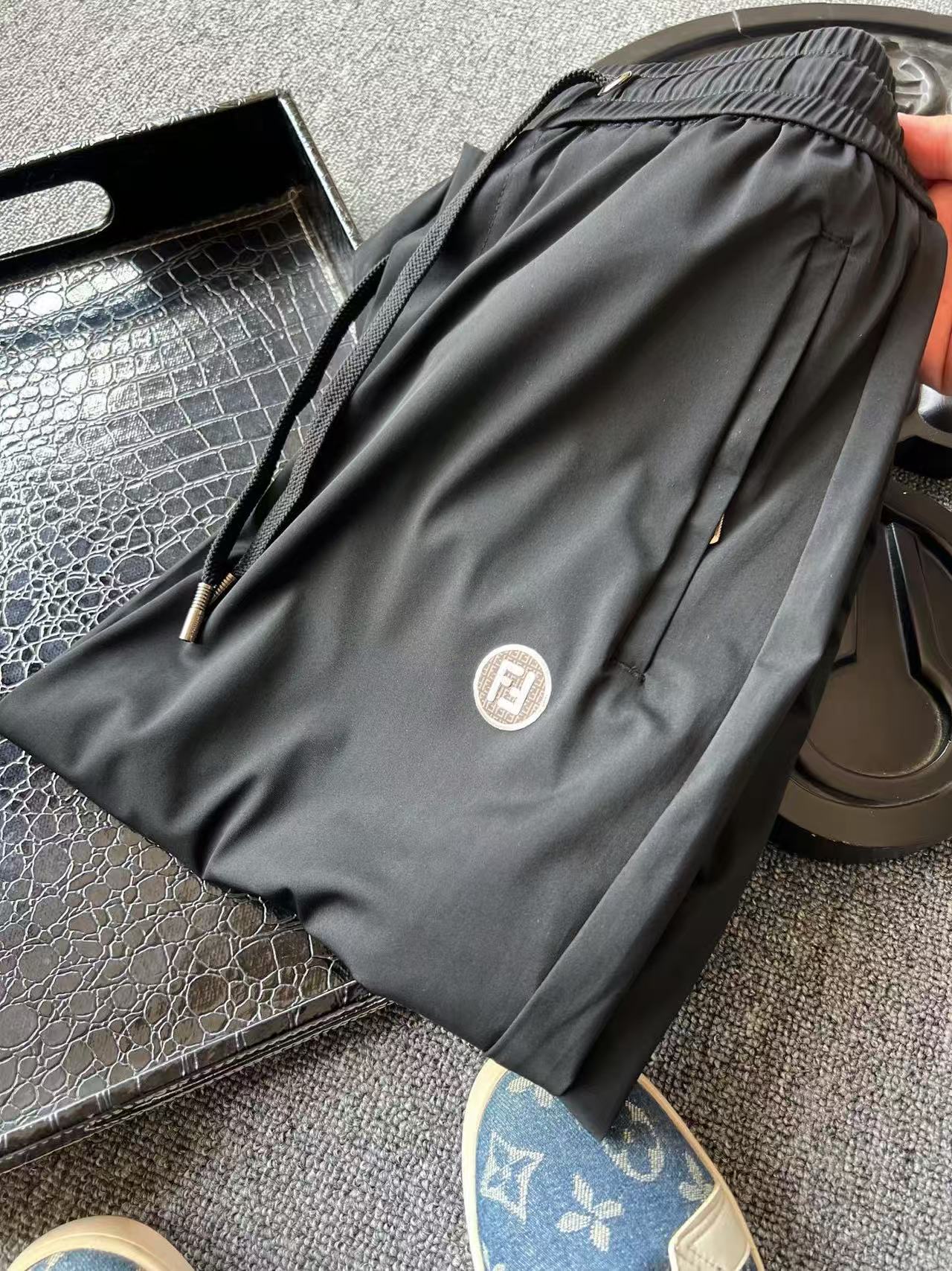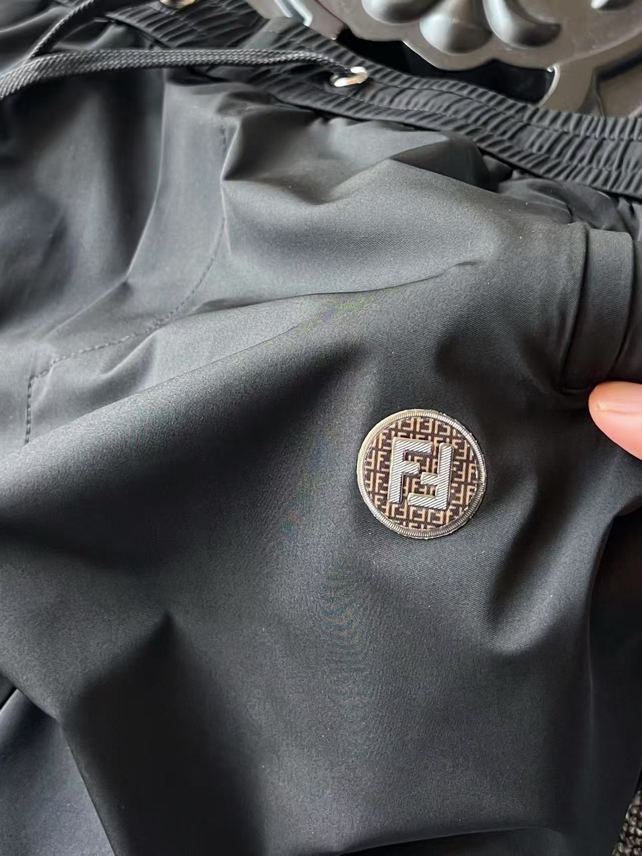 细节细节再细节 Fendi家商场新品高端松紧裤 胸前圆形咖啡色双F满印带为基底 居中又做了浮雕3D立体双F芬迪金属丝工艺轮廓配套立体细节 十分精致 腰口金属抽绳孔细节 双侧以及后内嵌式口袋设计都带有暗拉链设计 保证随身携带手机等不丢失