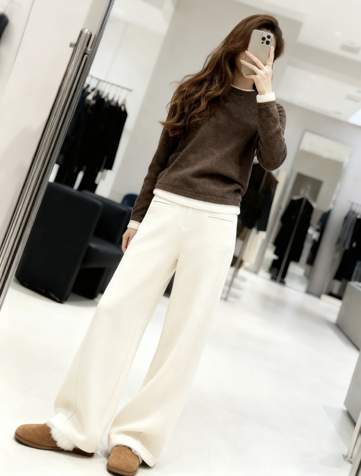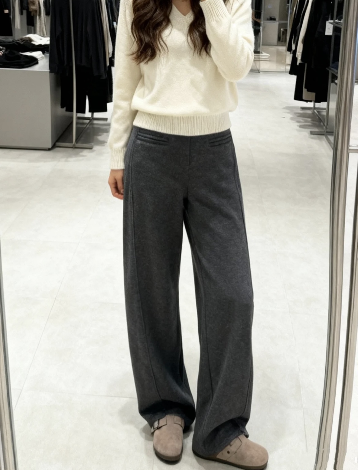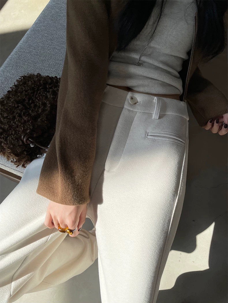 墙裂推荐给大家这条炒鸡实穿的醋酸羊毛裤 属于那种不入手后悔系列 是秋冬必入系列 拿到手的反应就是太苏服啦 面料舒适保暖软糯亲肤 内里加绒 有一定厚度 可贴身穿 一字口袋设计走线平整 彰显品质的同时更具时髦设计感 侧缝自上而下向前延伸线条流畅自然 视觉更显腿细腿长 提升身高比例 及地长度腰以下全是腿 独家立裁打造量感 宽松的直筒版型对身材的包容性高 适当松量增添腿部富足空间 立体廓形丸美隐藏腿部不足 自然修腿遮腿 醋酸羊毛混纺面料 布面风格自带肌理感 细腻柔软质地紧密 使得成衣软而不塌保暖性出众 一件自带时髦体制 演绎秋冬轻奢气场
