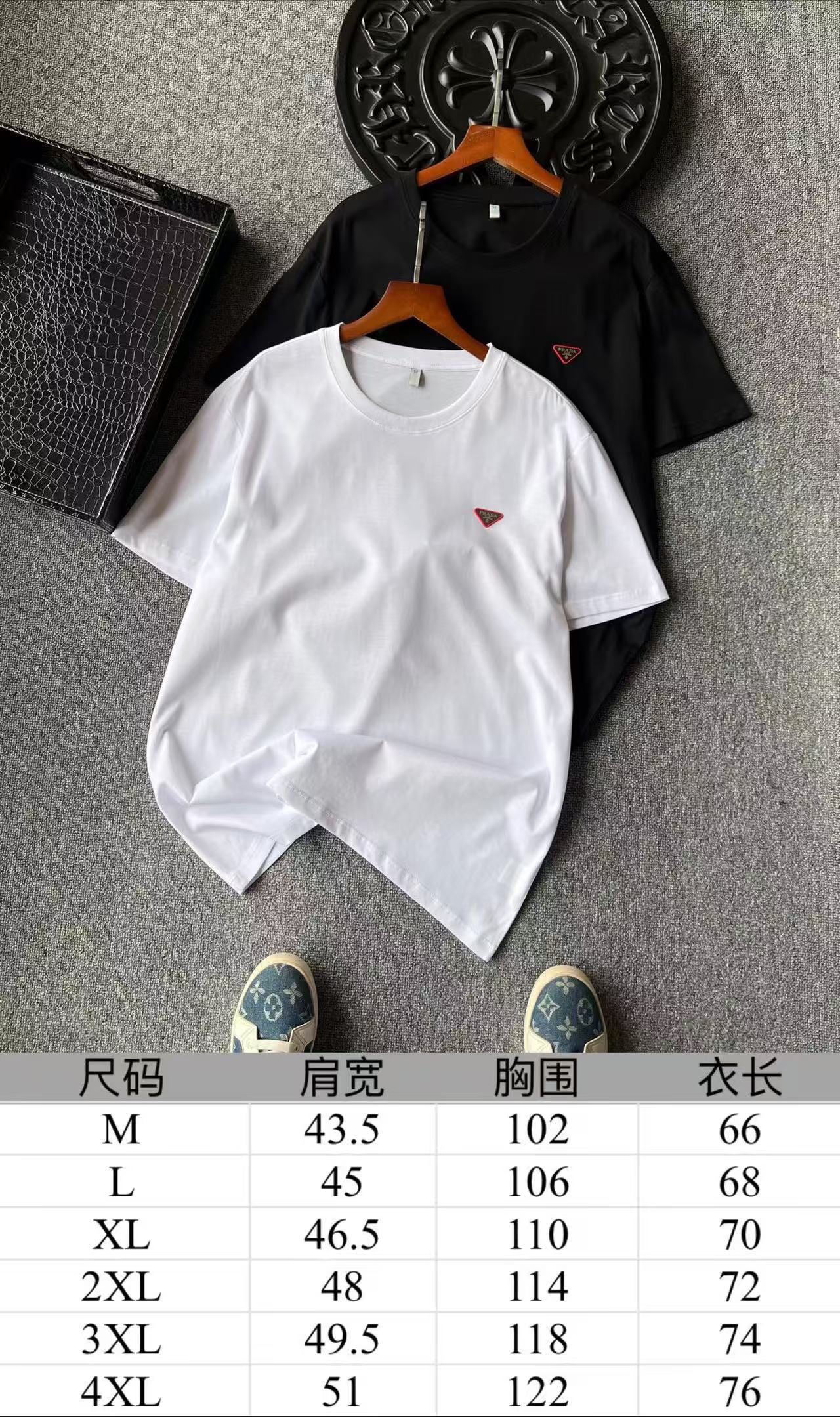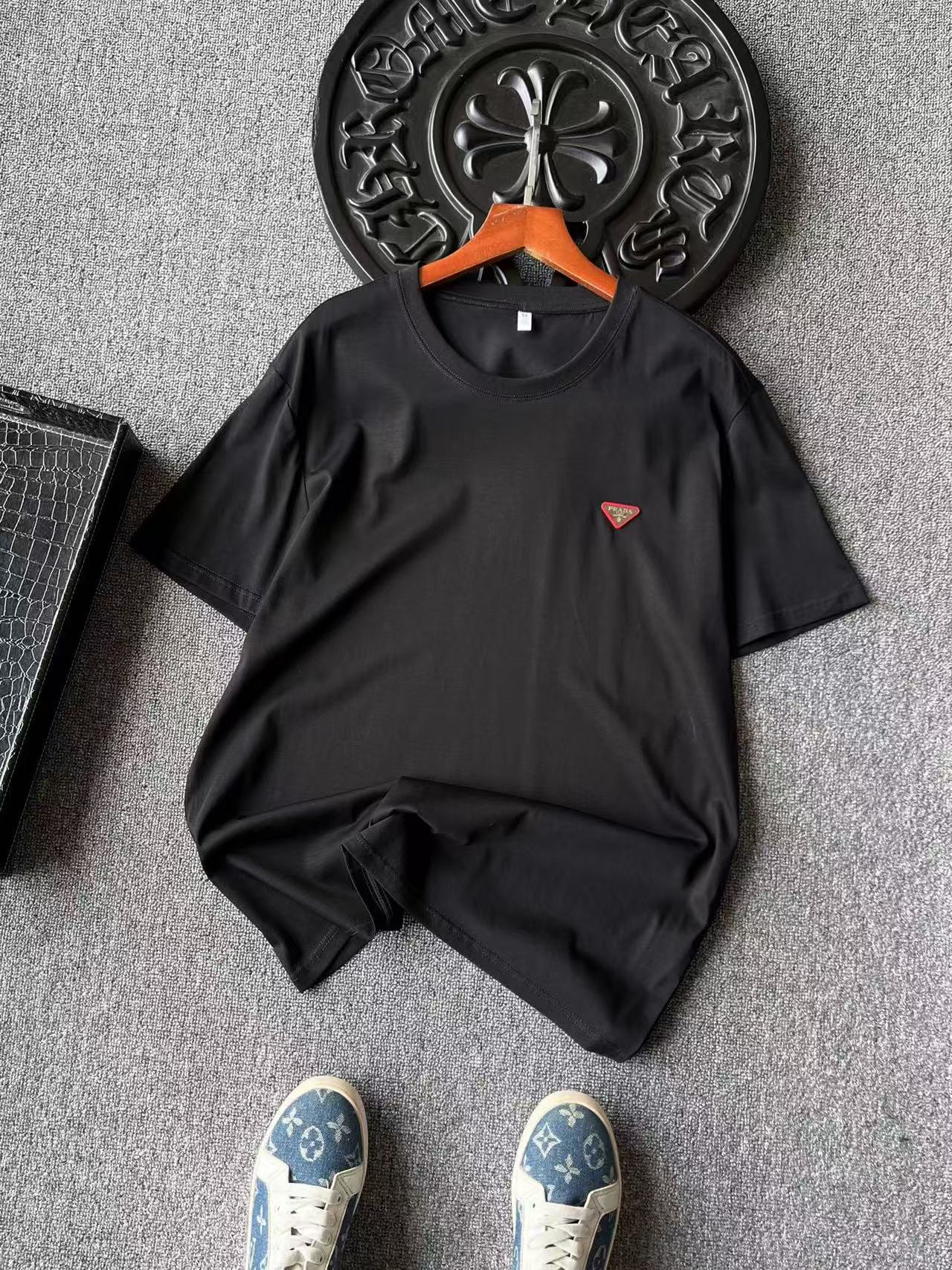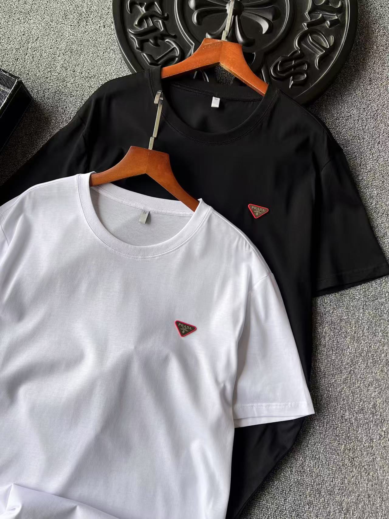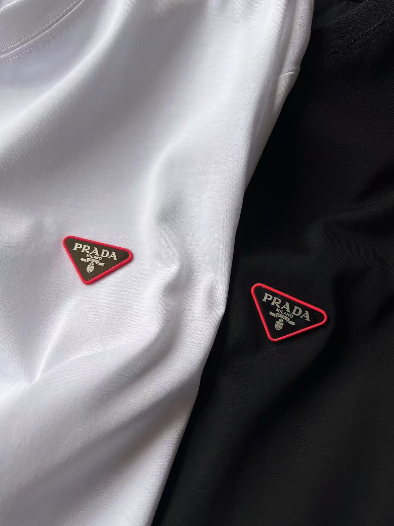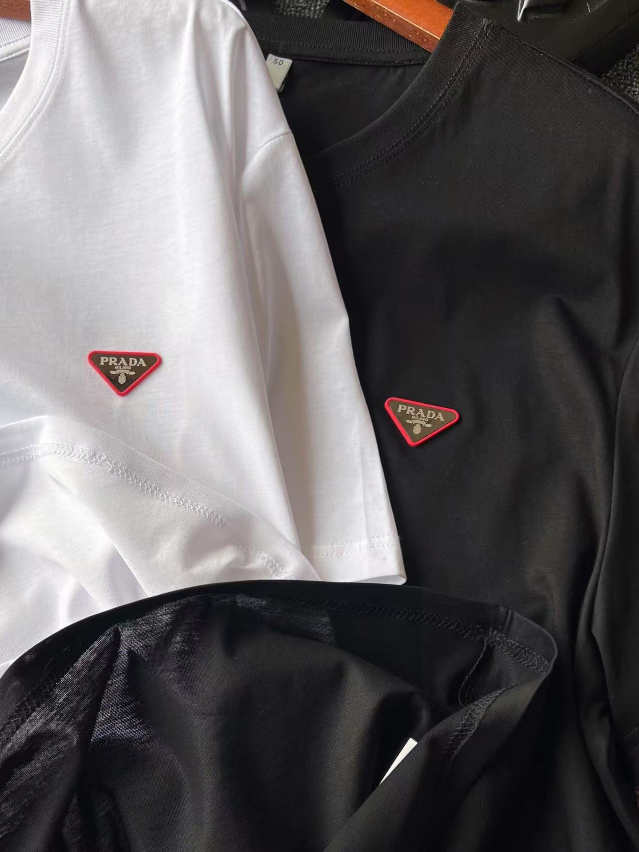 细节细节再细节 普拉达专柜新品玉蚕丝T恤 胸前采用进口高定粉硅胶倒三角内嵌钨钢Prada激光金属标 细品十分精致 双本针领口加固做工 同缸纯棉领压条包边处理 接触肌肤更加友好 精湛细节做工相当到位