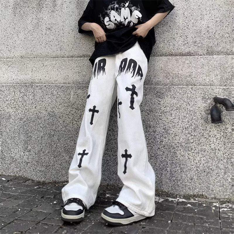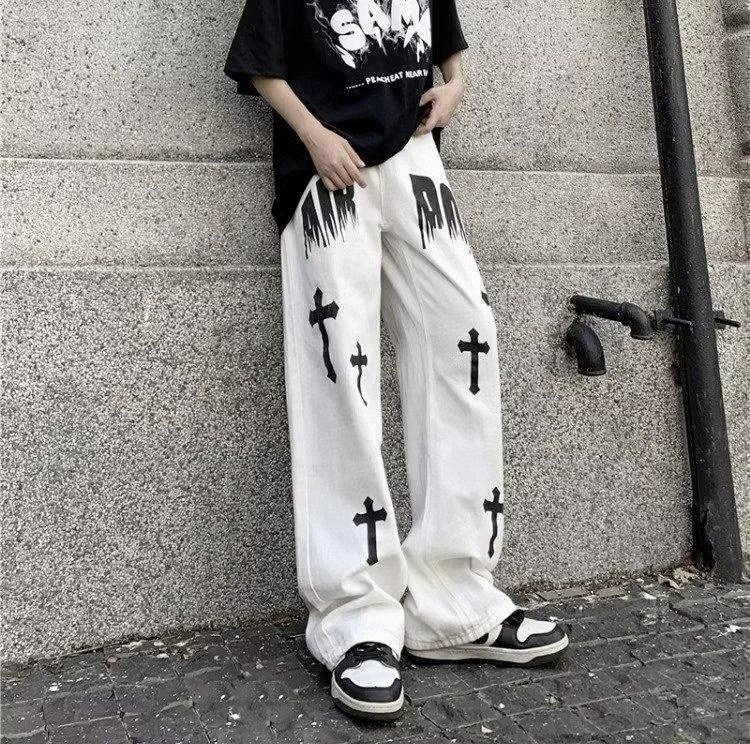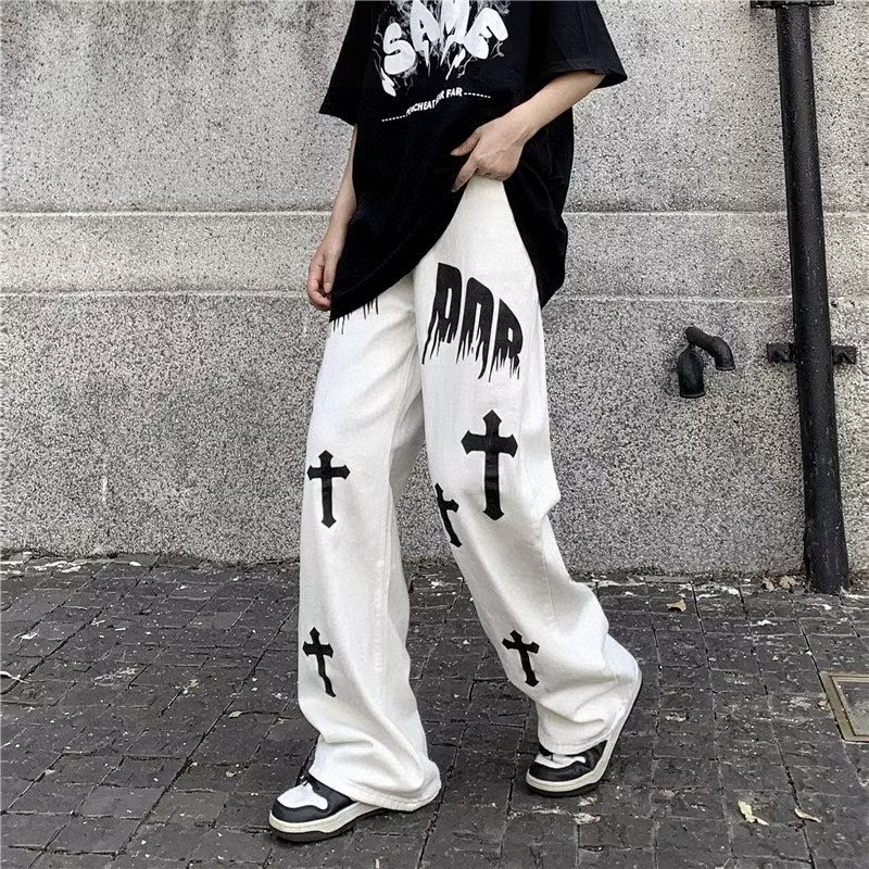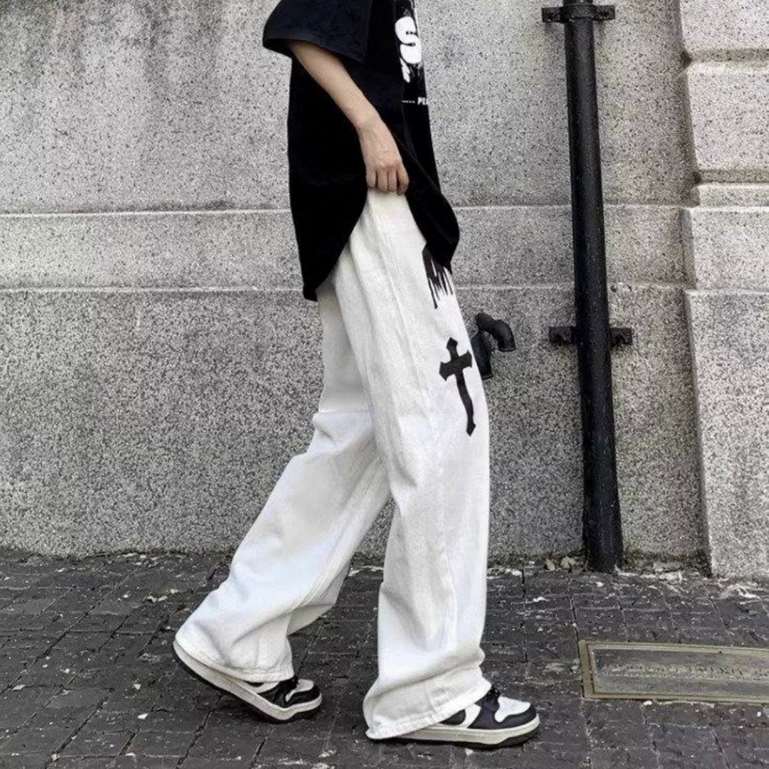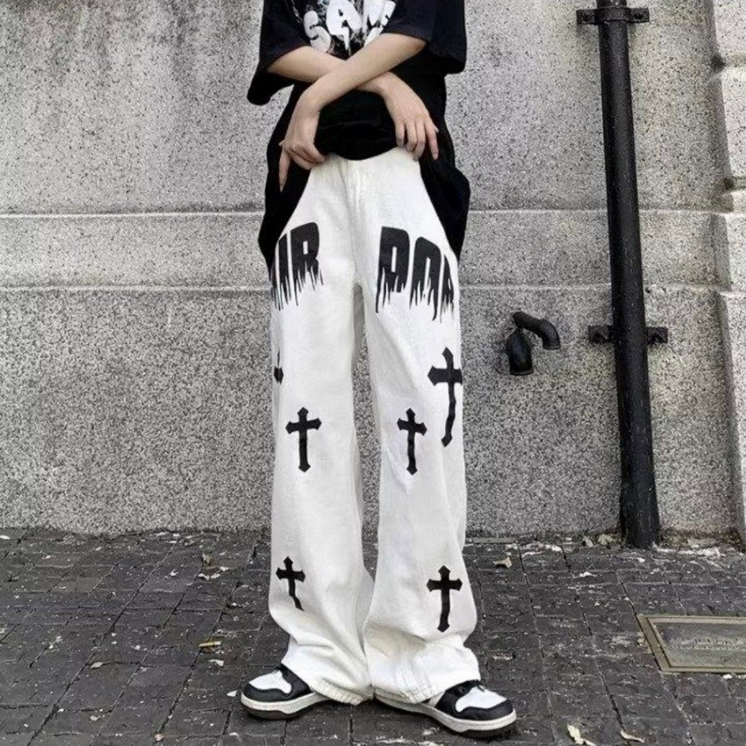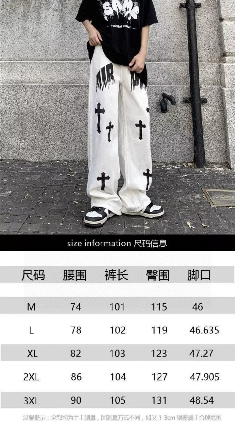裤身十字架印花搭配火焰字母设计 高街元素满满 无论款式还是版型都非常赞 设计感时髦
