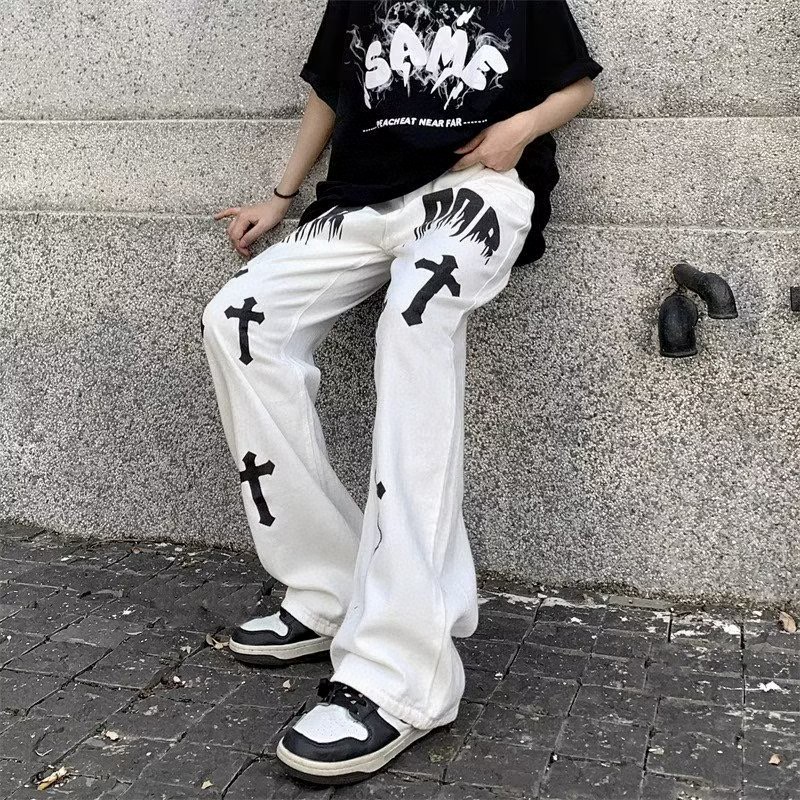 Chrome Hearts 克罗心 海外版限定十字架火焰印花直筒牛仔裤长裤 男女同款