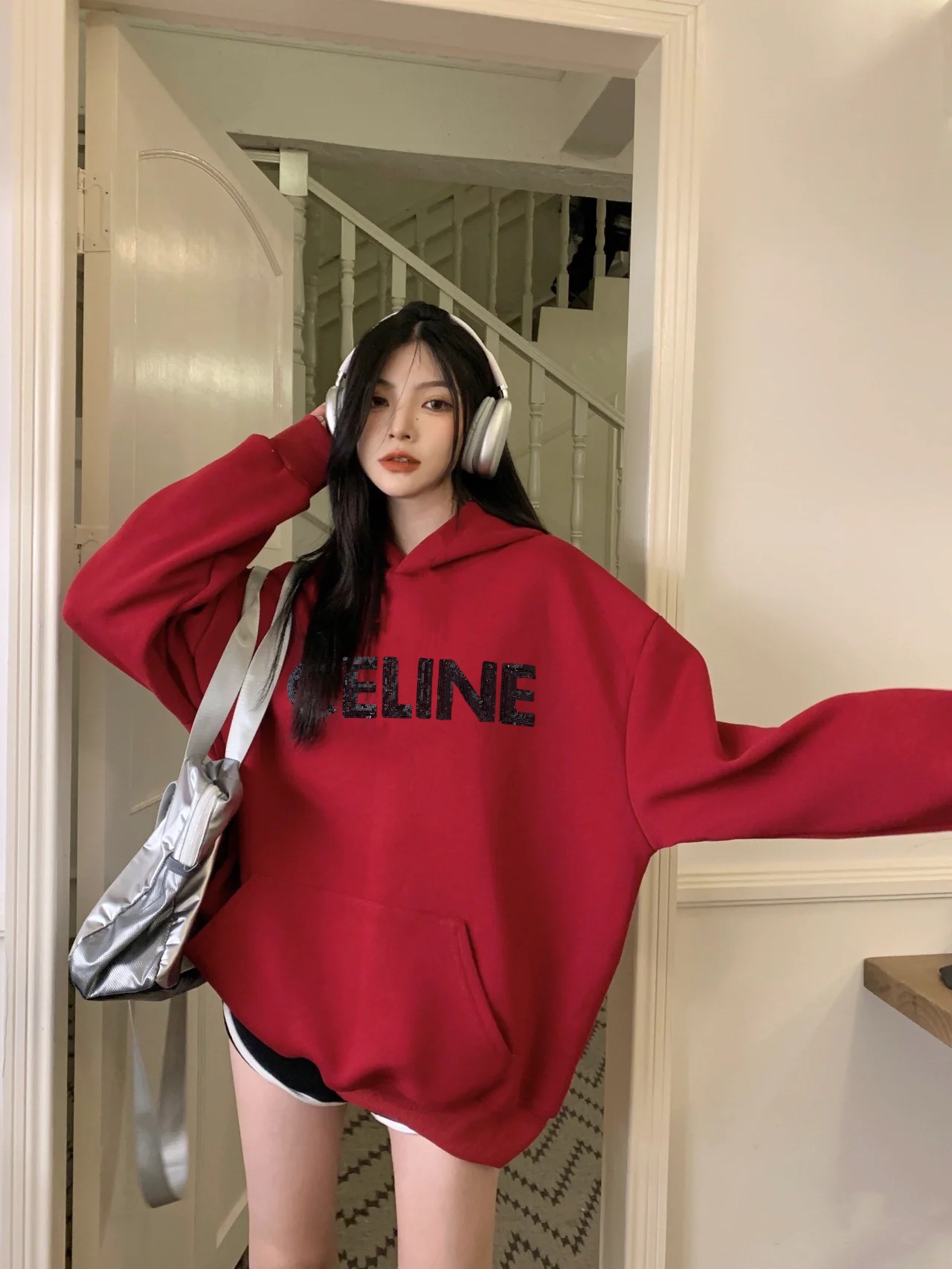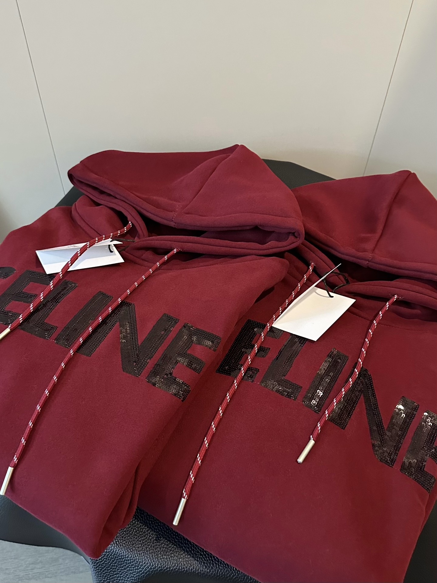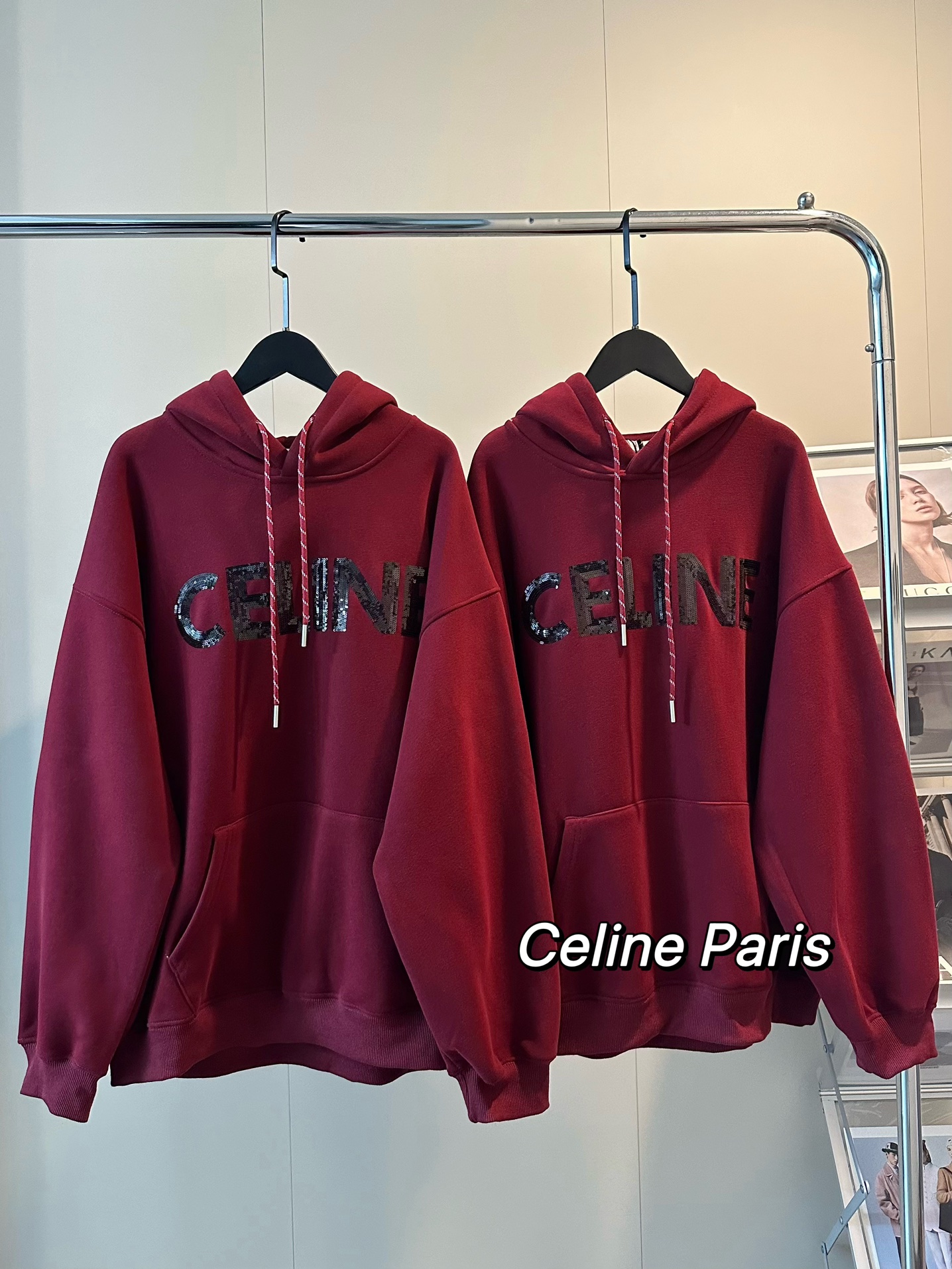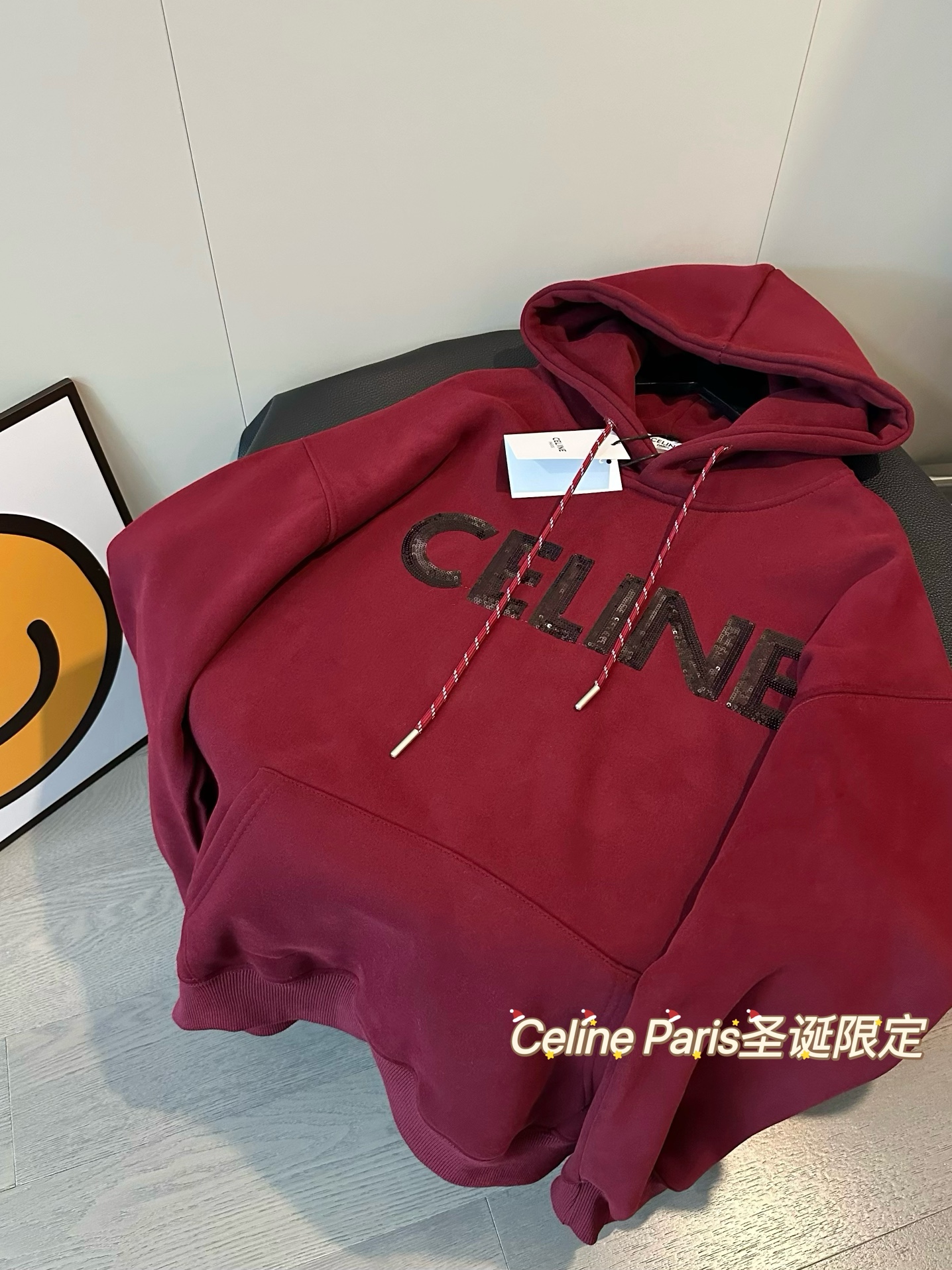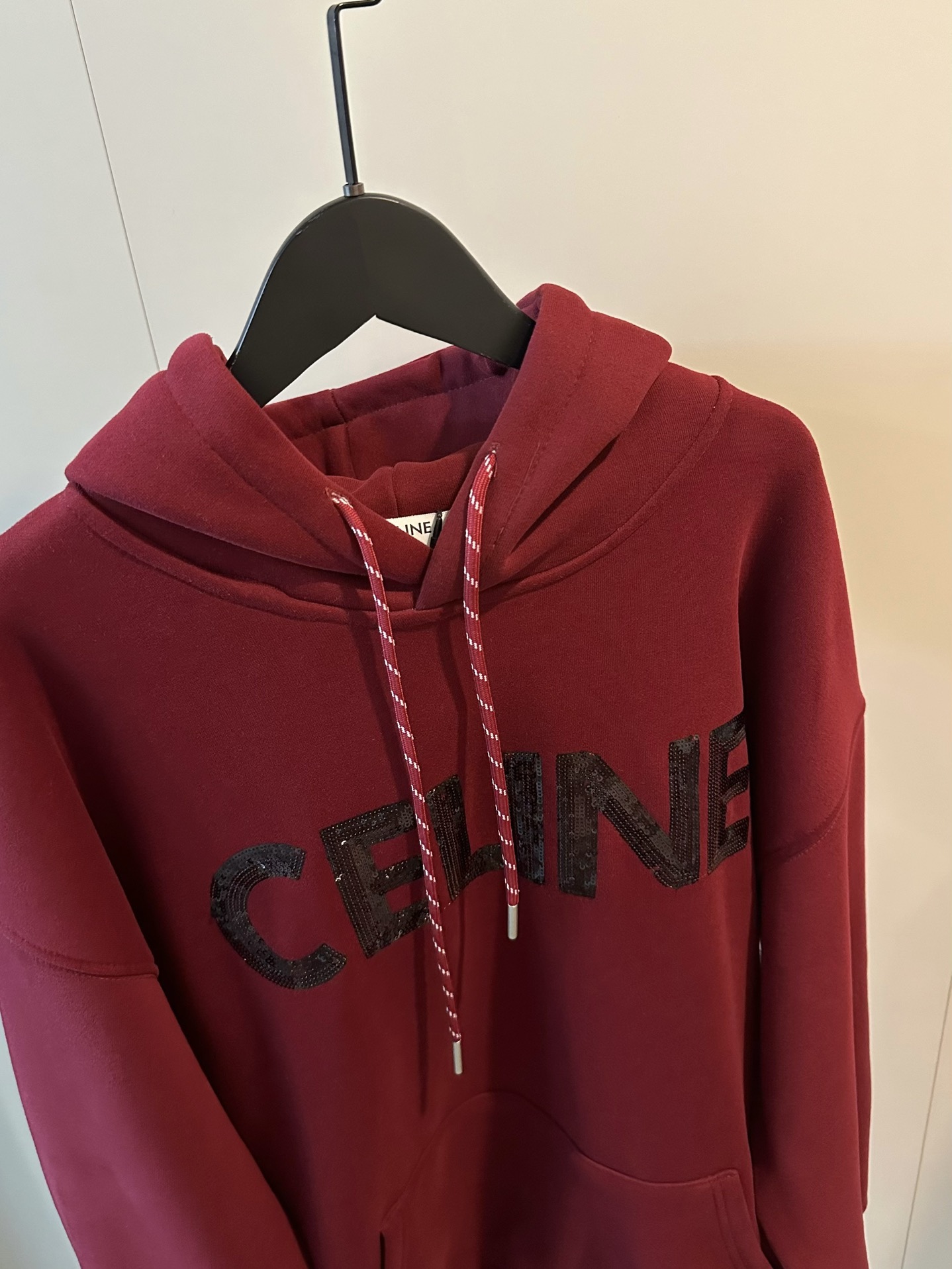 Celine赛琳新款亮片刺绣酒红色加绒连帽卫衣