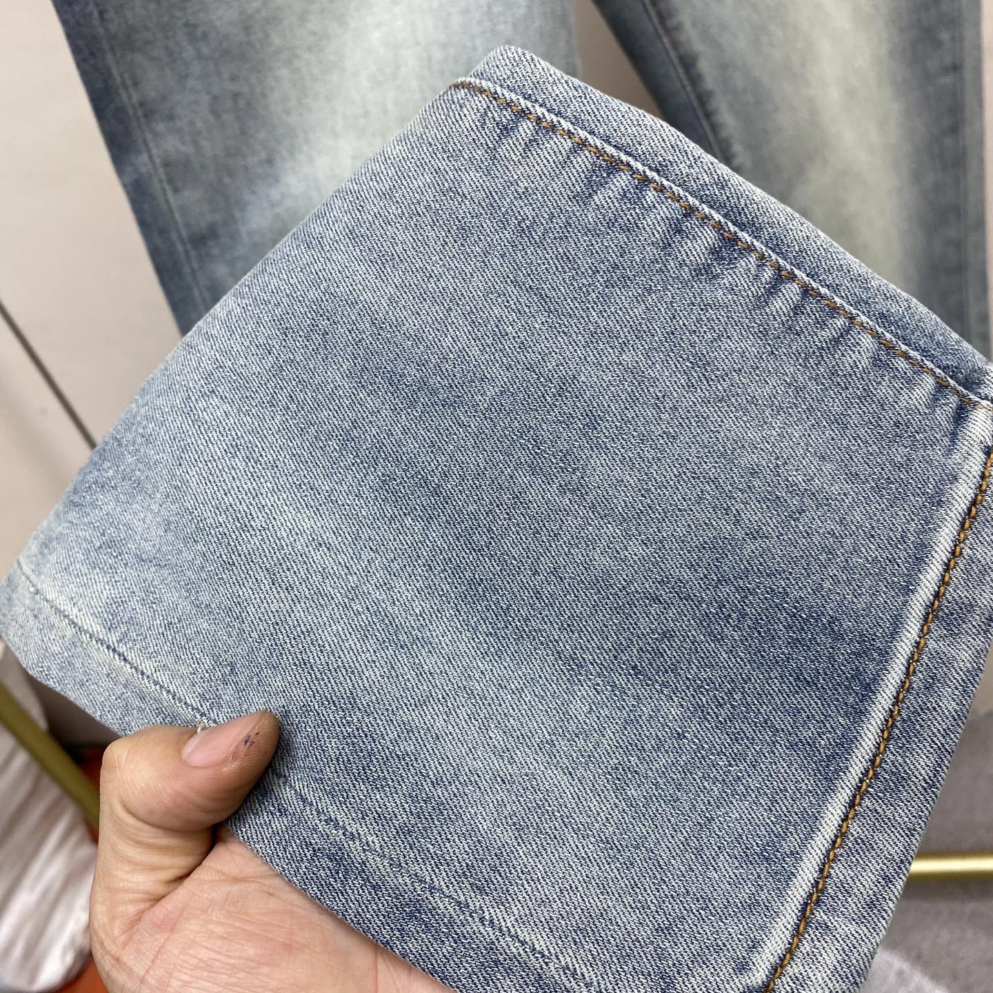 面料 丹宁水洗牛仔裤 奢华体验 客供贸易渠道 简约魅力的经典裤装采用客供丹宁牛仔 质感厚实舒适及透气效果也非常的好 高品质工艺化的裁剪堪称一流 整体非常精致 内外兼修铐边设计严丝合缝 运用聚股械针封边工艺彰显品牌奢华内在魅力品牌Logo字眼饱满厚实 凿刻型钮扣厚实严谨 给本平庸无奇的裤装带来了全新时尚品味