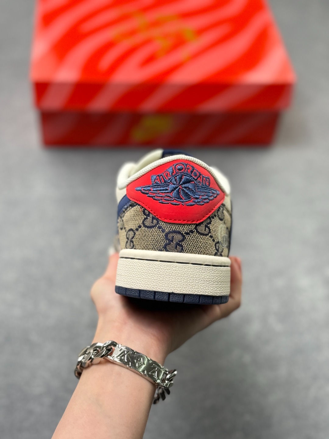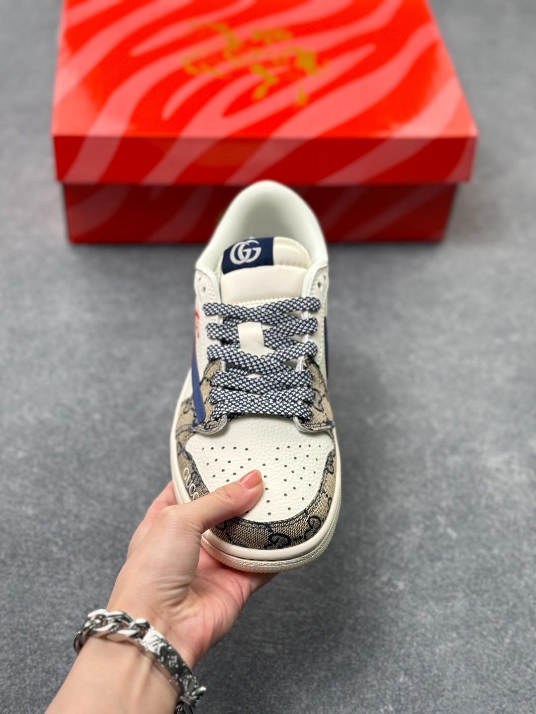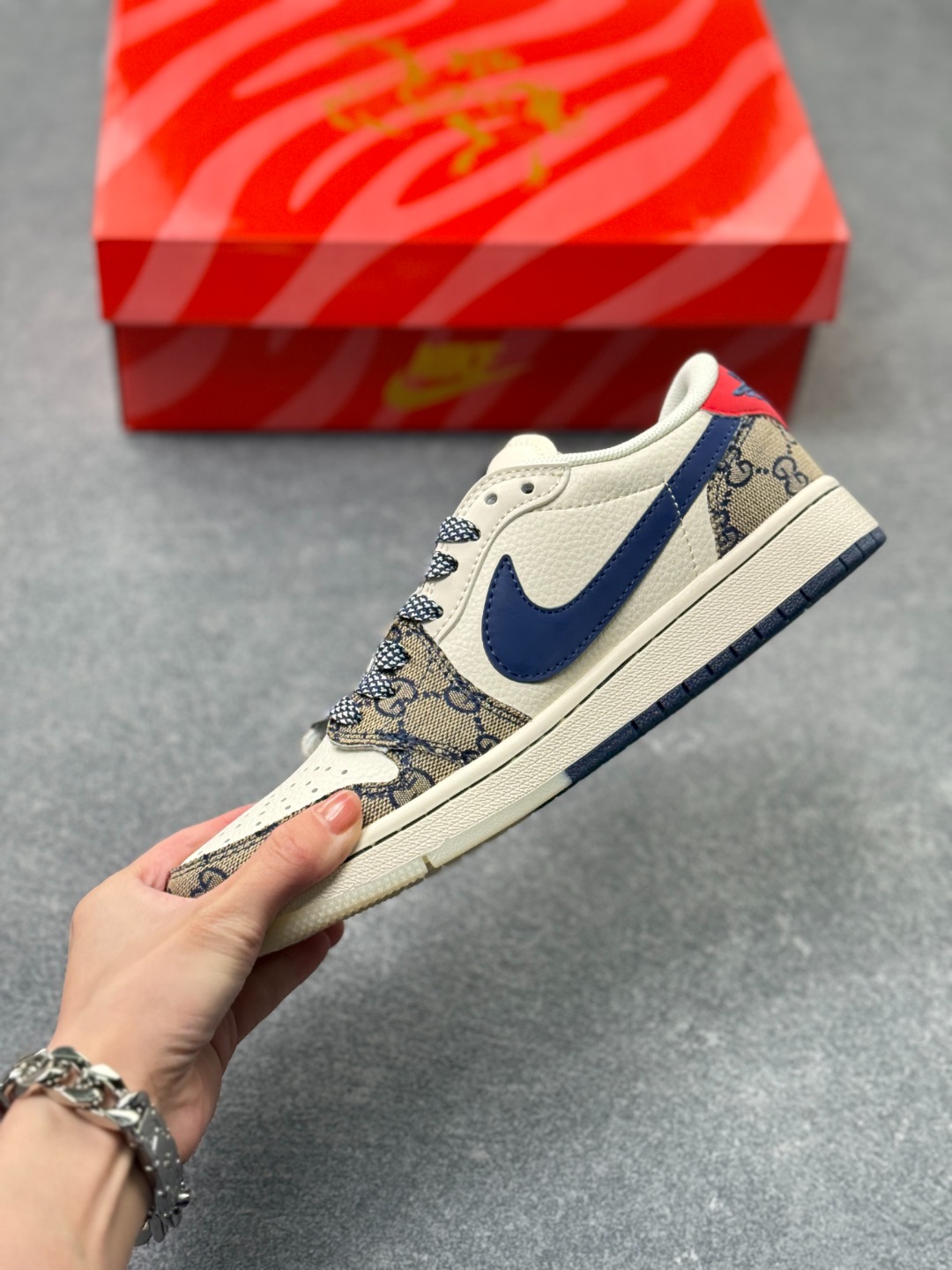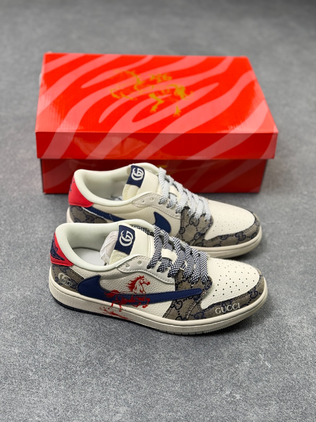 马年炸裂来袭 Air Jordan 1 经典AJ1低帮鞋型碰撞Gucci老花拼接 复古奢潮风瞬间拉满 鞋身红马涂鸦呼应2026马年主题 红蓝撞色搭配亮眼红绸配饰更具视觉张力 敲定稀缺属性 头层牛皮与老花面料拼接兼顾质感与个性 小众定制款彻底告别撞款 不管是收藏摆柜还是街头炸街 都是潮咖彰显品味的不二之选