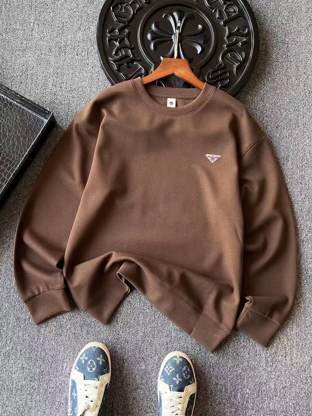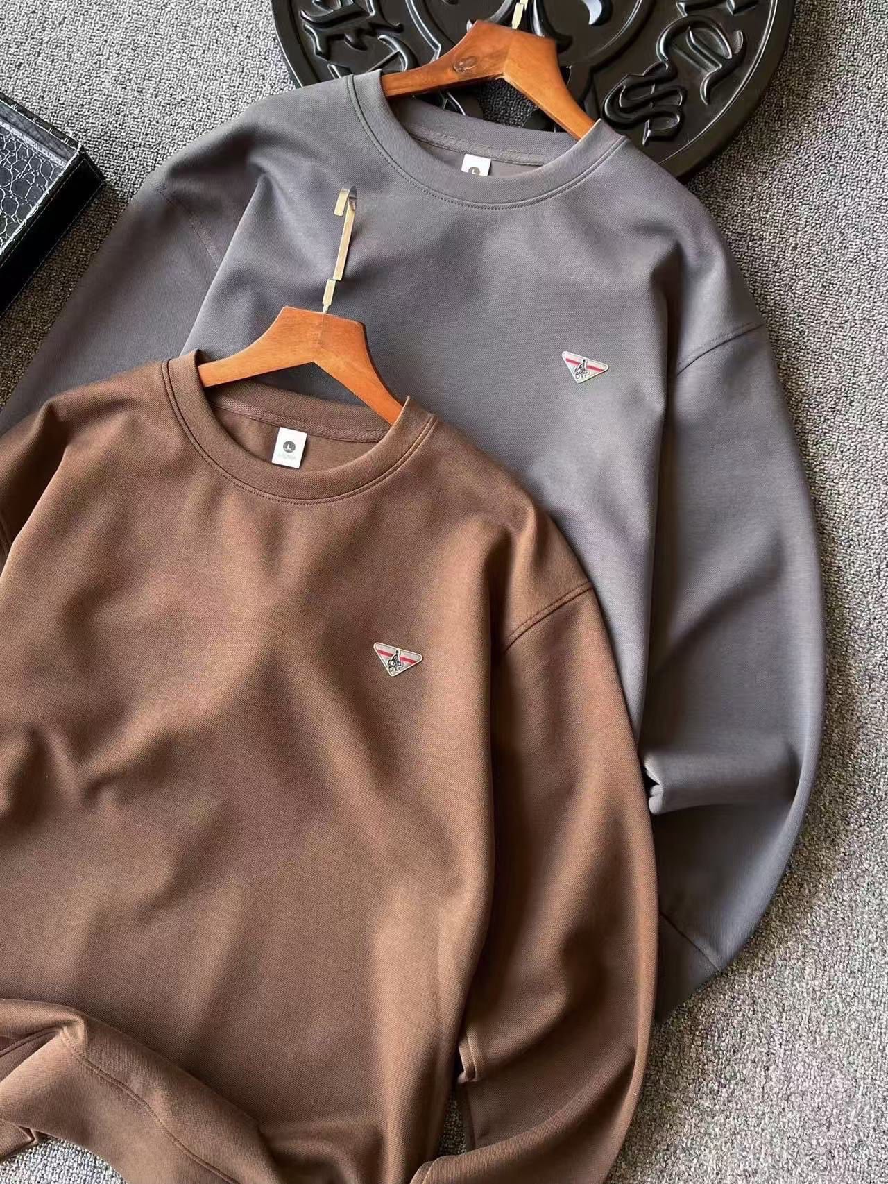 细节细节再细节 Prada小仆人公文包专柜新品高奢圆领卫衣 全身精致简约 纯正摩卡色以及高级水泥灰 胸前采用进口TPU金属拉丝倒三角内里镶嵌小仆人公文包标识 灰红组合底色 精致感满满 所有拼接接缝处全部做了双针压线 精湛做工天花板