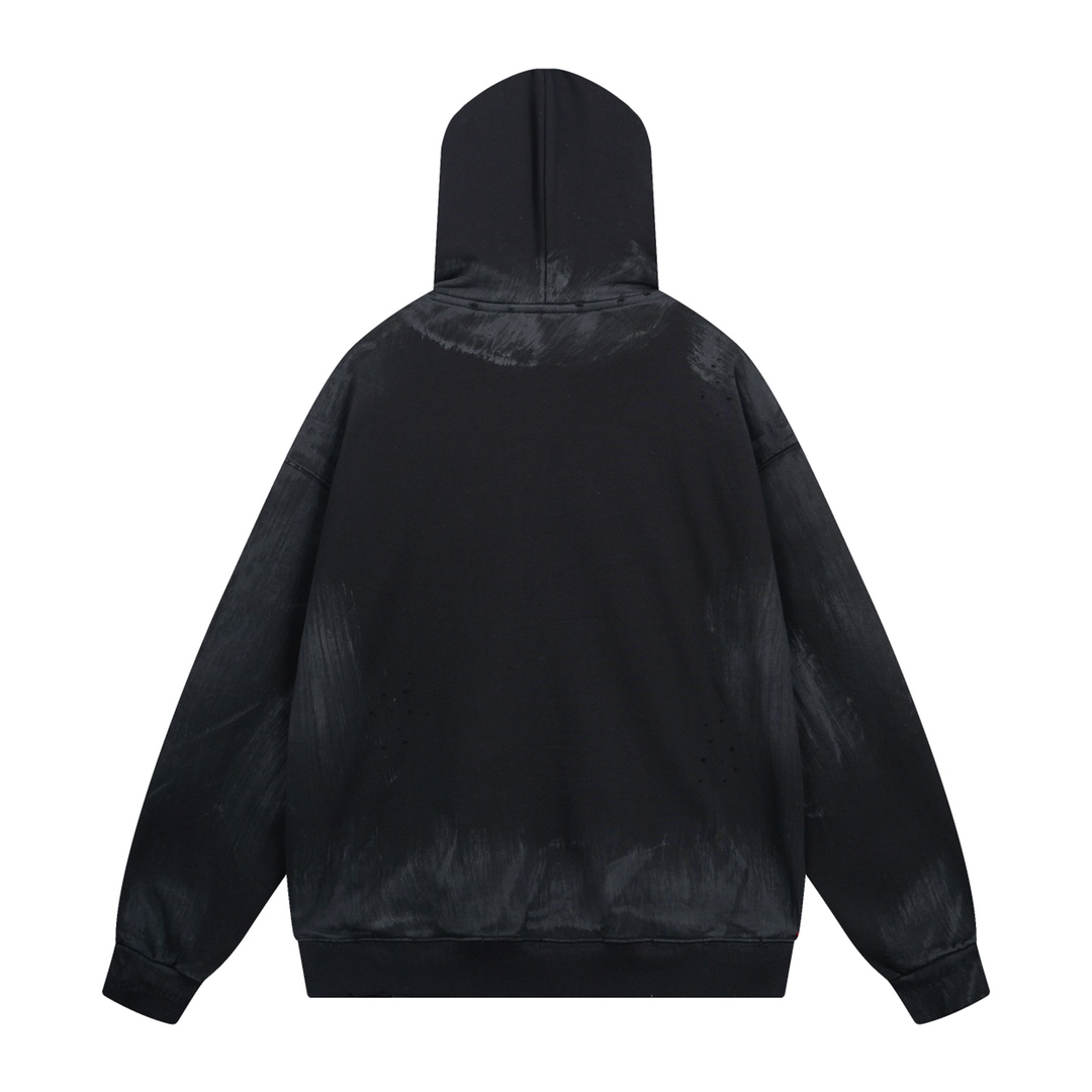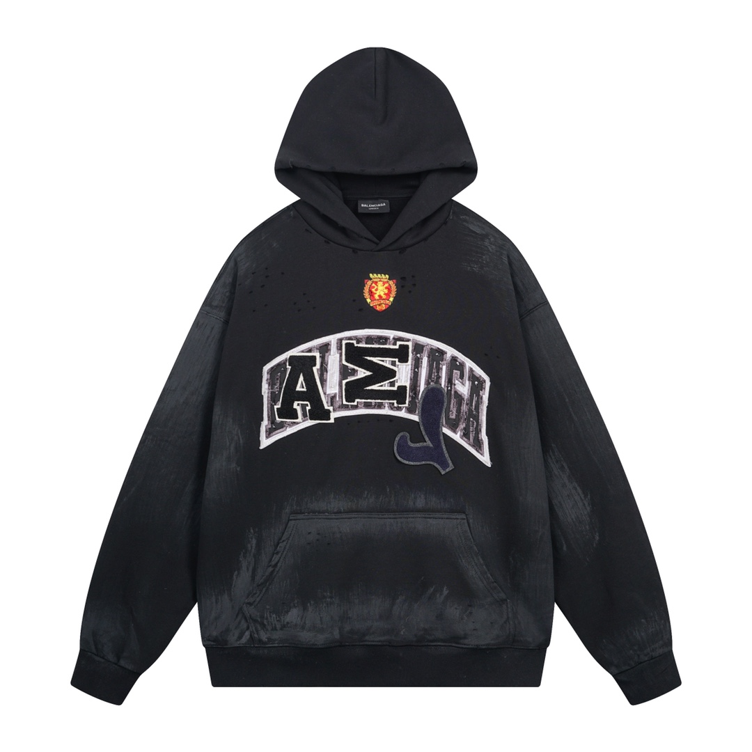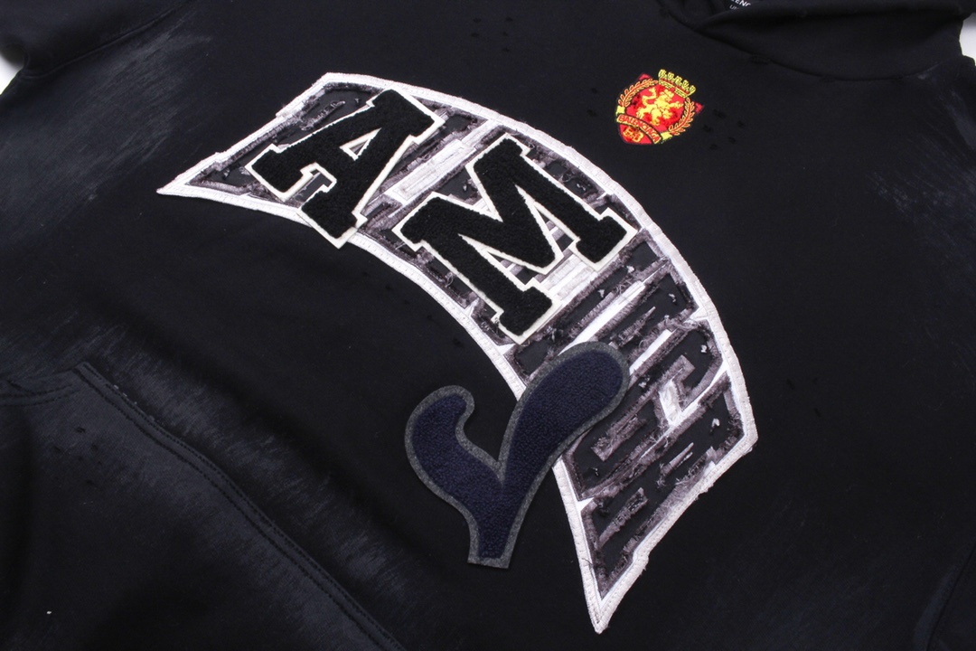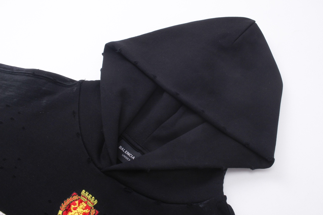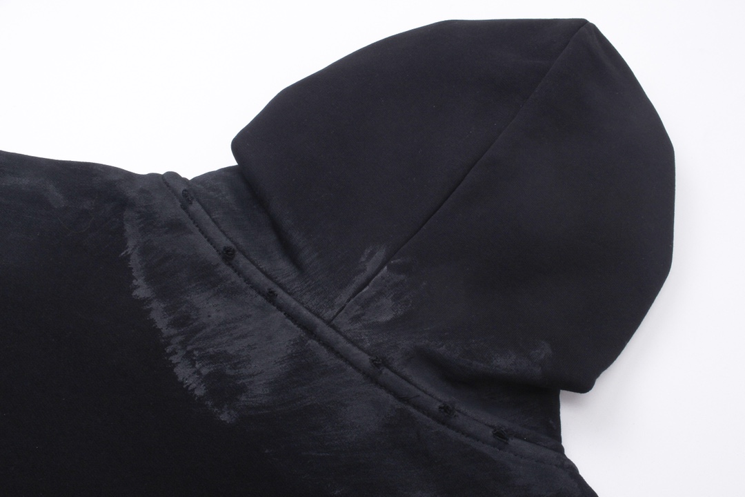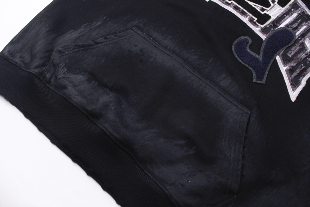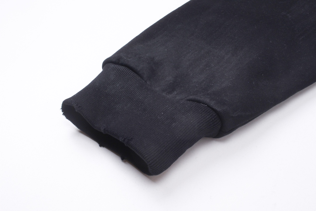面料采用巴黎ZP定织定染全棉大卫衣 克重450克 布面干净 布纹清晰 柔软舒适 螺纹釆用定染无色差 前面图案刺绣采用进口机绣花 章标色系 刺绣和边框走绣 章标磨烂做旧与砖柜一致 成衣水洗做旧 喷绘涂鸦 整件衣服超重工艺还原 巨别市场看图生产 欢迎对比 版型釆用OS宽松落肩版型 男女同款