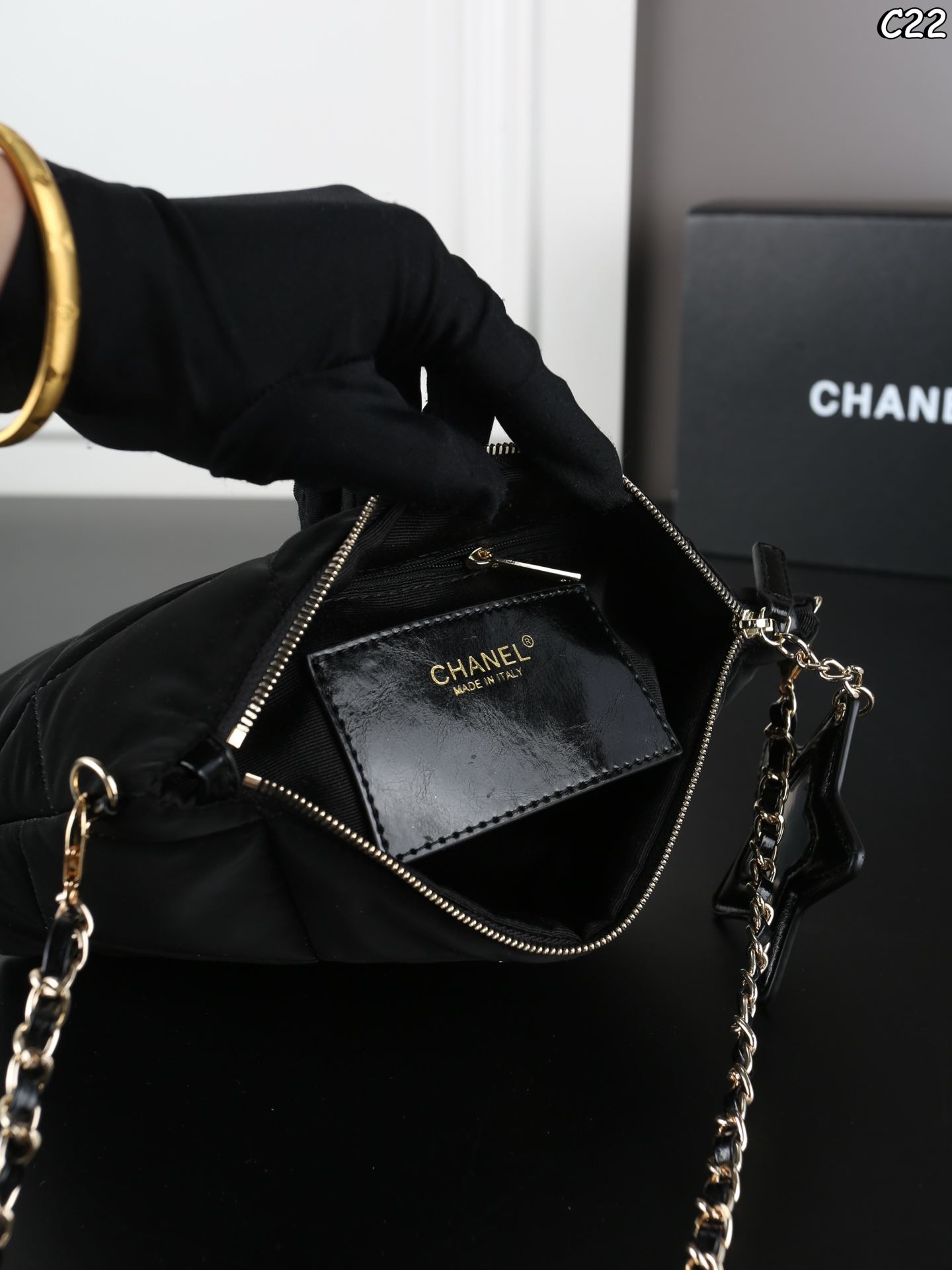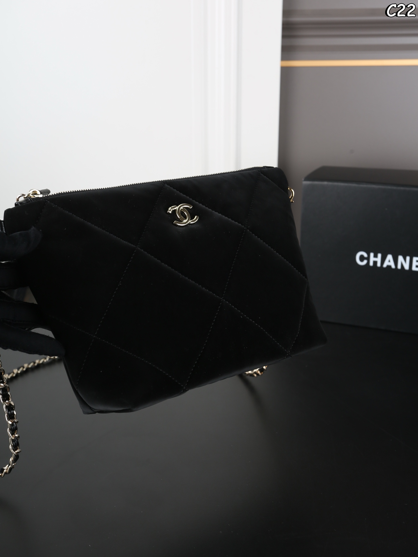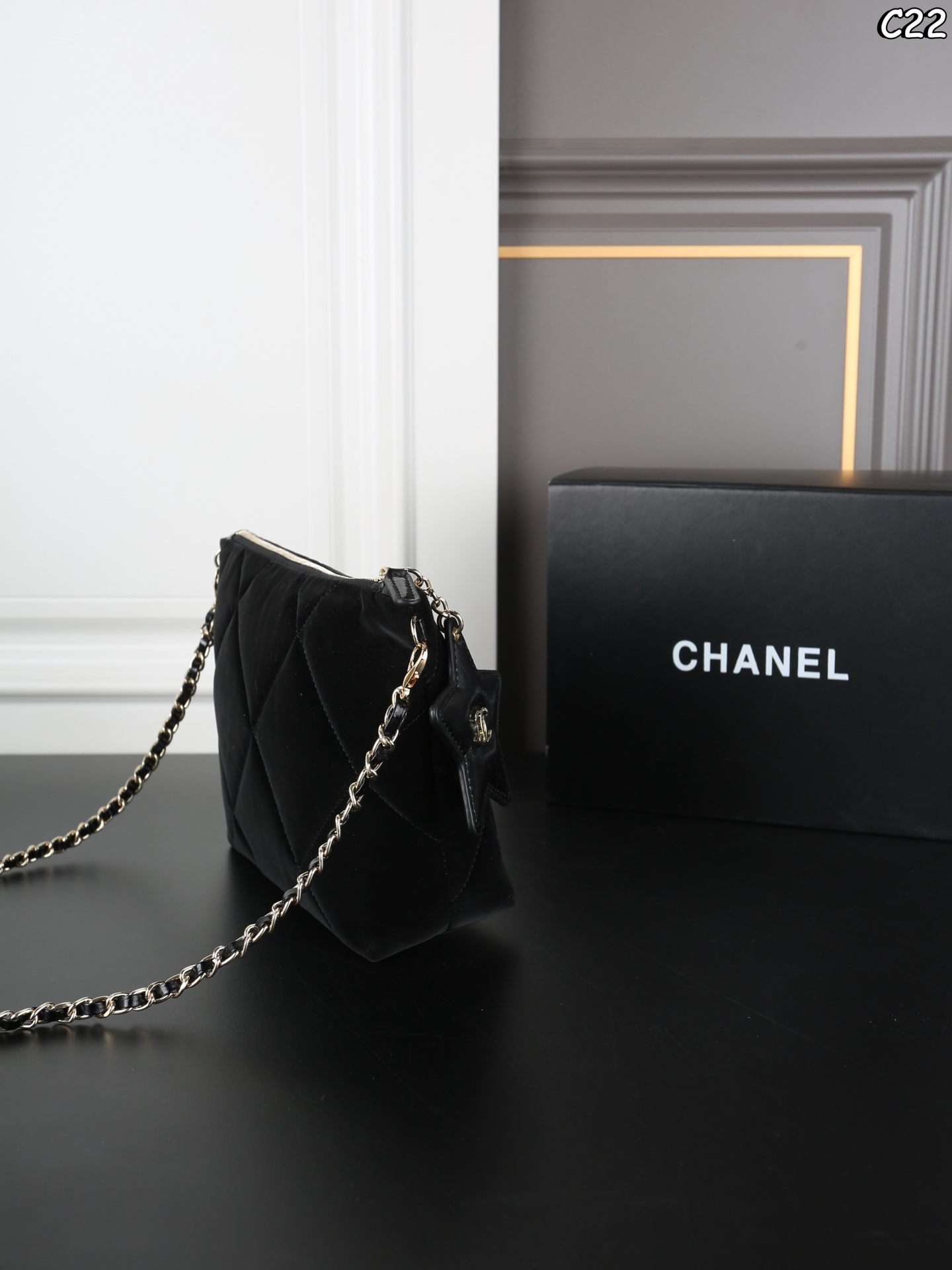 折叠盒 CHANEL香奈儿 丝绒 饭盒包 链条包 一眼爱 包包容量也很NICE 半圆形的月牙包小巧精致 五角星皮质挂件上双𝐜点缀 反过来是一面小镜子 丝绒尼龙的材质很有质感 自重很轻 手感摸起来丝滑软糯 尺寸 19 16