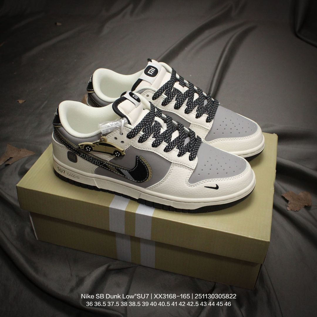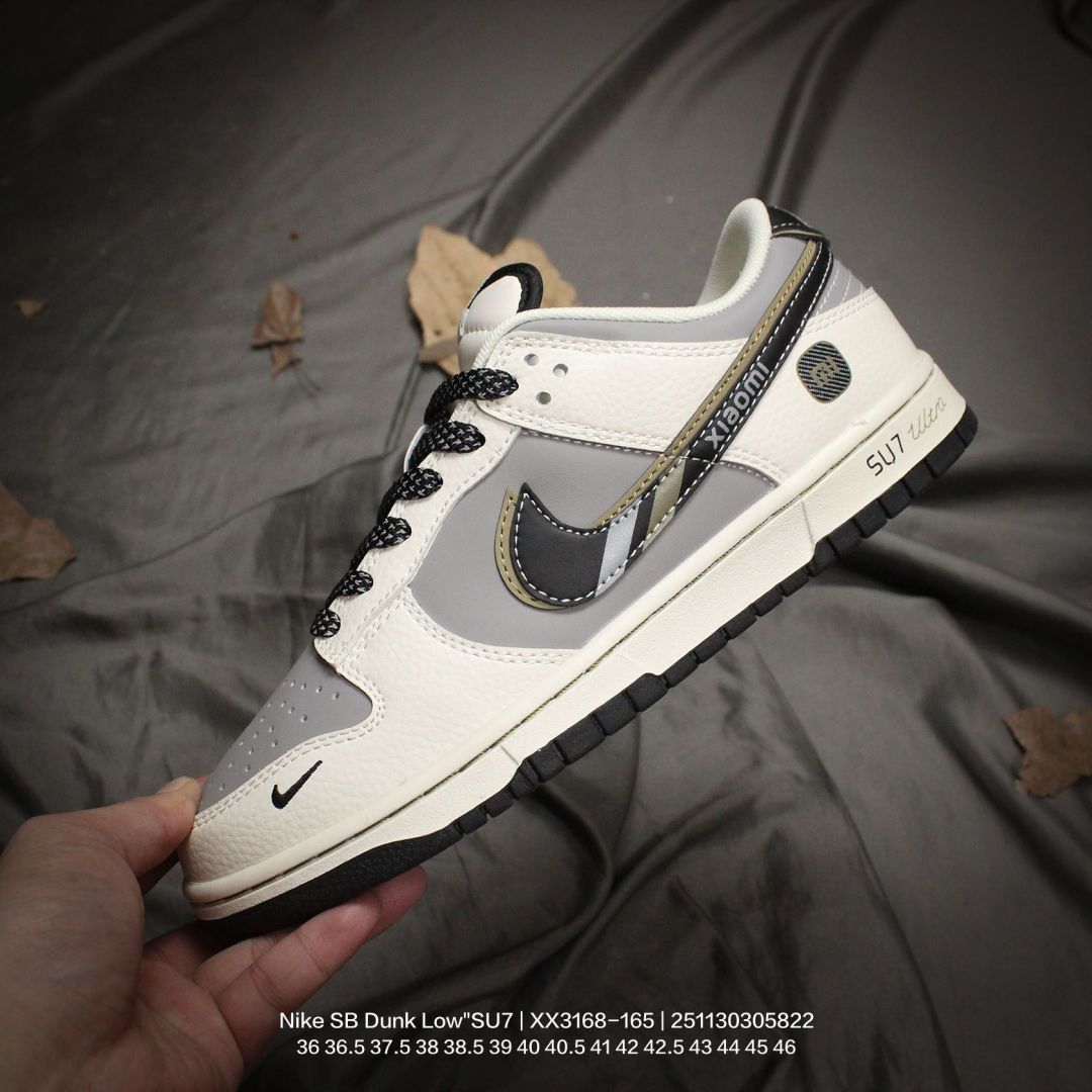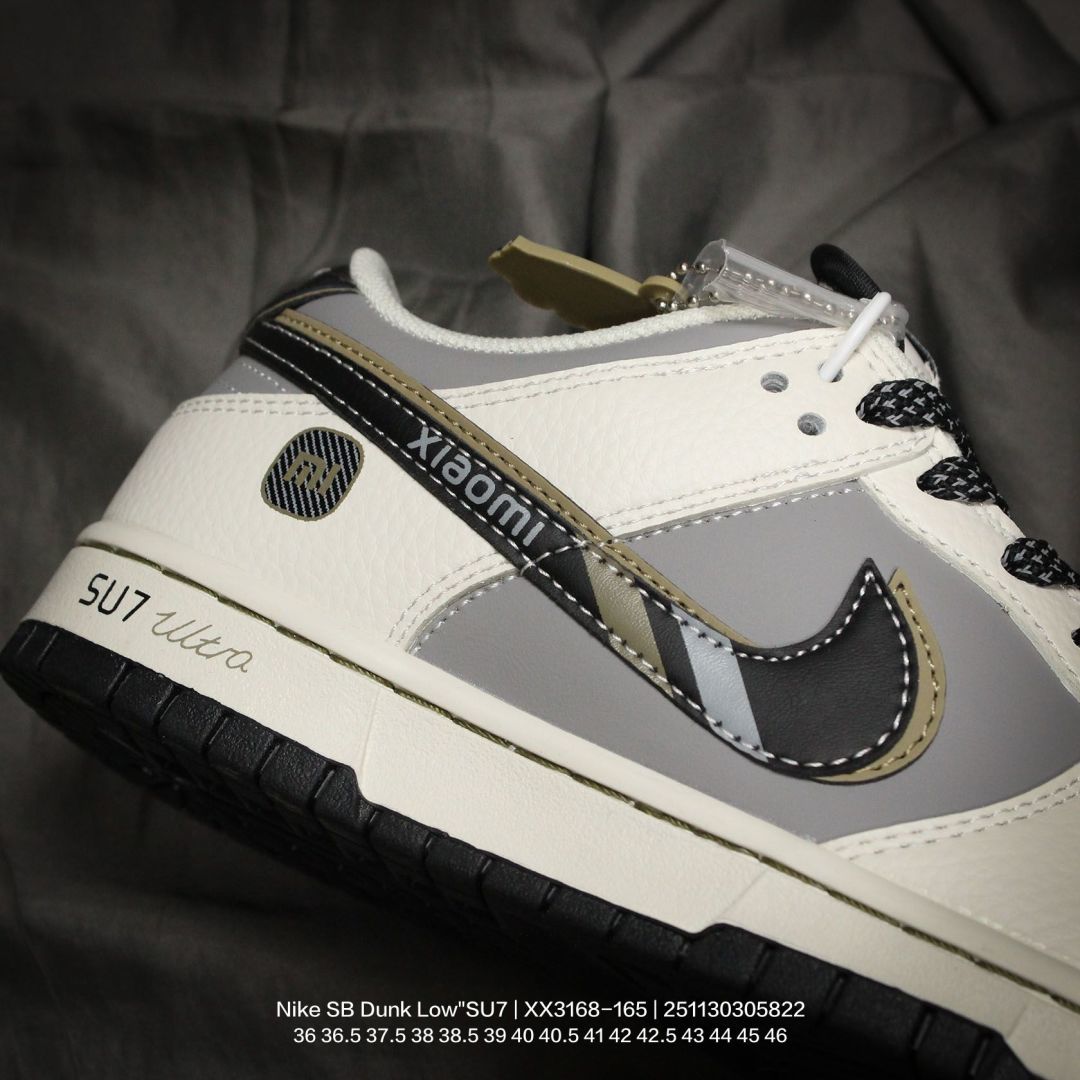 Nike 耐克 男女鞋半码制 更新数据窄楦翘头版型 采用荔枝纹牛剖革组合磨砂革鞋面材质 鞋垫嵌EVA缓震物料 窄版翘头耐磨橡胶大底创意定制小米汽车旗下纯电动轿车SU7 Ultra联名配色 耐克Nike SB Dunk Low SU7 Ultra 扣篮系列低帮休闲运动滑板板鞋 米白灰黑红小米汽车涂鸦 XX3168 165