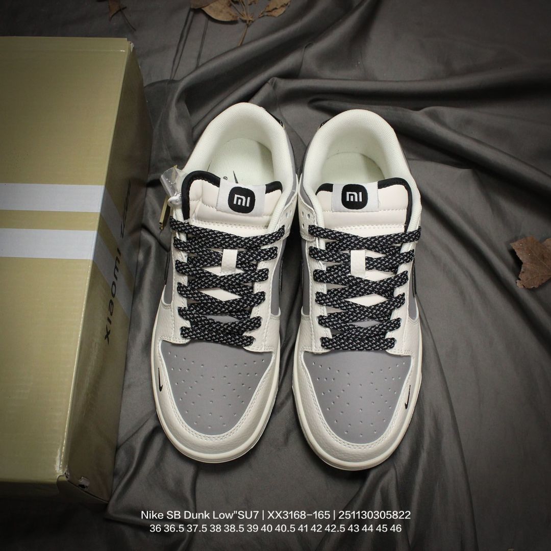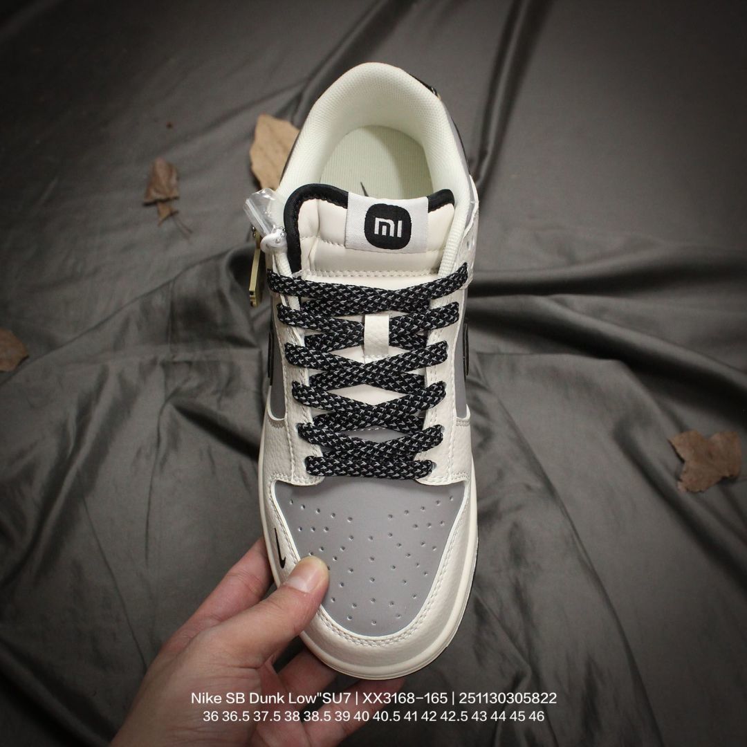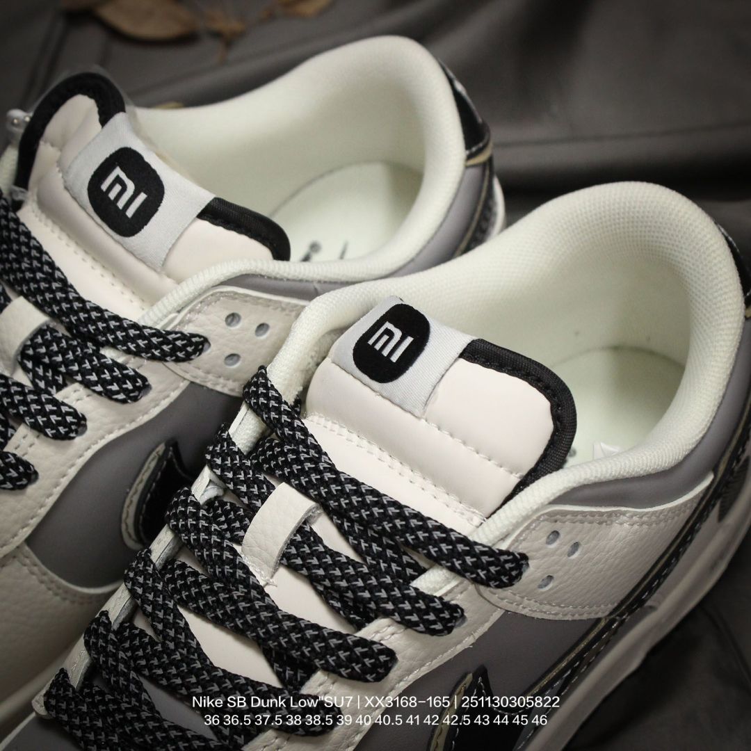 Nike 耐克 男女鞋半码制 更新数据窄楦翘头版型 采用荔枝纹牛剖革组合磨砂革鞋面材质 鞋垫嵌EVA缓震物料 窄版翘头耐磨橡胶大底创意定制小米汽车旗下纯电动轿车SU7 Ultra联名配色 耐克Nike SB Dunk Low SU7 Ultra 扣篮系列低帮休闲运动滑板板鞋 米白灰黑红小米汽车涂鸦 XX3168 165