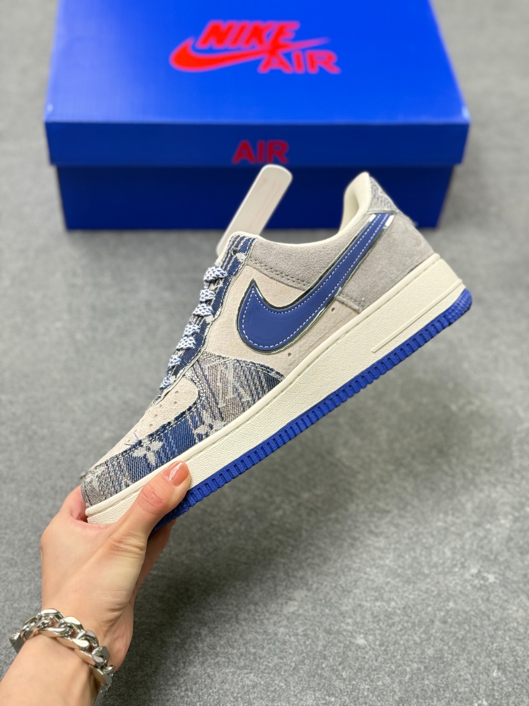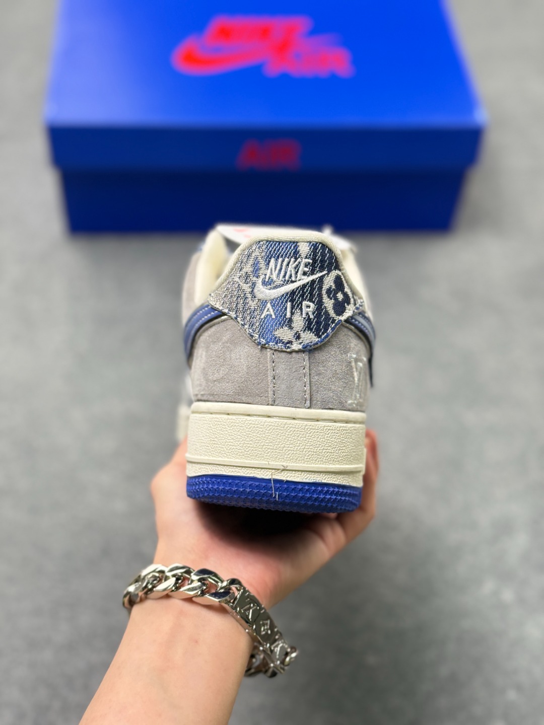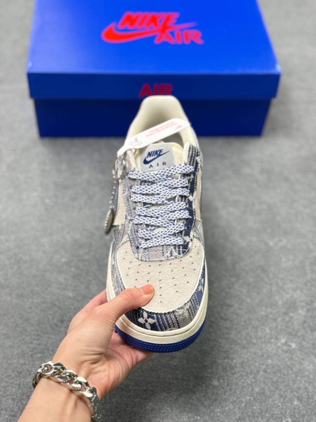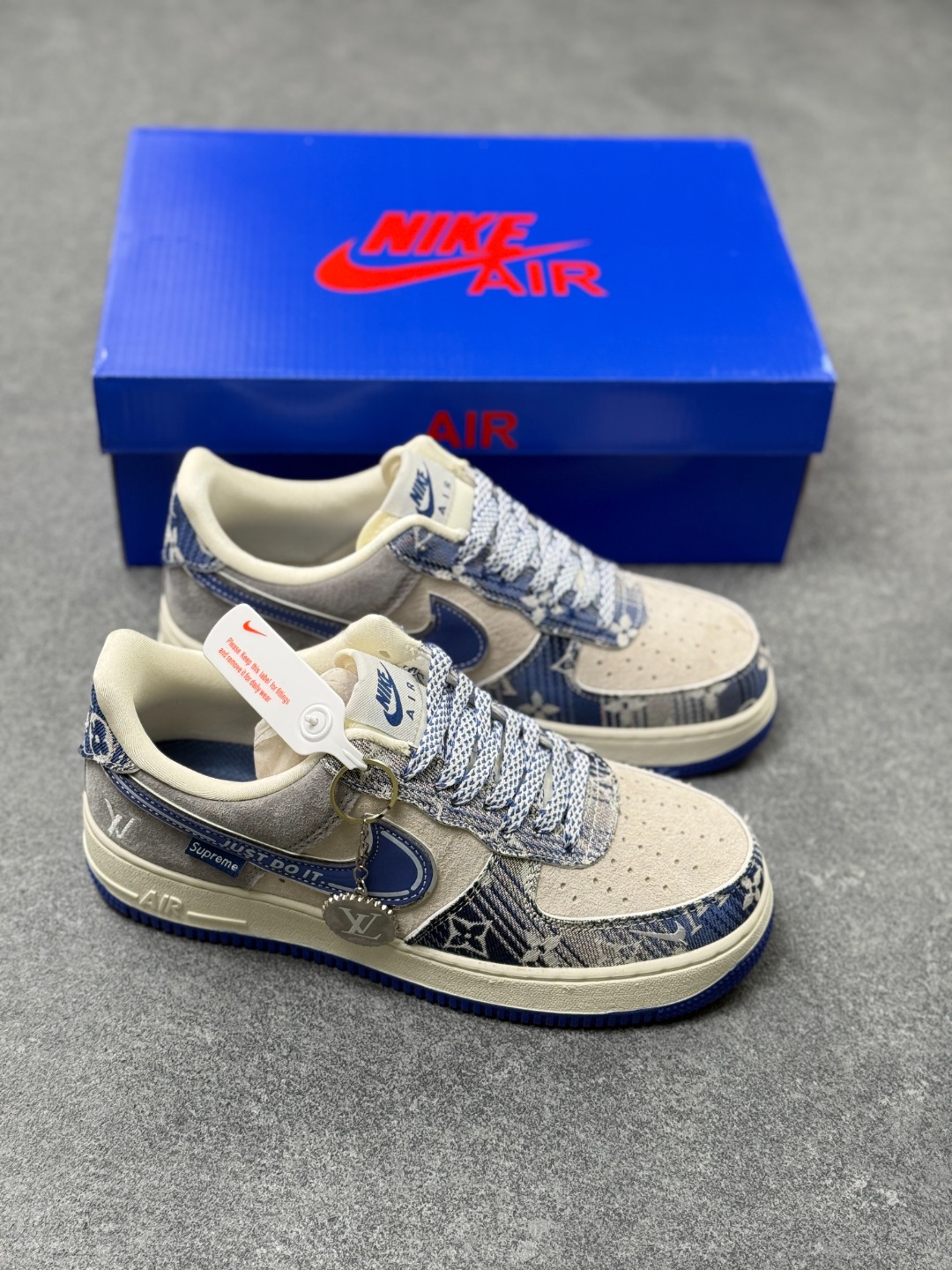 奢潮碰撞天花板 AF1 低帮单宁老花款重塑经典 当 Nike Air Force 1 Low 的经典鞋型遇上奢牌老花与街头单宁 SY1388 031 款直接把潮流层次感拉满 灰调麂皮的细腻质感 搭配丹宁老花布料的拼接设计 宝蓝色 Swoosh 勾边缀着 JUST DO IT 标语 侧边暗藏的潮流标识与 LV 字母刺绣 让奢牌基因和街头文化完美融合 米白中底搭配宝蓝外底的撞色 延续 AF1 标志性的 Air 气垫脚感 既是对经典的颠覆再造 也是潮人鞋柜里的收藏级狠货 上脚即解锁奢潮混搭的高阶玩法 走在街头 轻松成为焦点