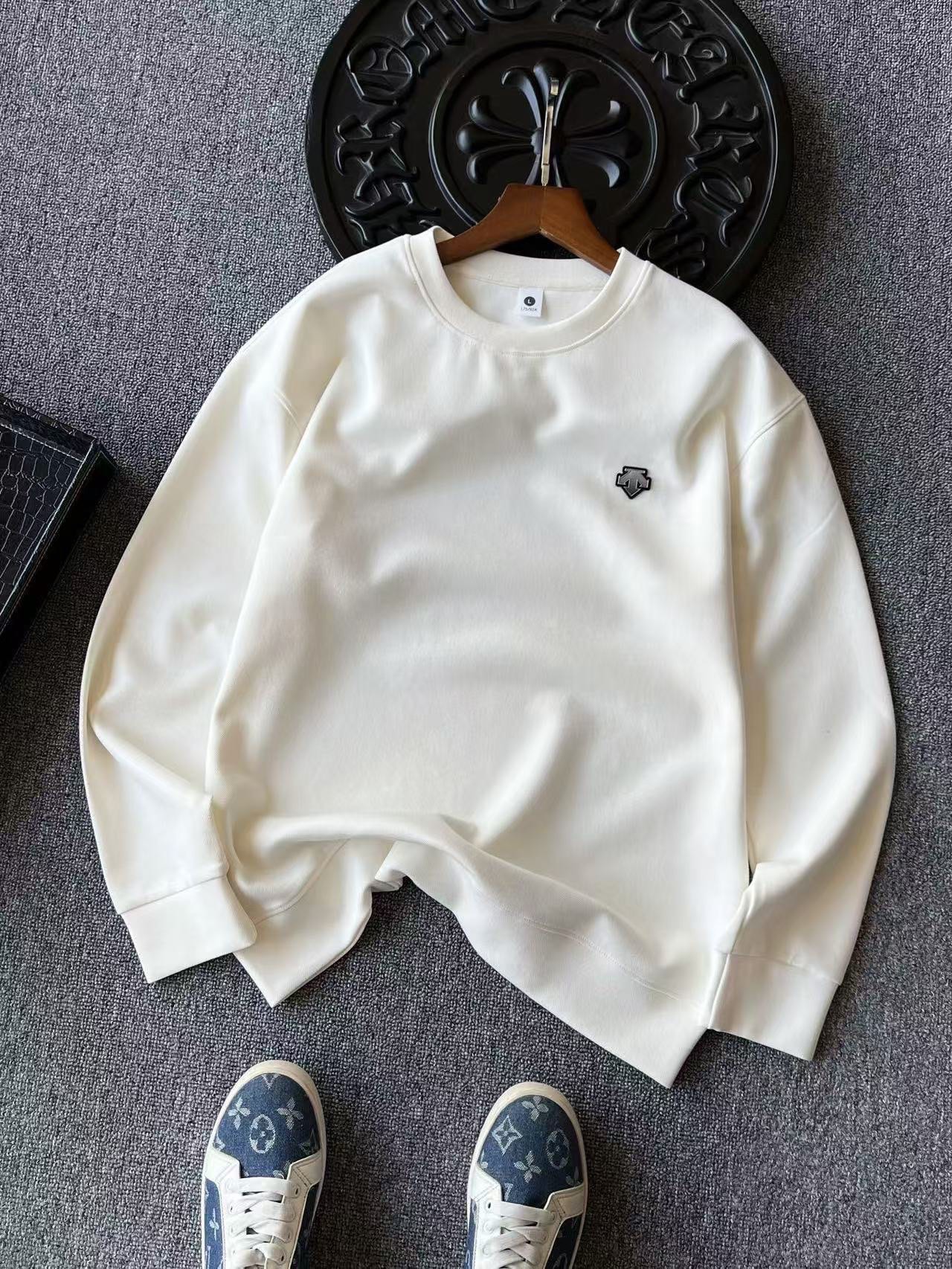 细节细节再细节 DESCENTE家专柜新品高奢圆领卫衣 全身精致简约 纯正牛奶白 高级黑 摩卡 水泥灰配色 胸前亚格力钨钢金属迪桑特T标 轮廓镶嵌硅胶环绕 十分精致 所有拼接接缝处全部做了双针压线 精湛做工天花板