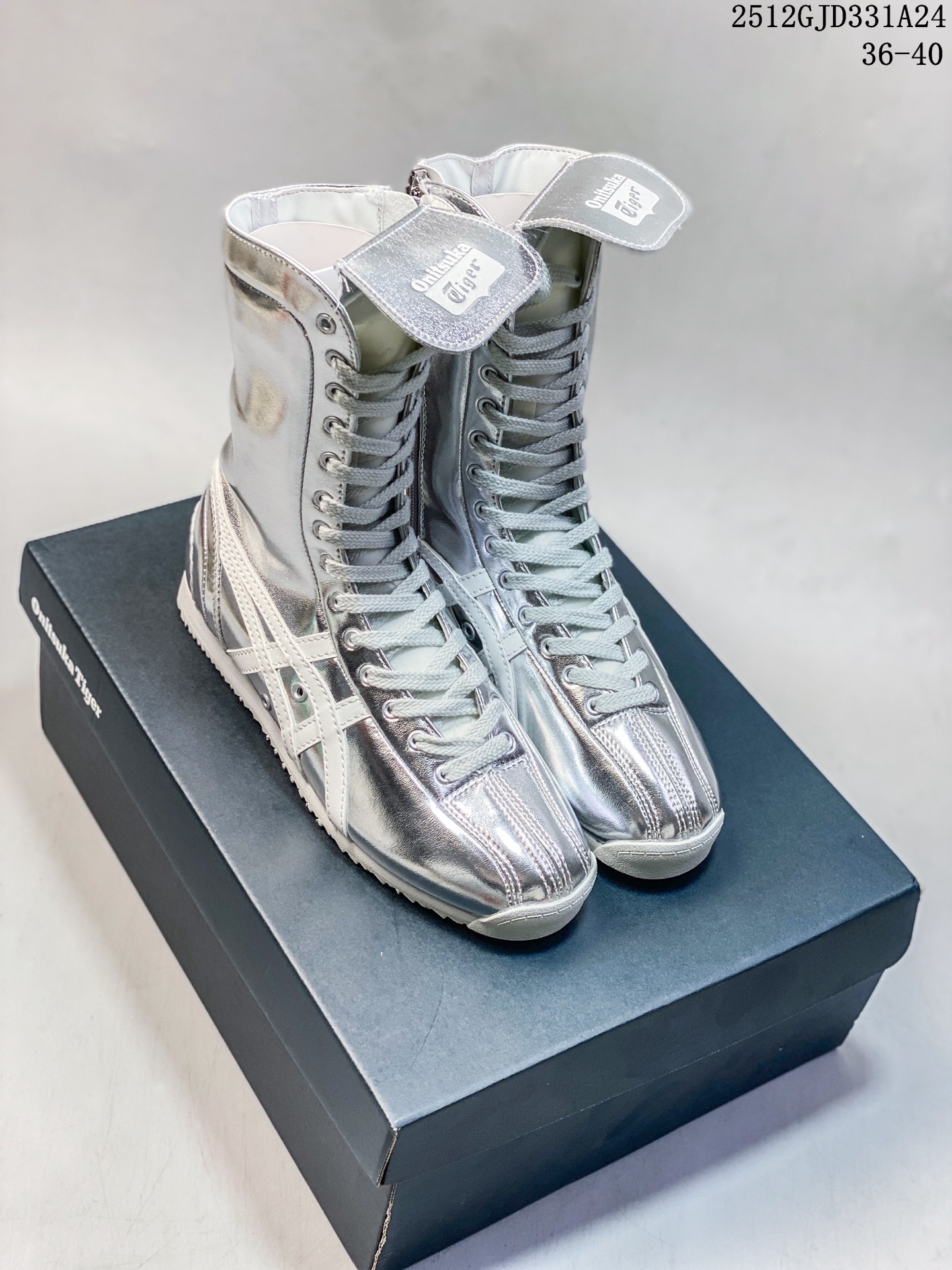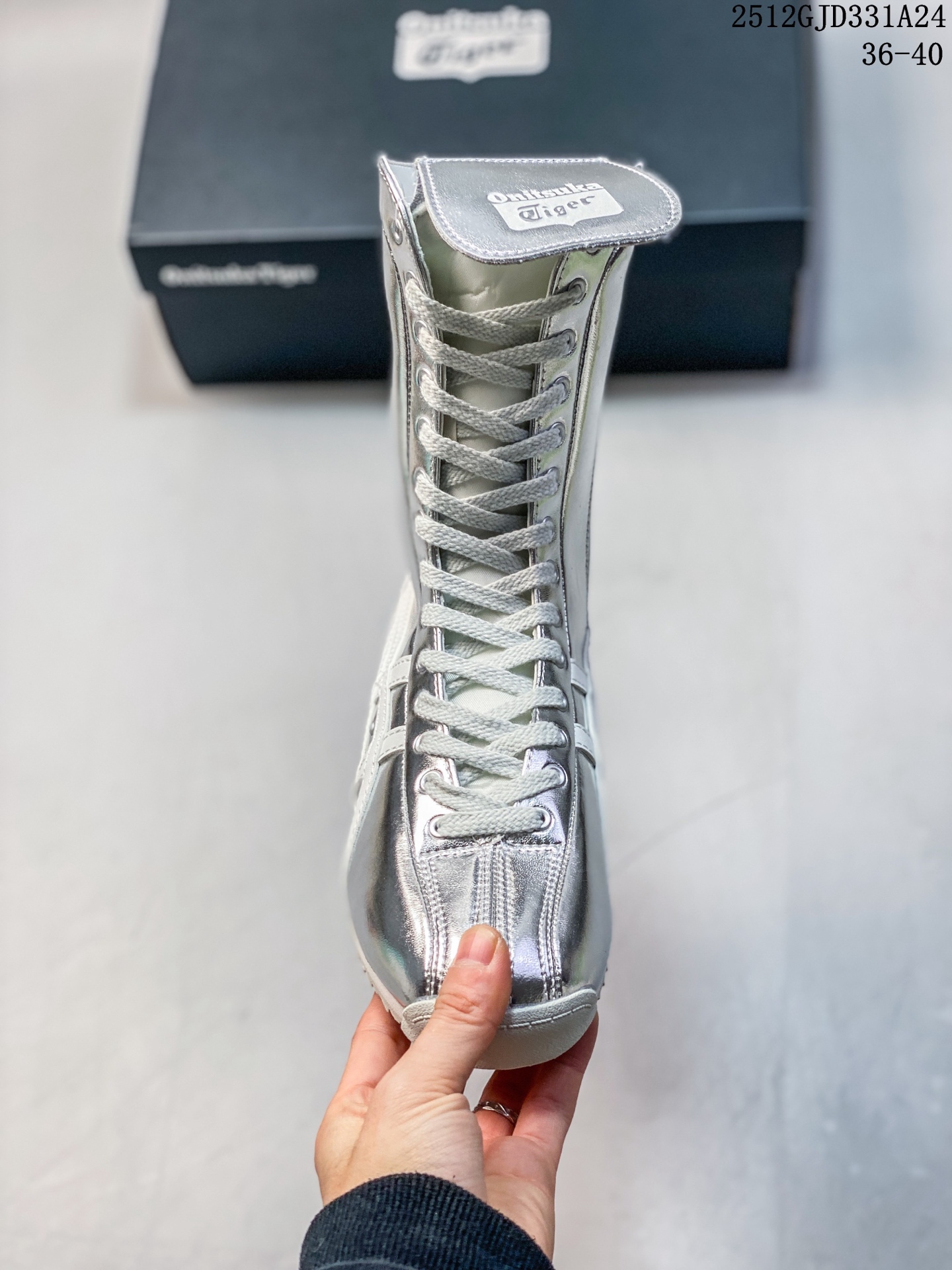 新品公司级 Onitsuka Tiger鬼冢虎女鞋 MEXICO 66 BOXING 新款运动时尚高帮情侣款休闲鞋MEXICO 66 BOXING女士高帮靴 黑色 PURE SILVER OFF WHITE MEXICO 66修长的靴筒线条是视觉核心 既保留了拳击靴的飒爽姿态 又通过柔和的鞋口弧度贴合小腿曲线 上脚后能自然修饰腿部比例 让利落感与舒适度同时在线 鞋身贯穿的精细缝线更是暗藏工艺巧思 每一道走线都清晰规整 既加固了鞋型结构 又以灵动的线条感打破纯色靴身的沉闷 让复古轮廓更具层次 高帮鞋款通常采用牛皮革或头层皮作为鞋面材质 搭配橡胶鞋底 具有良好的耐磨性和回弹效果 其设计兼顾复古与时尚 适合多种穿搭场景 如通勤 休闲等