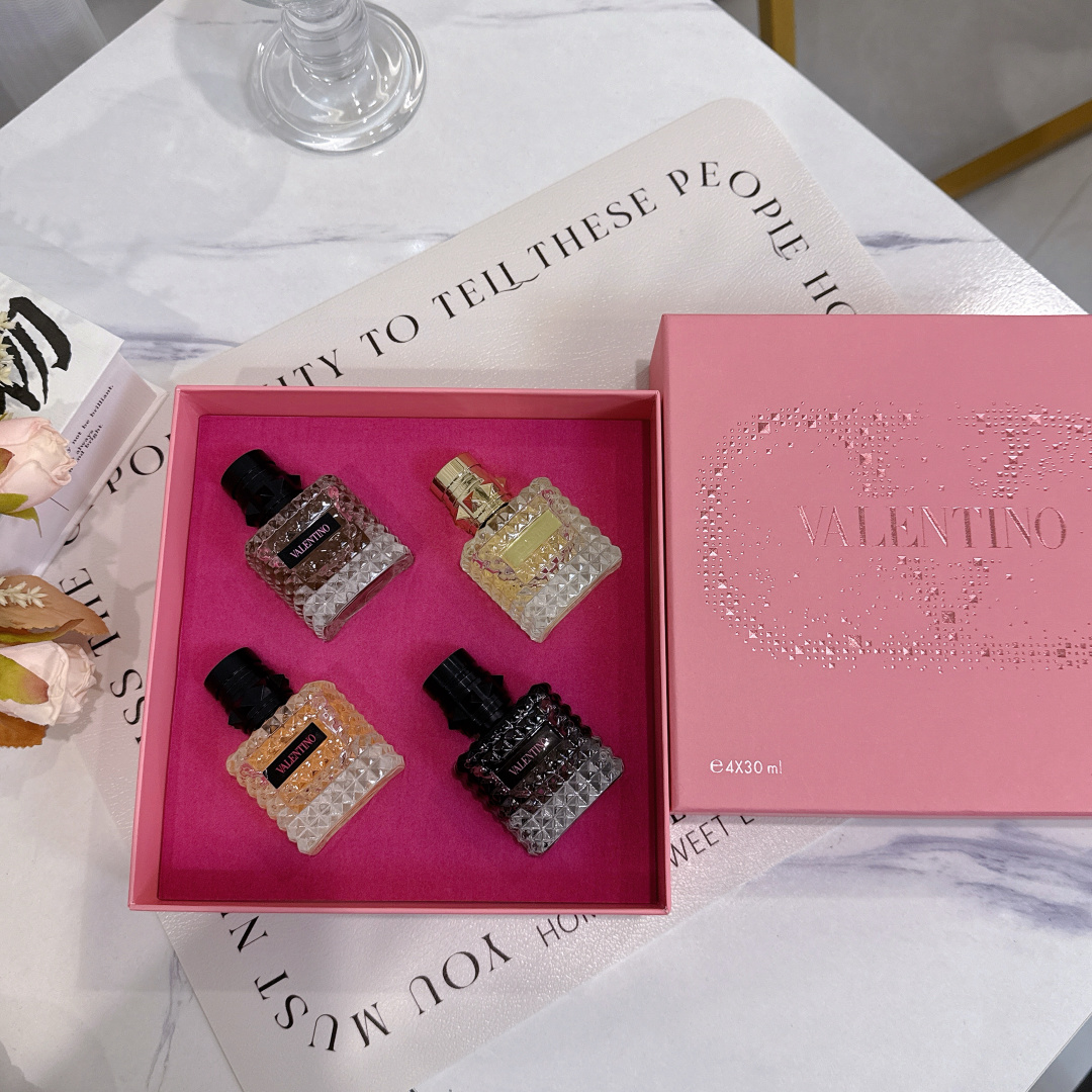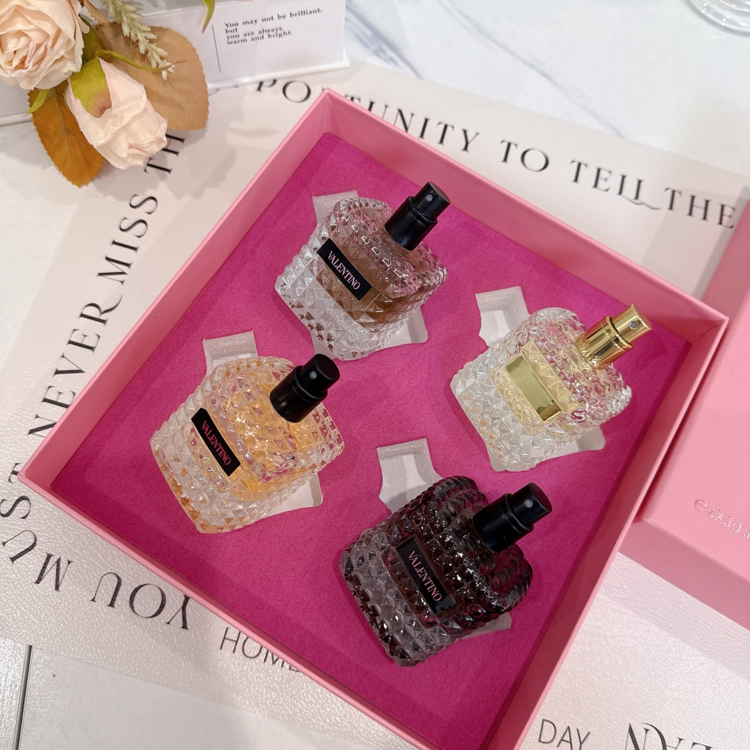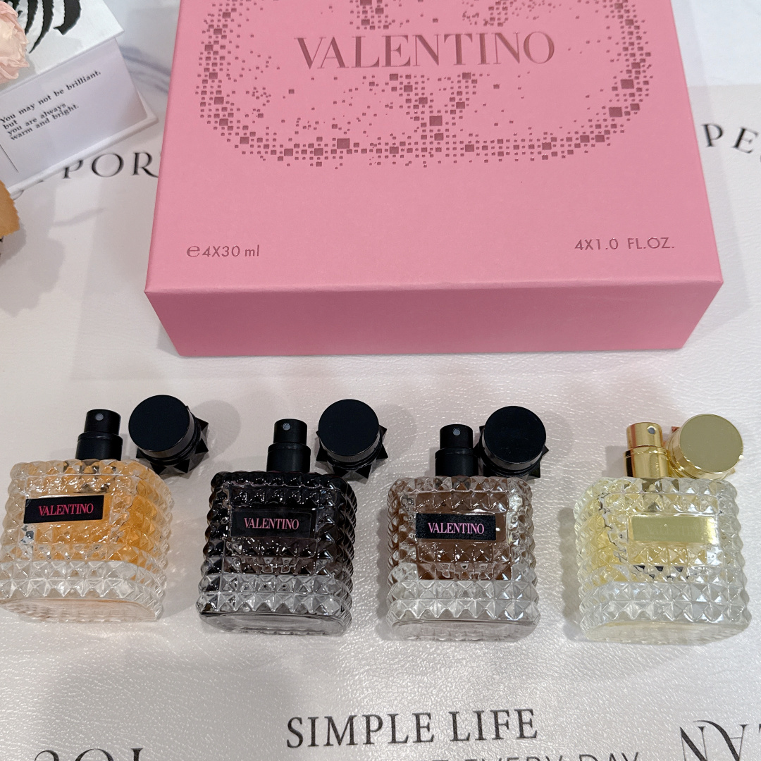 华伦天奴香水四件套宝子们 今天必须给大家分享超绝的华伦天奴香水套装 瞧瞧这颜值 每一瓶香水的瓶身都像是精心雕琢的艺术品 切割面犹如钻石般闪耀 摆在家里 就是精致生活的象征 金色瓶盖的那瓶 带着与生俱来的高贵感 喷上它 你就是人群中最耀眼的女王 而另外三款不同色调的香水 从深邃神秘到温暖柔和 每一款都蕴含着独特的魅力